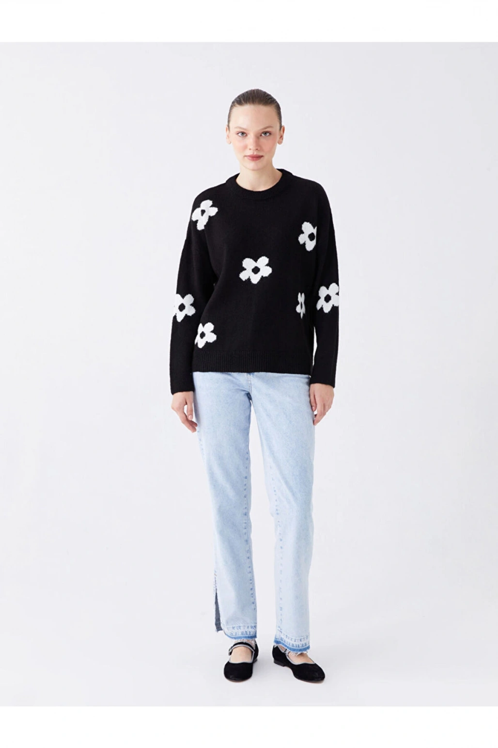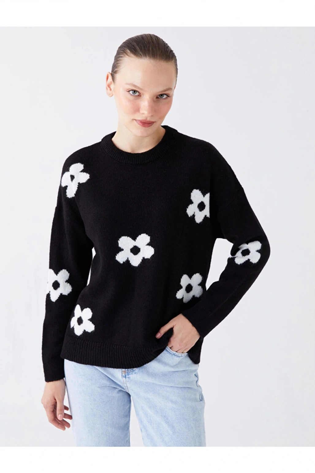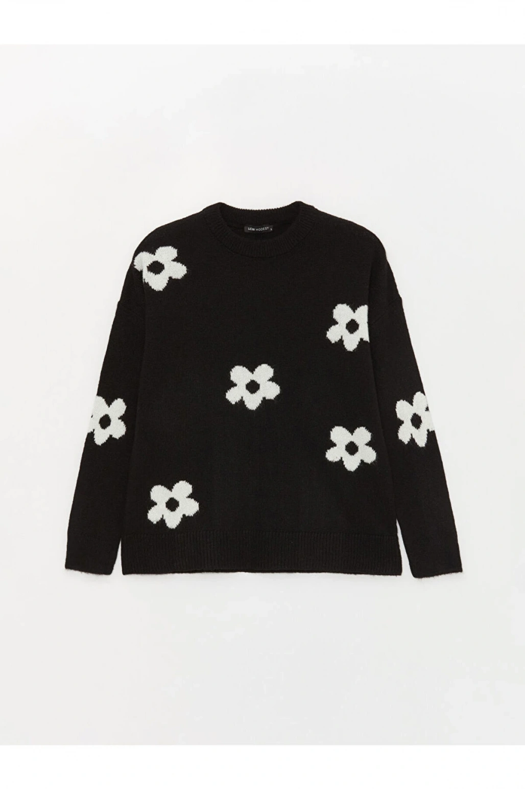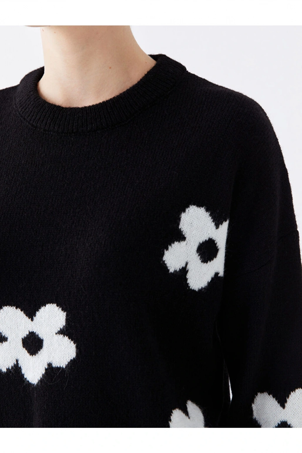 Bisiklet Yaka Çiçekli Uzun Kollu Oversize Kadın Triko Kazak