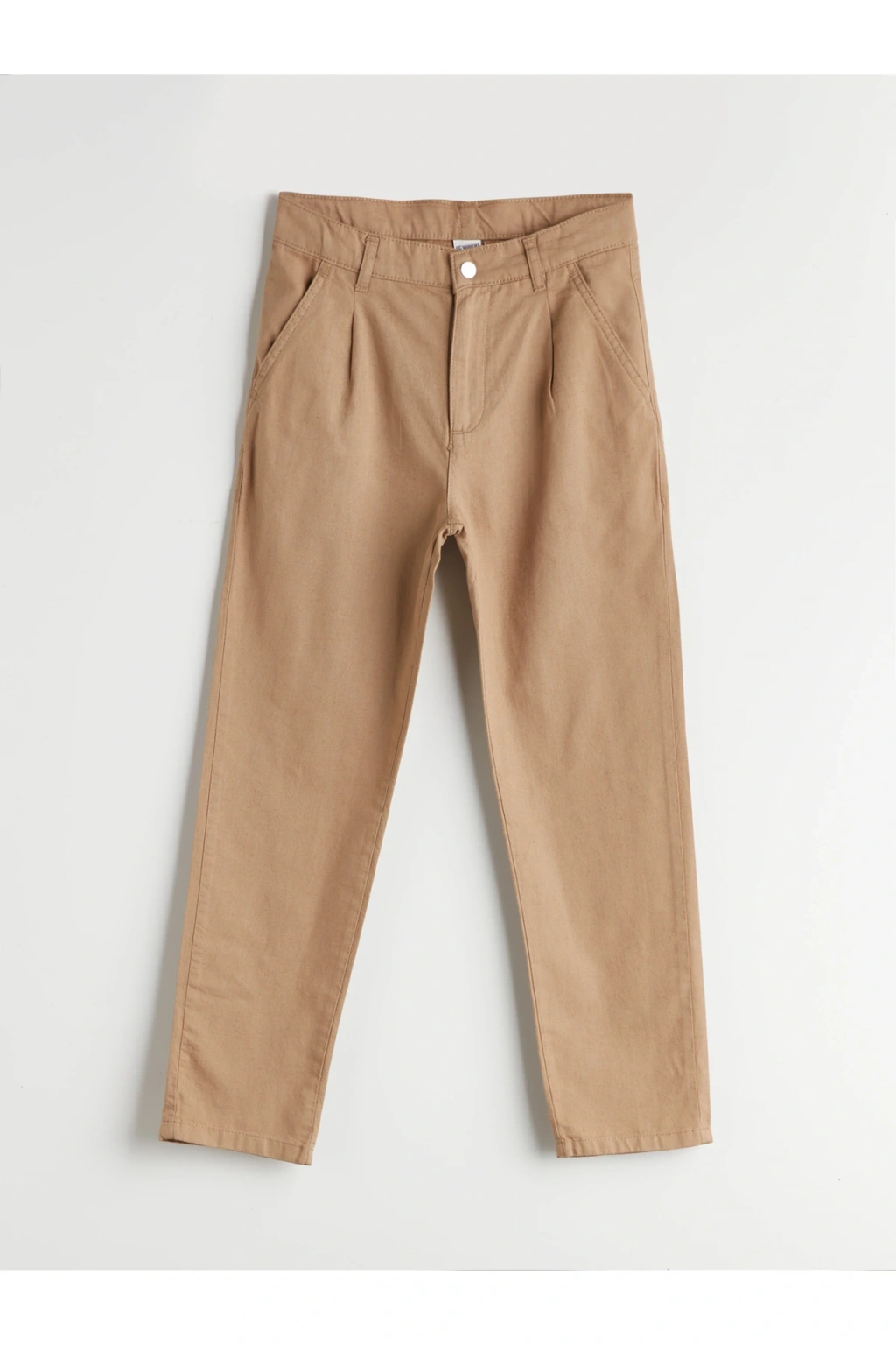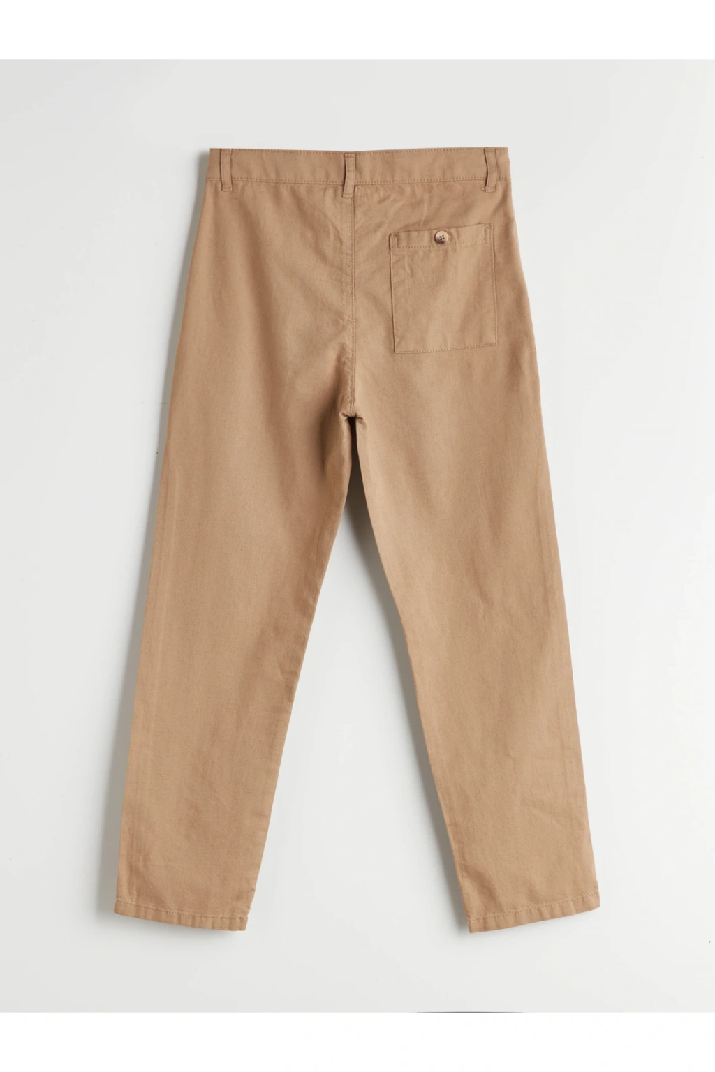 Keten karışımlı kumaştan üretilmiş, cepli, beli içten lastikli pantolon.