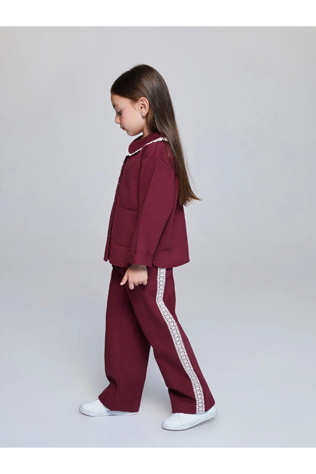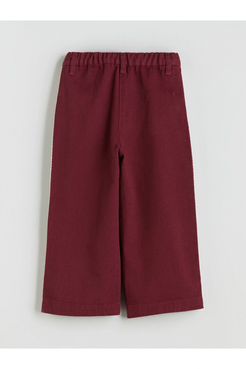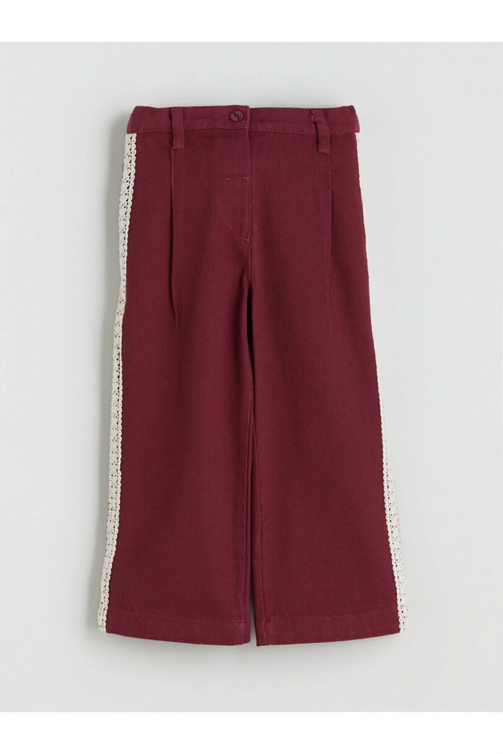 Standart kalıp kız çocuk pantolon, yanları dantel şeritlidir.; Geniş paçalı, önü pilili model, düğme ve fermuar kapamalıdır.