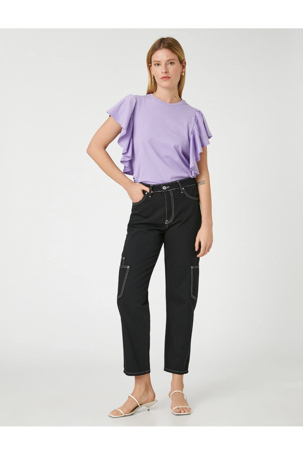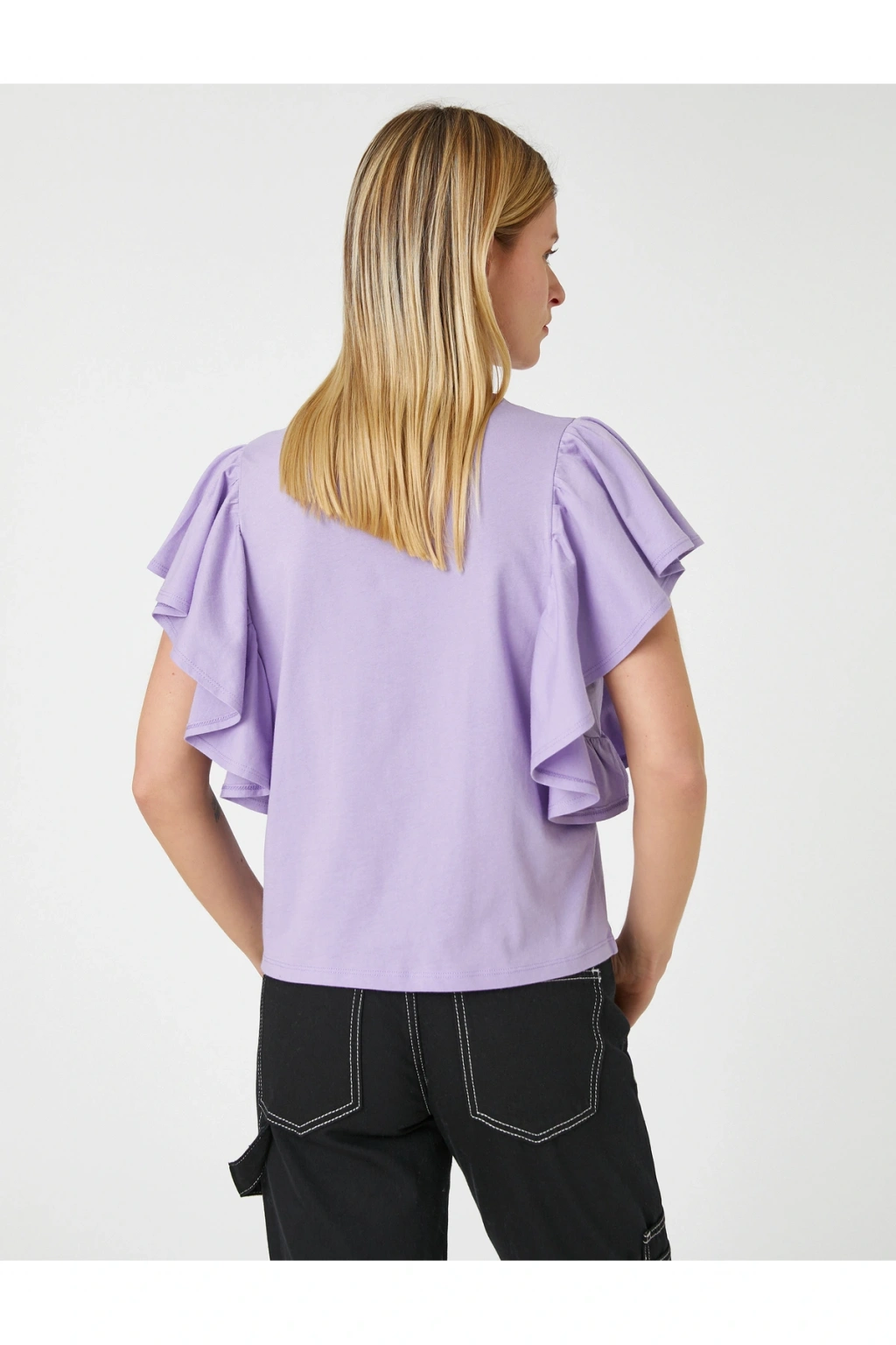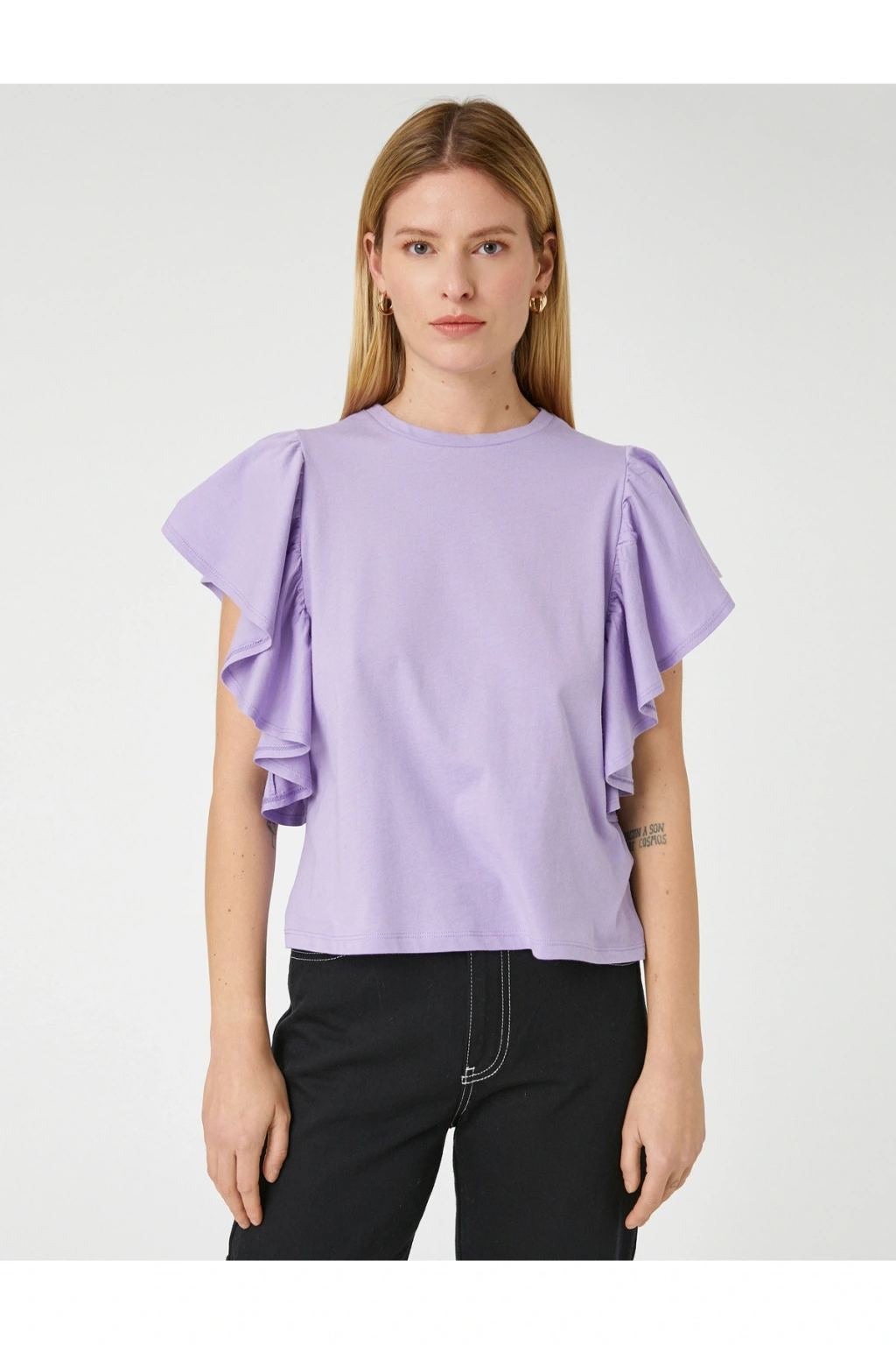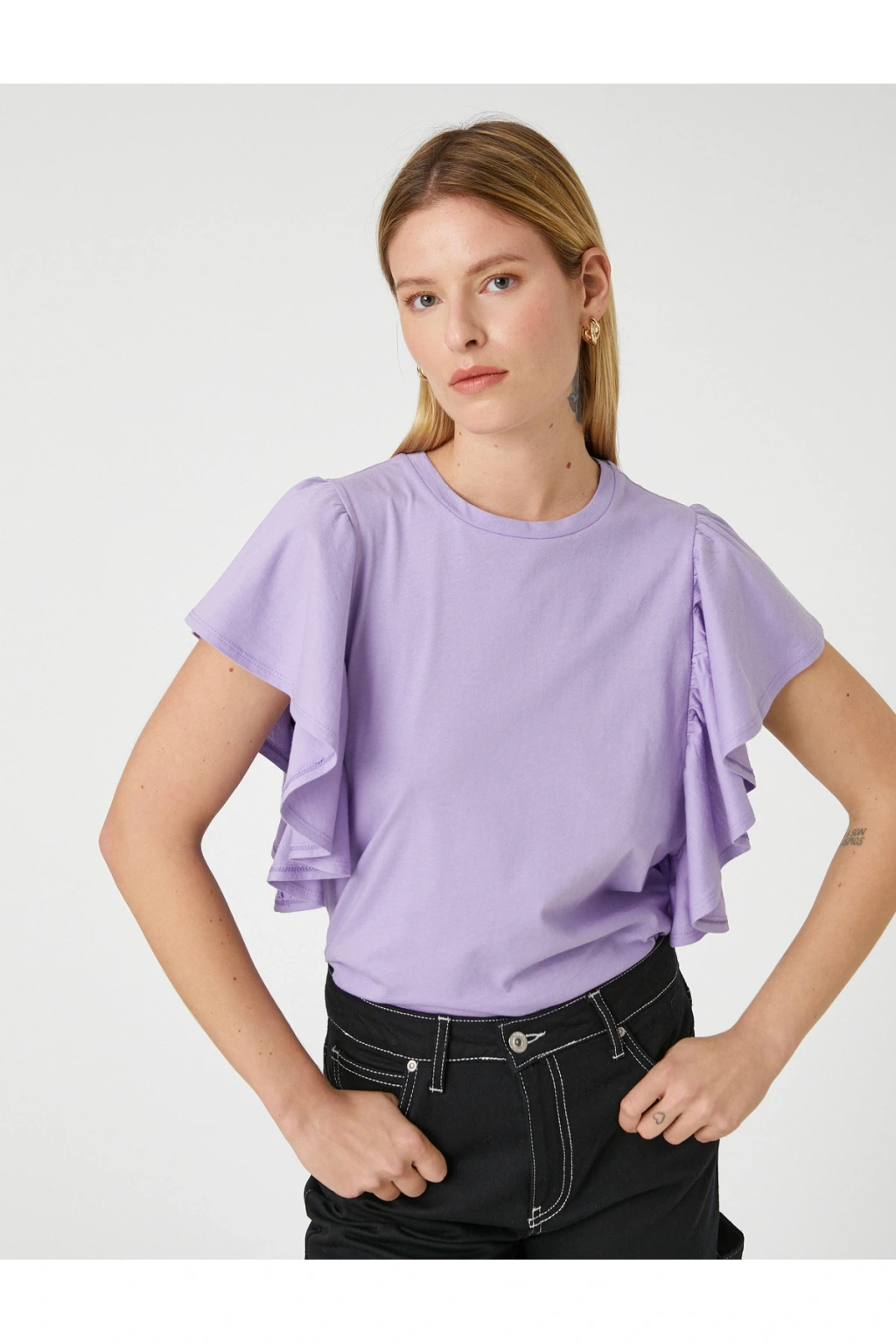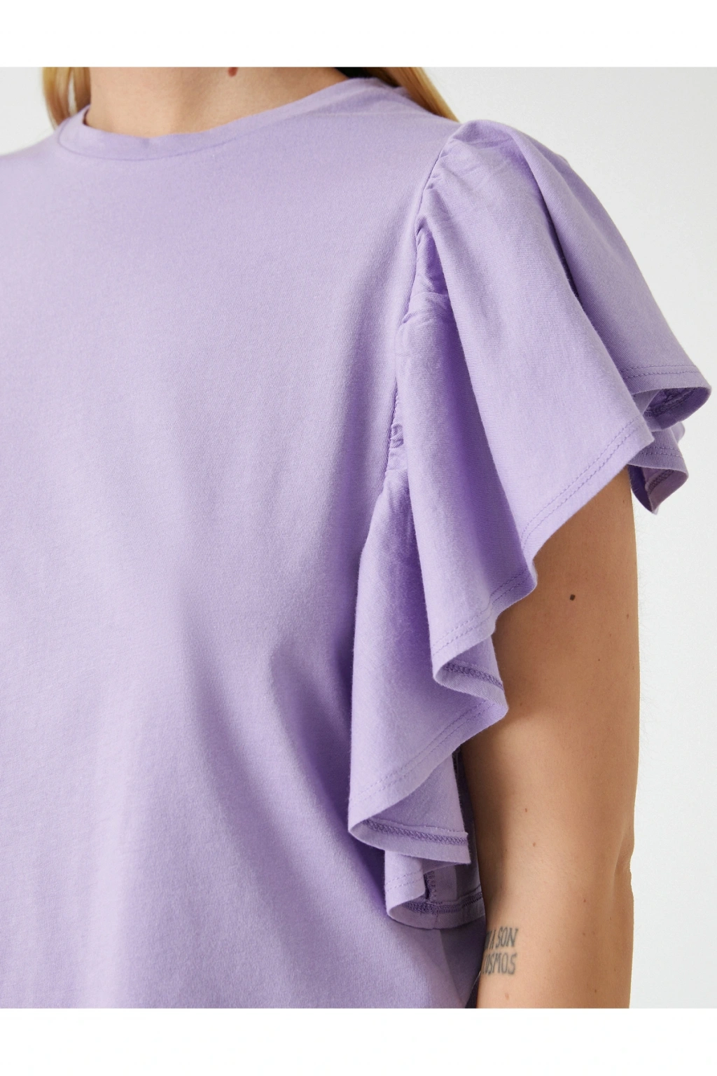 Tek başına anahtar bir görünümün parçası olan bisiklet yaka, kısa kollu, kolları volanlı pamuklu tişört dinamik stilinize havalı bir dokunuş sağlıyor.; | Model Boy: 177 | Model Kalça: 90 | Model Üst: 62 | Model Bel: S | Model Göğüs: 81 | Model Jean: 27/32