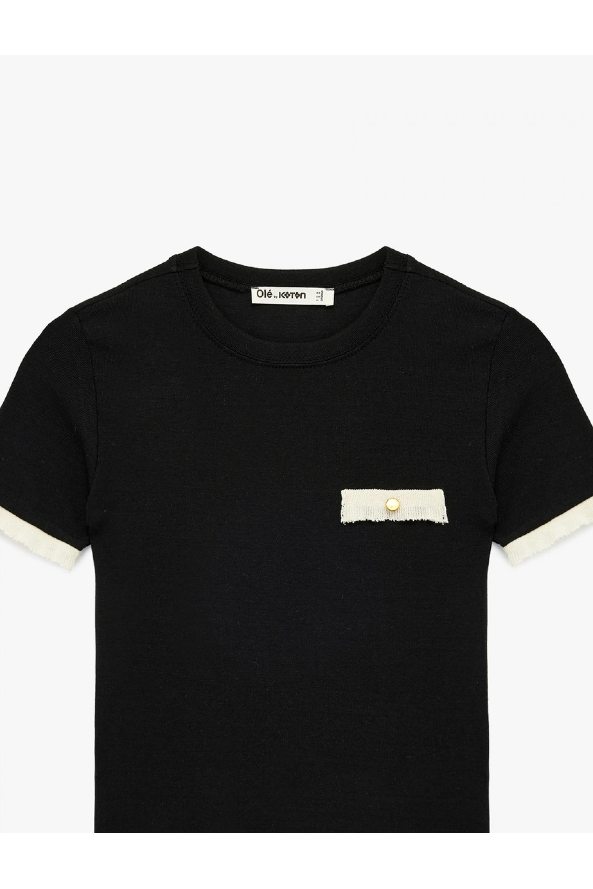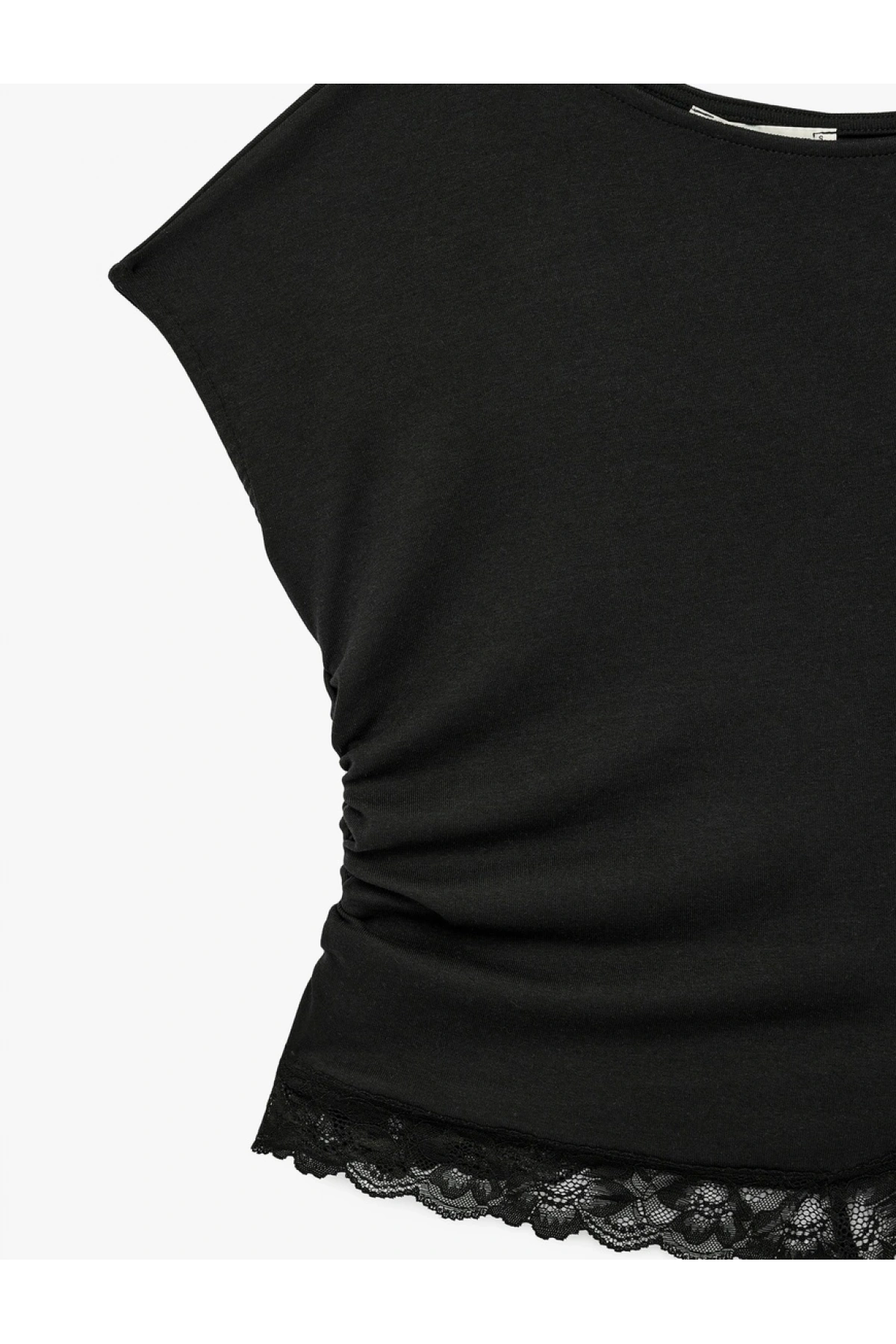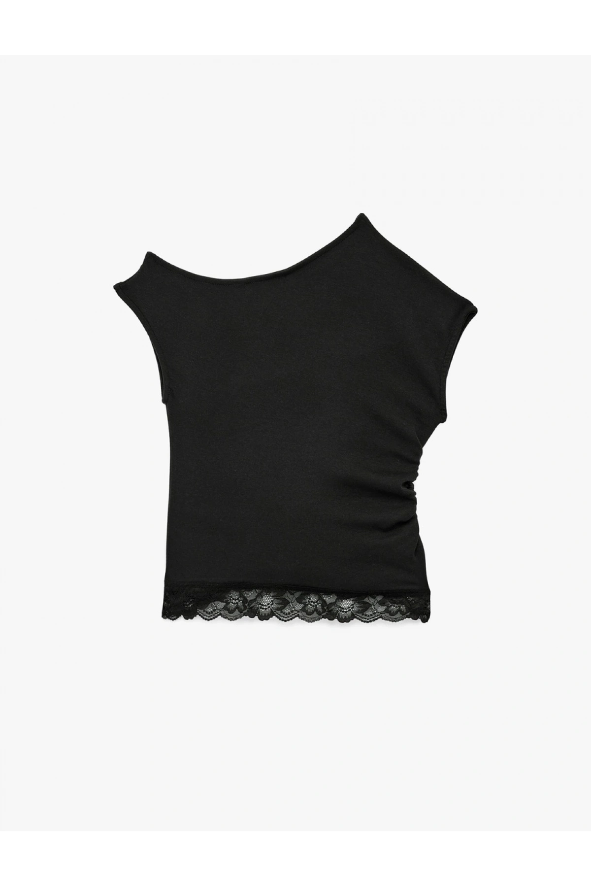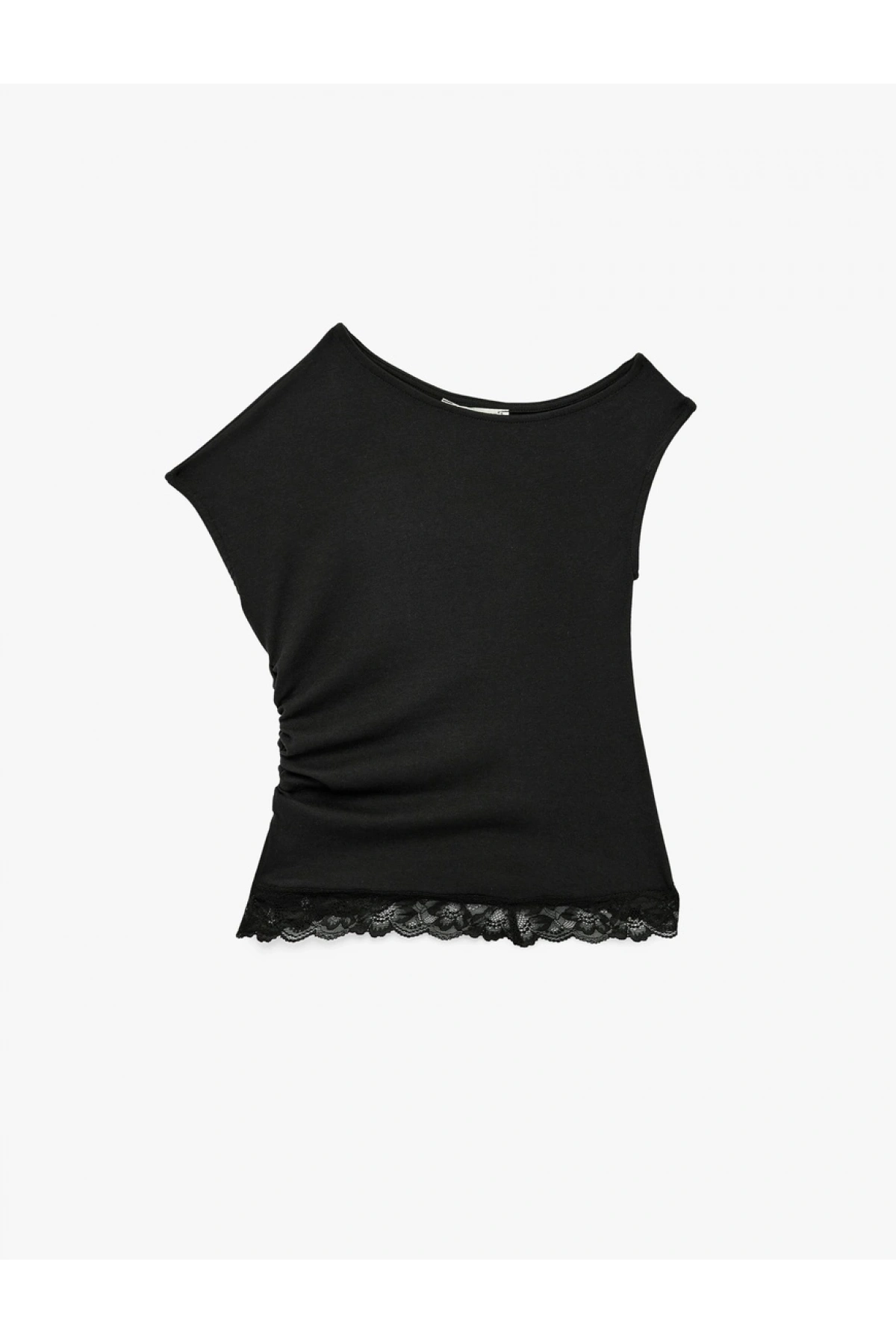 Koton Dantel Detaylı Kısa Kollu Asimetrik Yaka Drapeli Omzu Açık Tişört