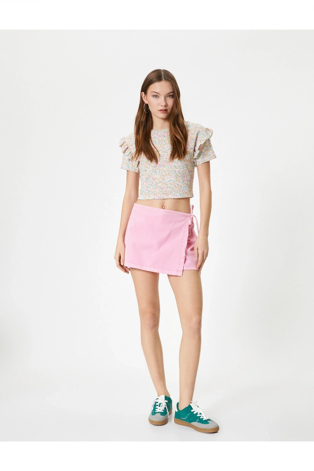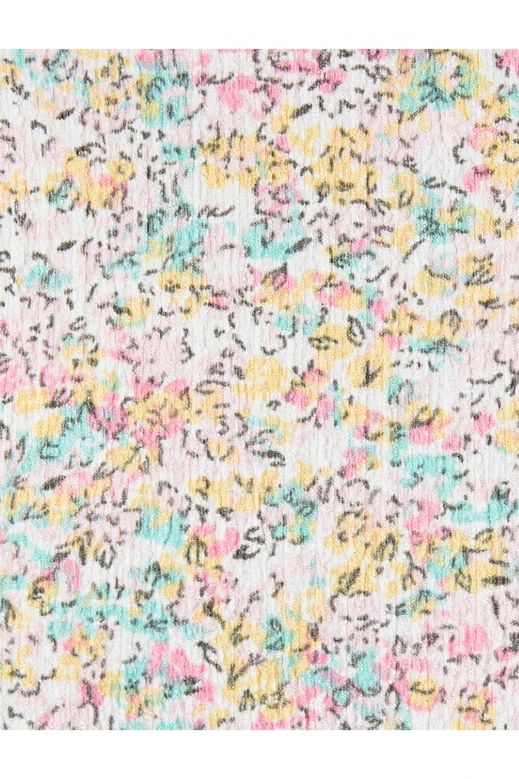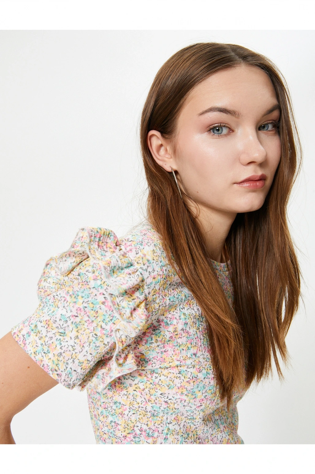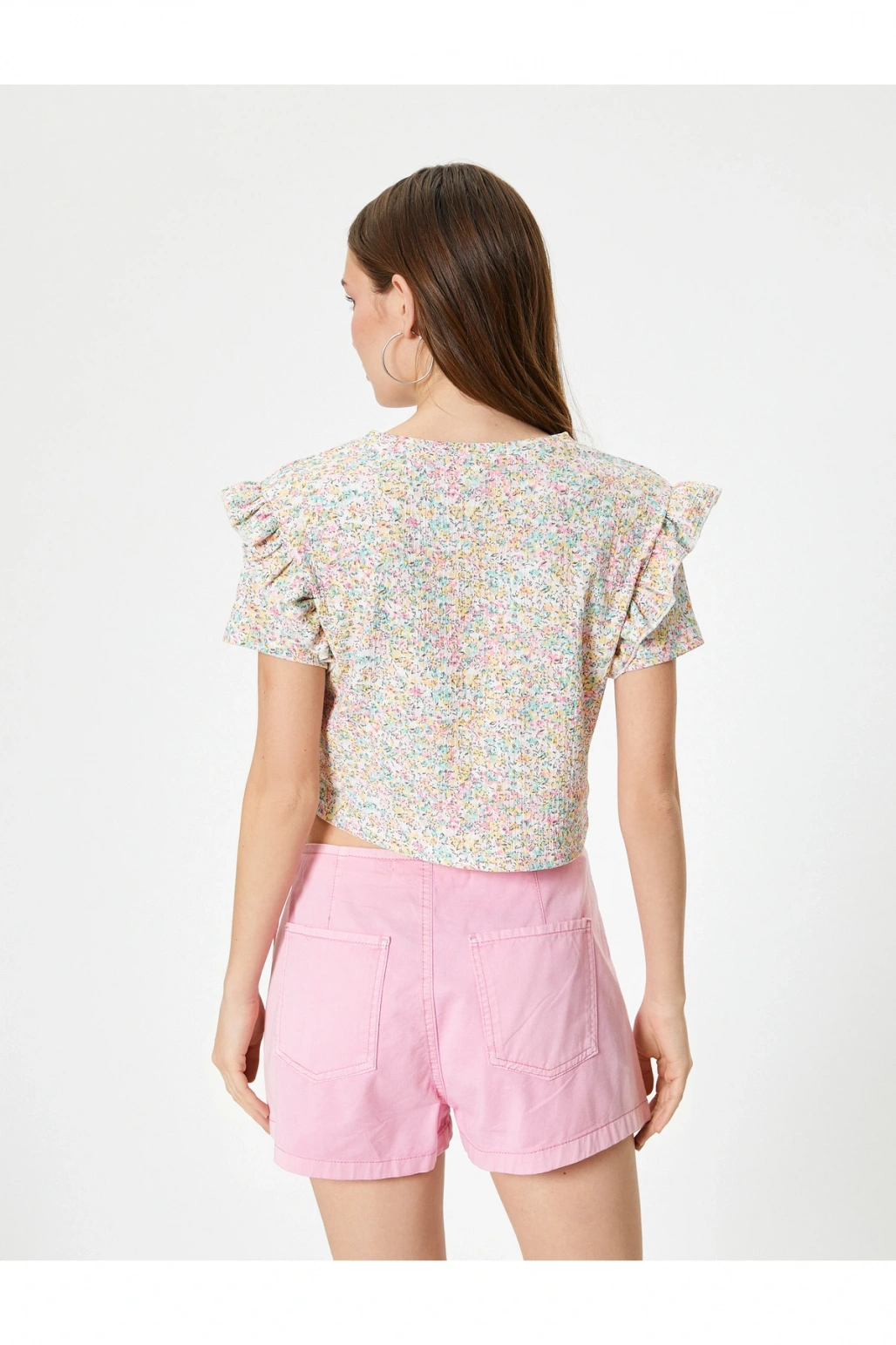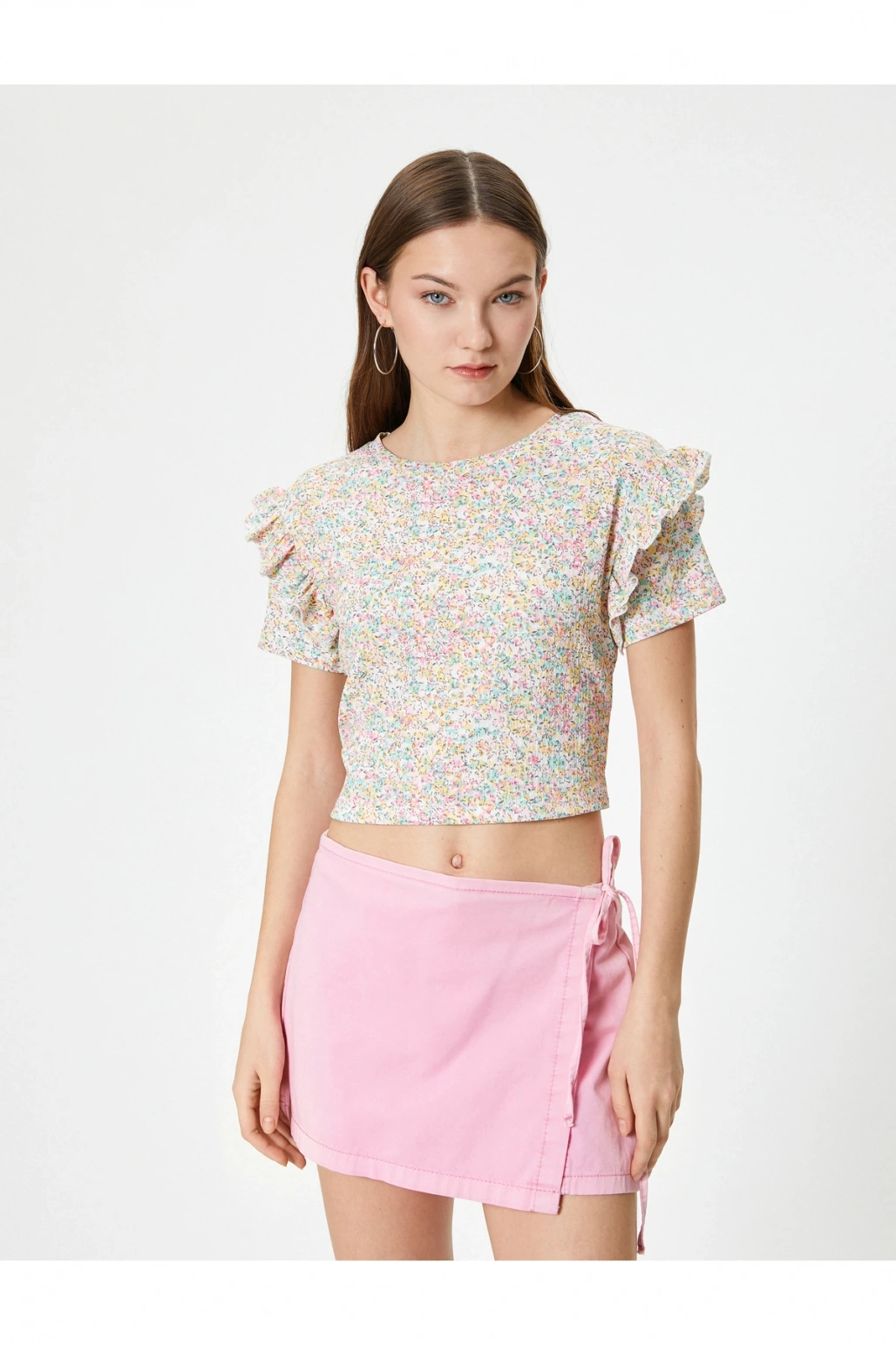 Çiçekli Fırfırlı Tişört Kısa Kollu Bisiklet Yaka Dokulu Bürümcük