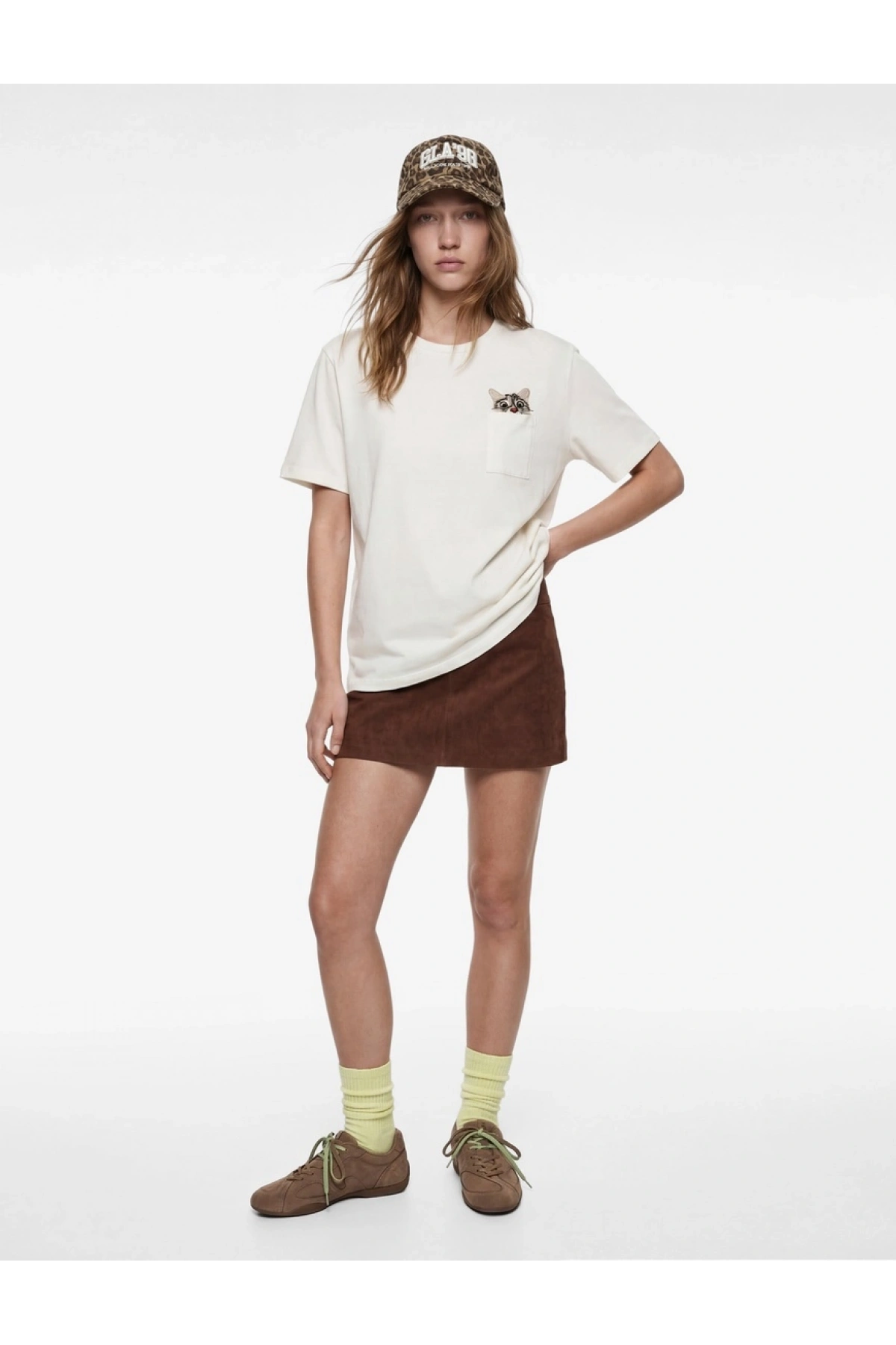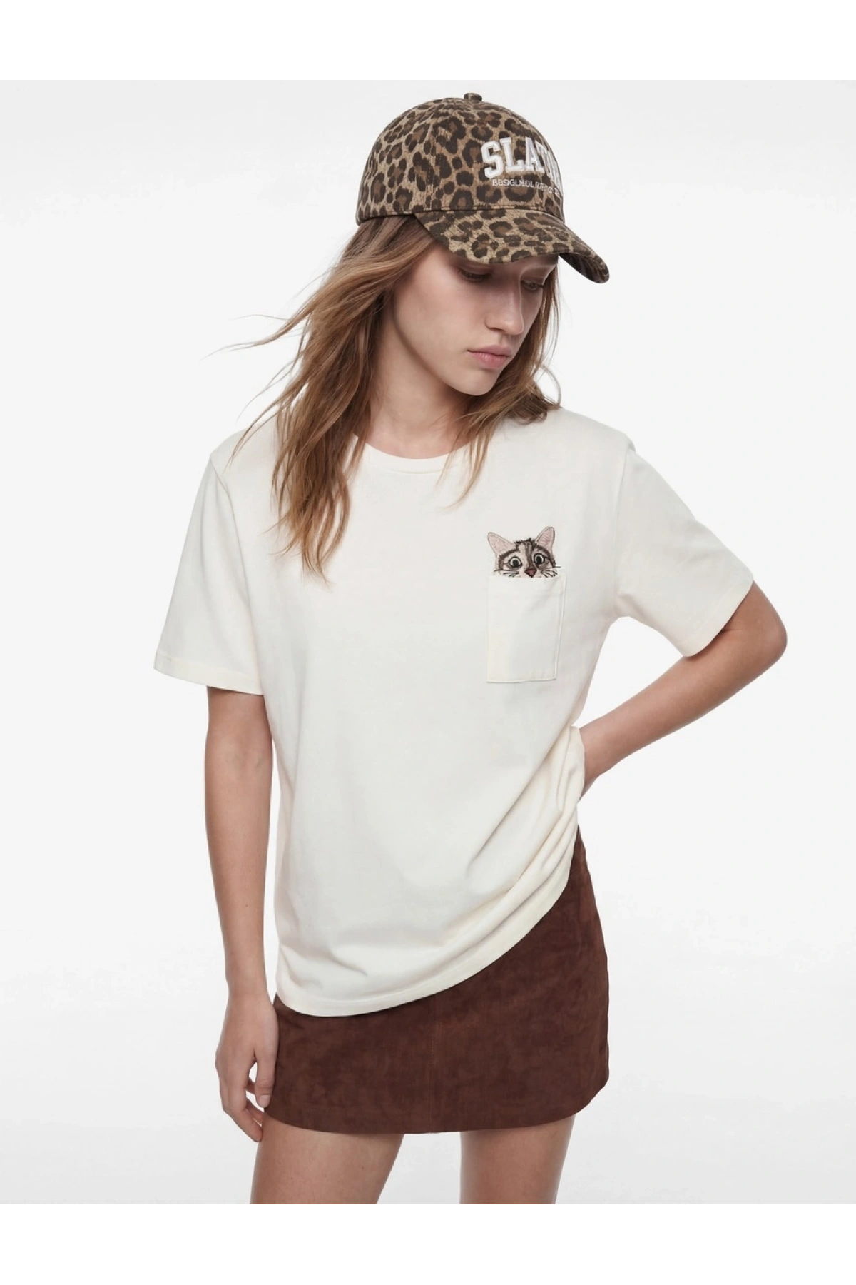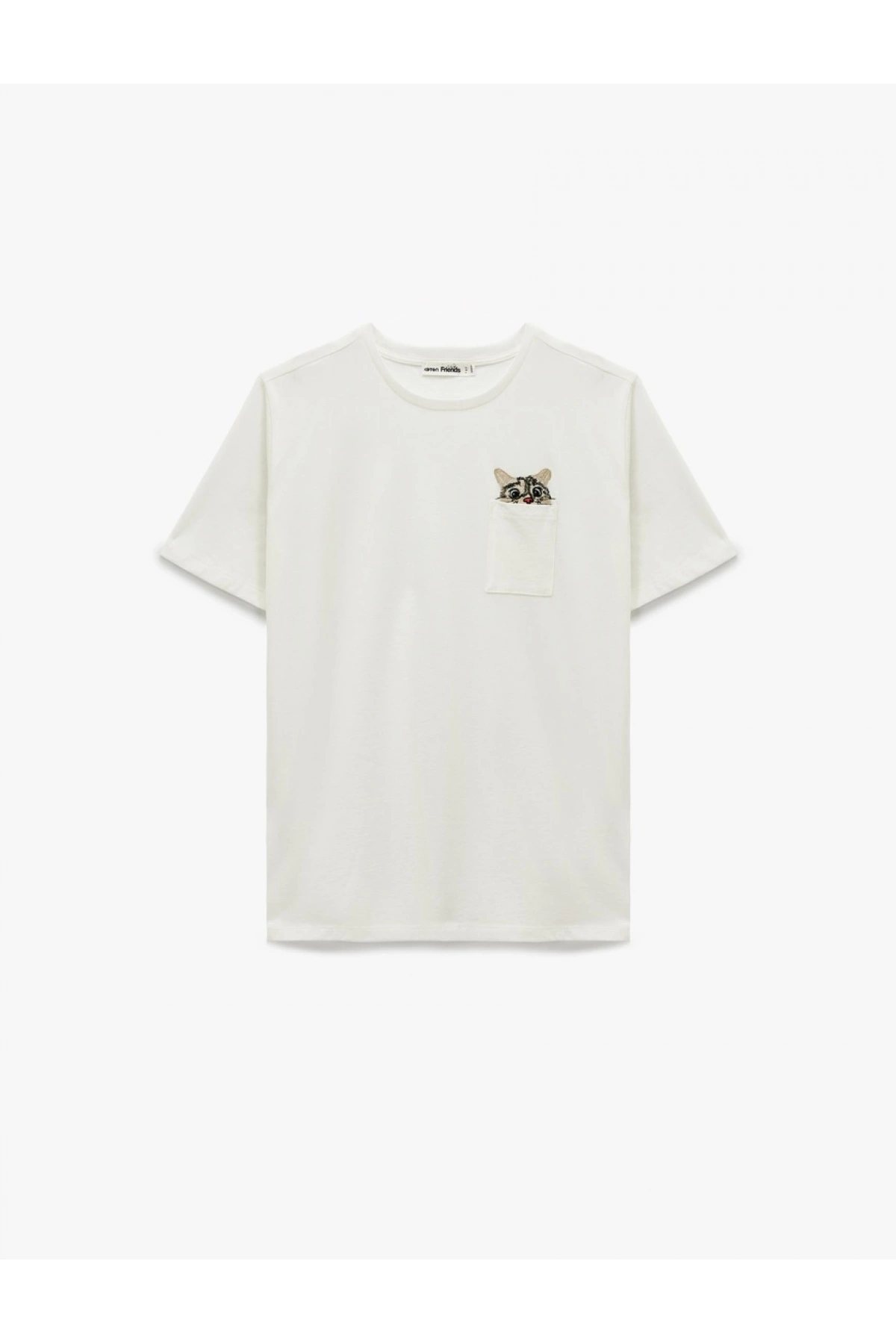 Koton Cep Detaylı Kısa Kollu Bisiklet Yaka Pamuklu Kedi Nakışlı Oversize Tişört