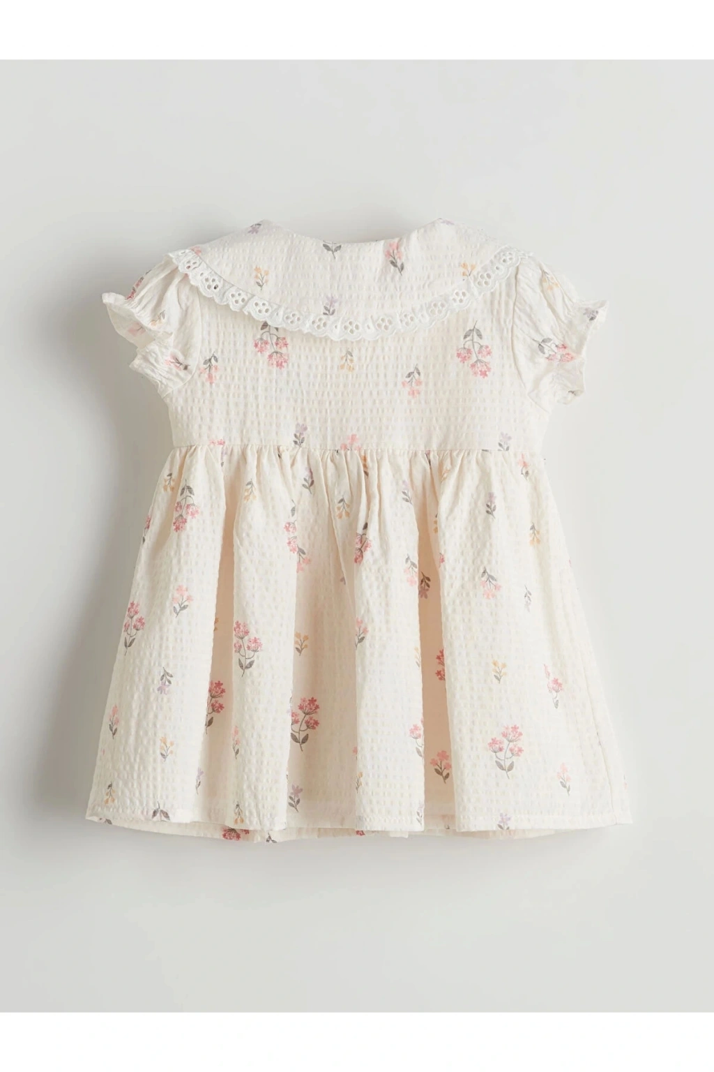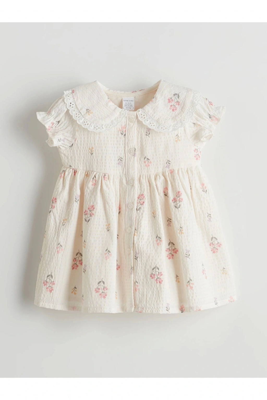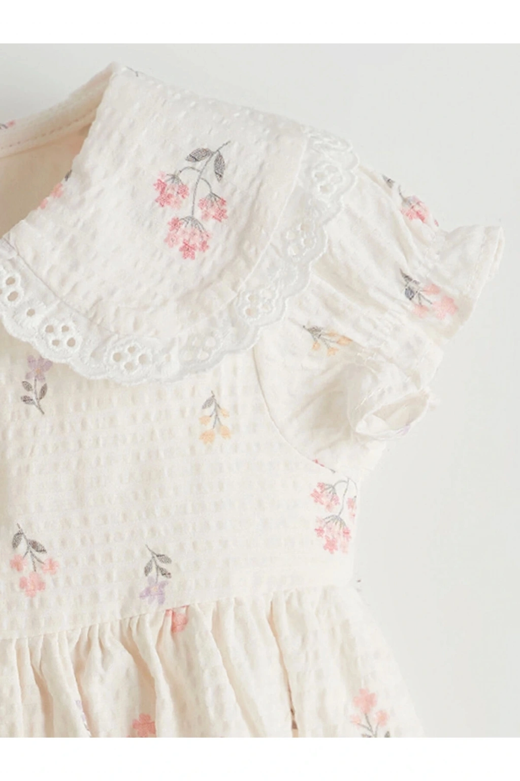 Zarif bebe yaka ve sevimli çiçek deseniyle öne çıkan kız bebek elbise, yumuşak ve hafif kumaşıyla gün boyu konfor sunar. Şık tasarımı sayesinde hem günlük kullanım hem de özel günler için ideal bir seçimdir.