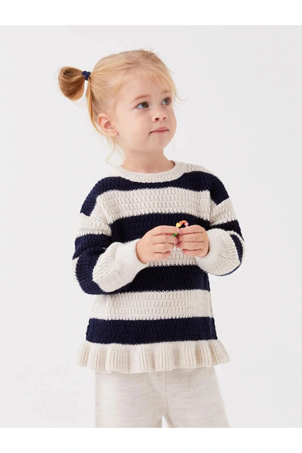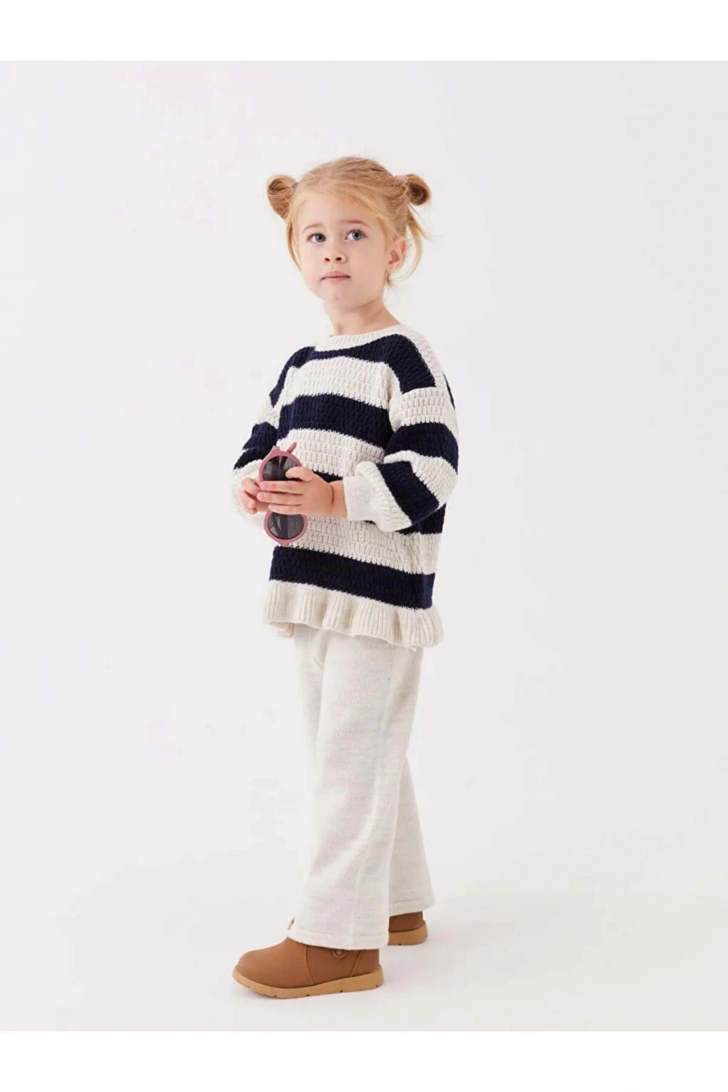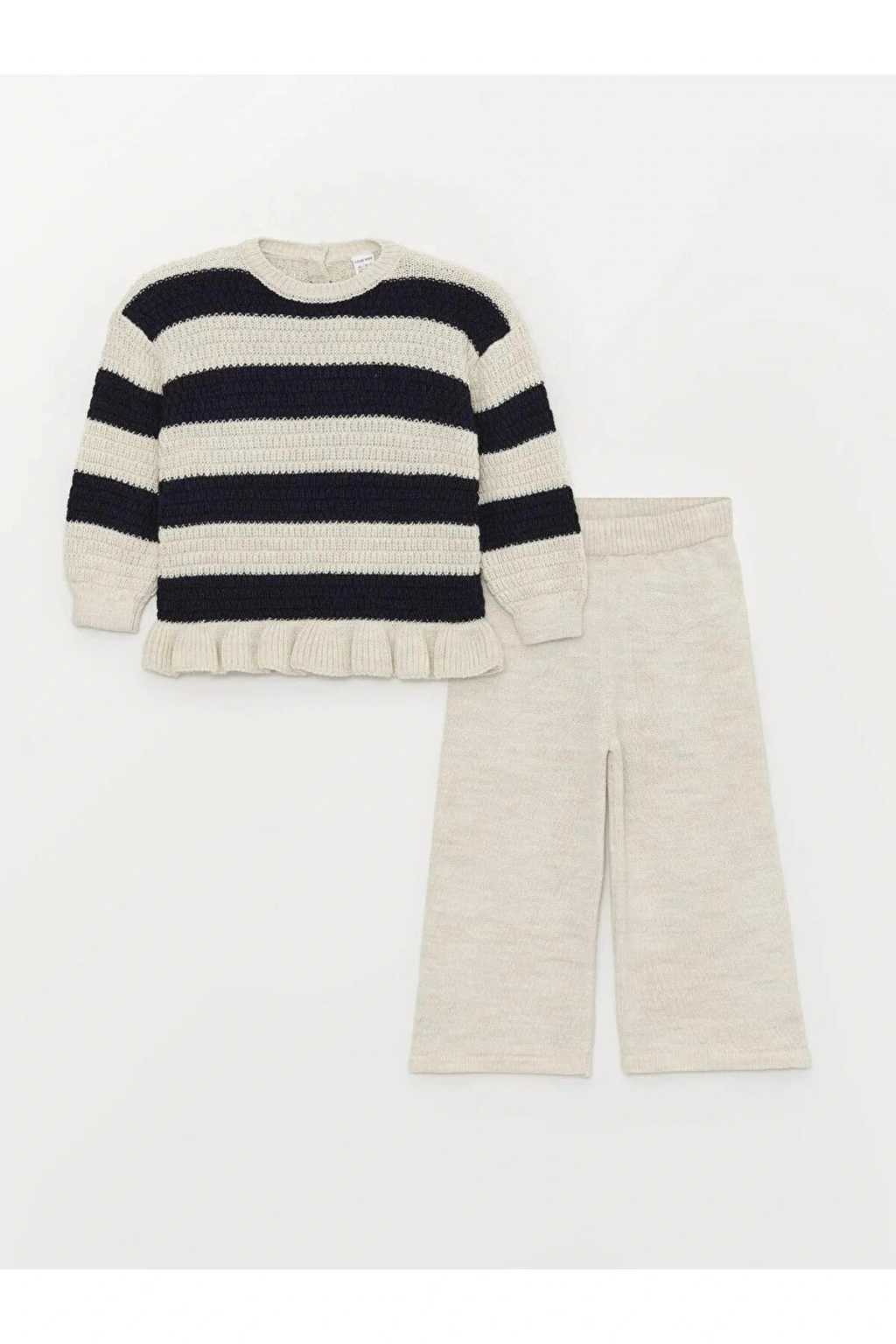 Kız bebek kazak ve pantolon takımı triko kumaştan üretilmiştir. Kazak uzun kollu ve bisiklet yaka tasarımlıdır ve çizgi detayları bulunmaktadır. Pantolon kazakla aynı kumaştan yapılmış ve tamamlayıcı bir renge sahiptir.