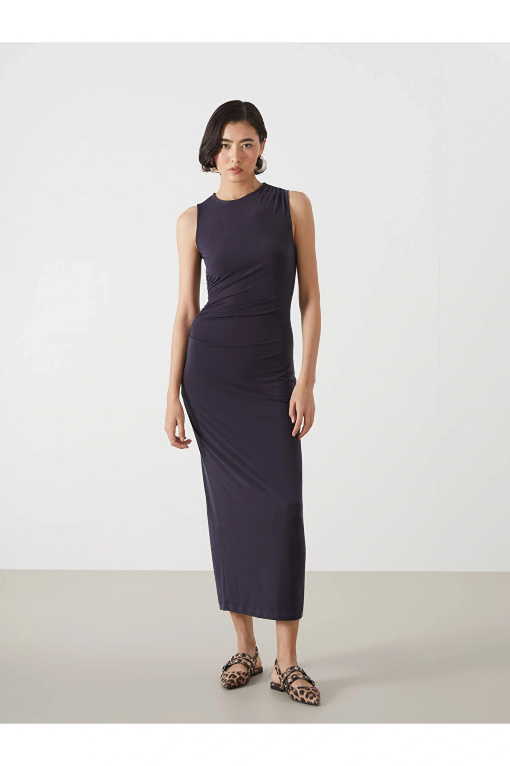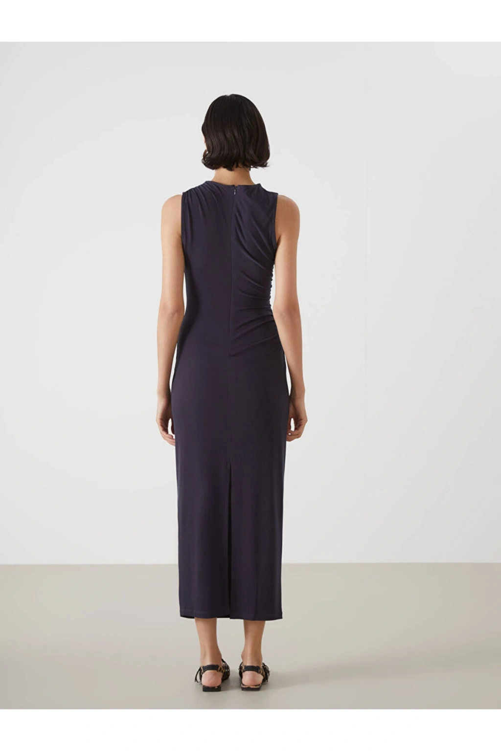Cinsiyet: Kadın-Ürün Tipi: Elbise-Kumaş: Krep-Kalıp: Dar & Slim-Kalınlık: -Yaka: Bisiklet Yaka-Ana Kumaş: %5 ELASTAN %95 Polyester-Desen: Düz-Malzeme: -Kol Boyu: Kolsuz.; Açıklama Bisiklet yaka kadın elbise, yan tarafında yer alan büzgü detayı ile sofistike ve modern bir görünüm sunar Arkadan fermuar kapaması, kolay giyim ve çıkarma imkanı sağlarken, elbisenin şık ve dar kesimi her türlü etkinlik için ideal bir seçenektir
