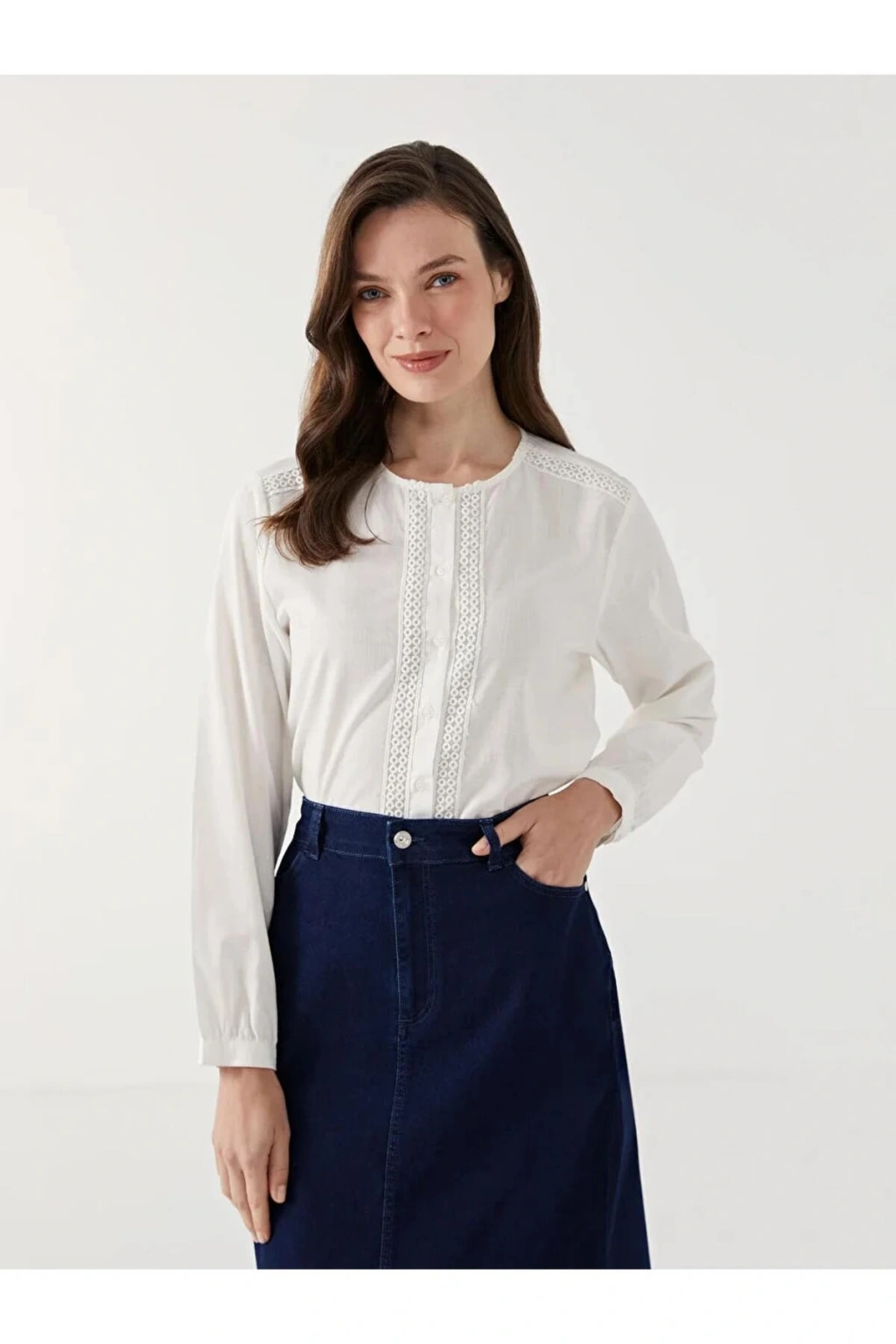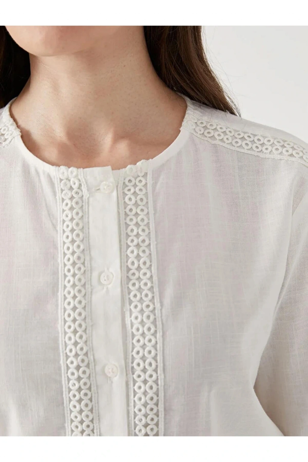 Bisiklet yaka dantel detaylı kadın bluz, hafif ve ince yapısıyla zarif bir görünüm sunar. Önden düğme kapamalı tasarımı ise şıklığa pratik bir kullanım ekler.