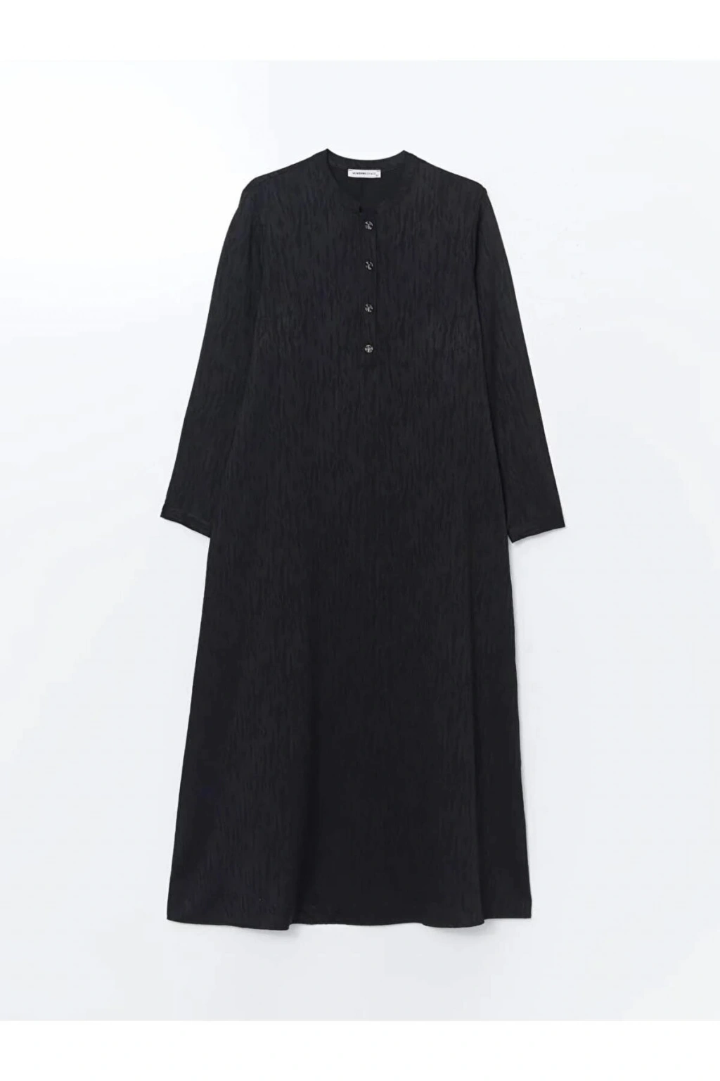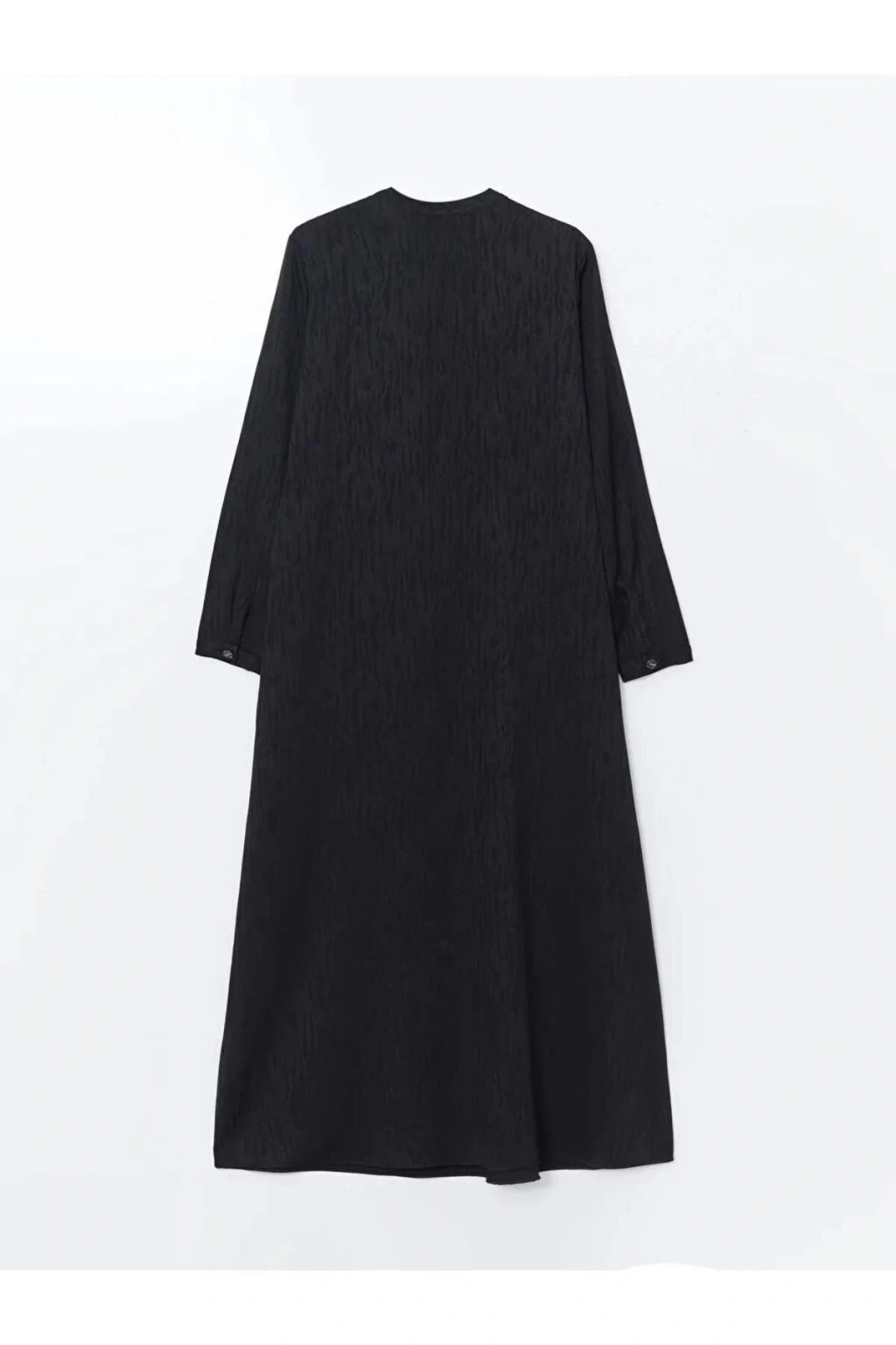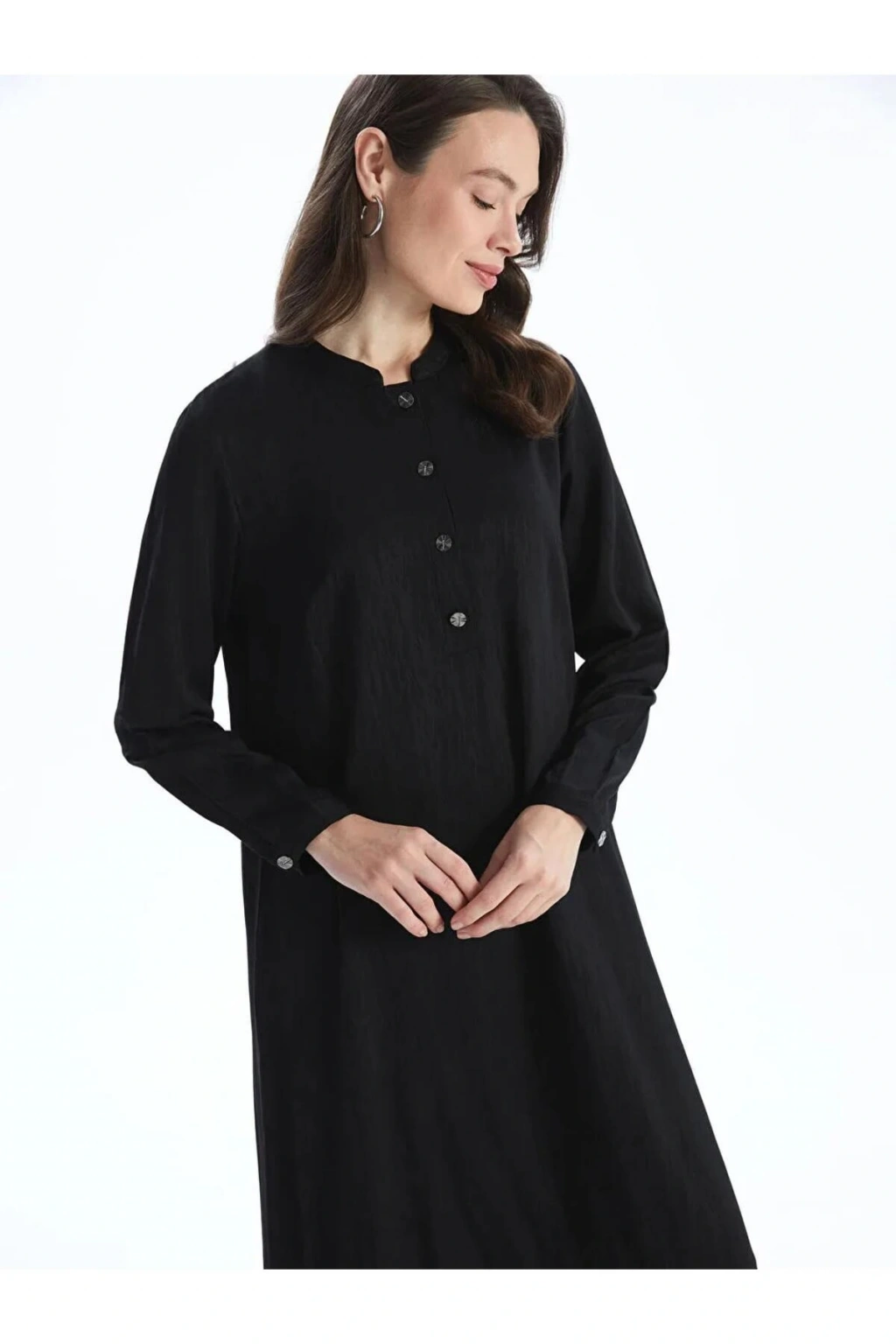 Hakim yaka desenli uzun kollu elbise, viskoz ve polyester karışımlı kumaştan üretilmiştir. Bu sayede kolay kolay kırışmaz ve bakımı kolaydır. Yakası önden düğme kapamalı tasarımıyla kolay giyilir.