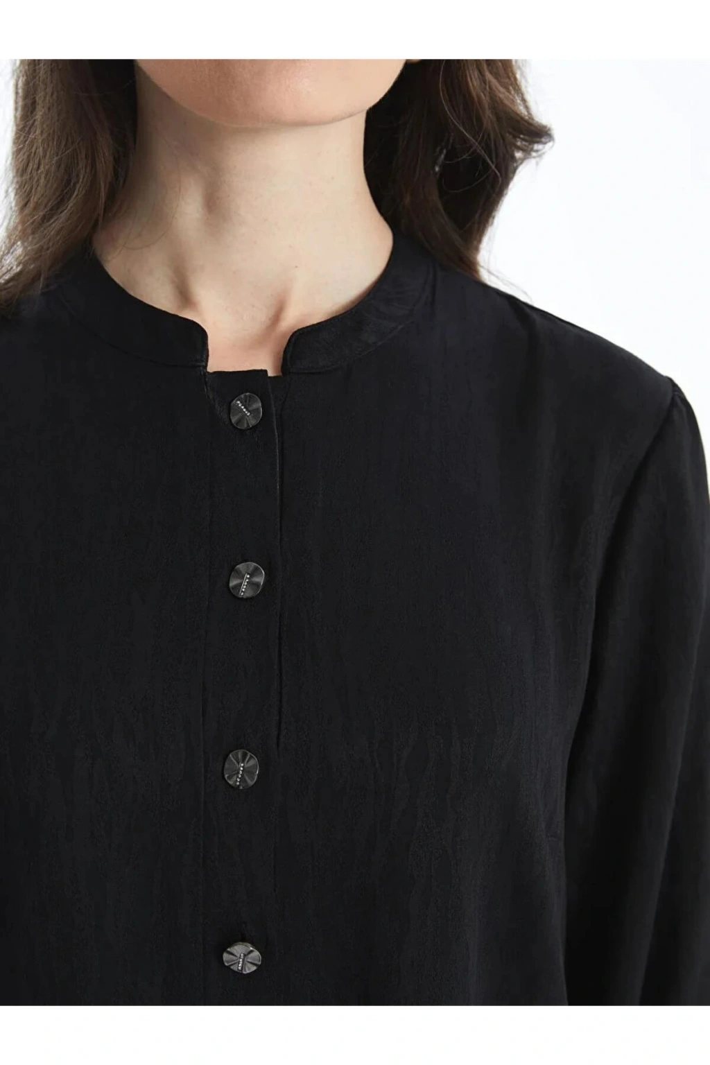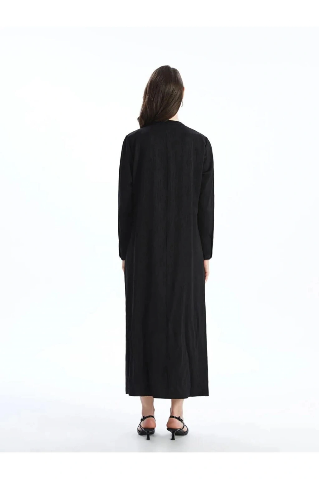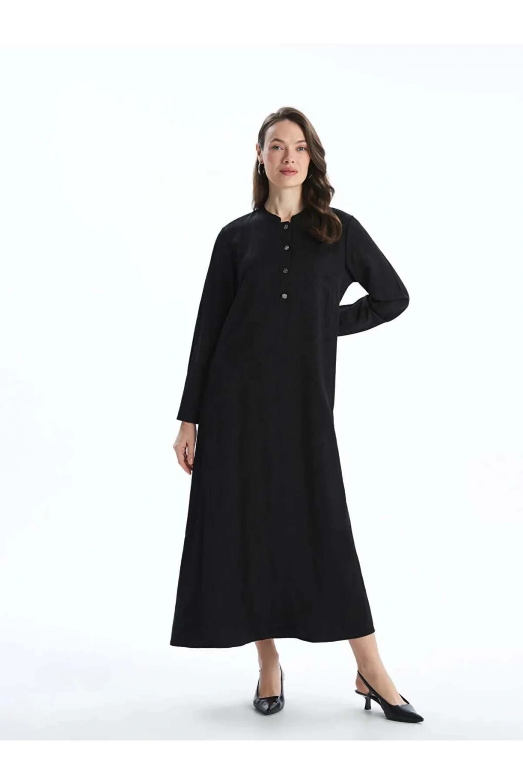 Hakim yaka desenli uzun kollu elbise, viskoz ve polyester karışımlı kumaştan üretilmiştir. Bu sayede kolay kolay kırışmaz ve bakımı kolaydır. Yakası önden düğme kapamalı tasarımıyla kolay giyilir.