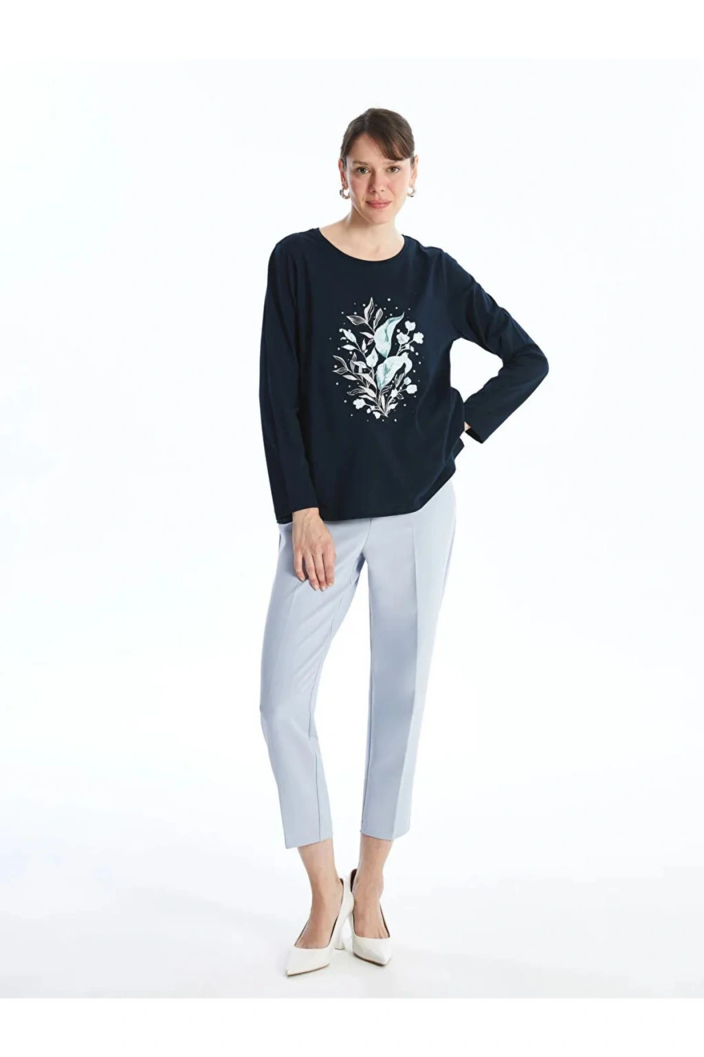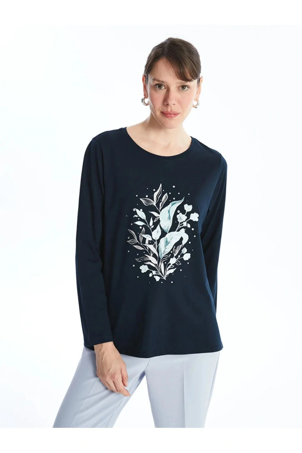 LCW Grace Lacivert Bisiklet Yaka Baskılı Uzun Kollu Kadın Tişört