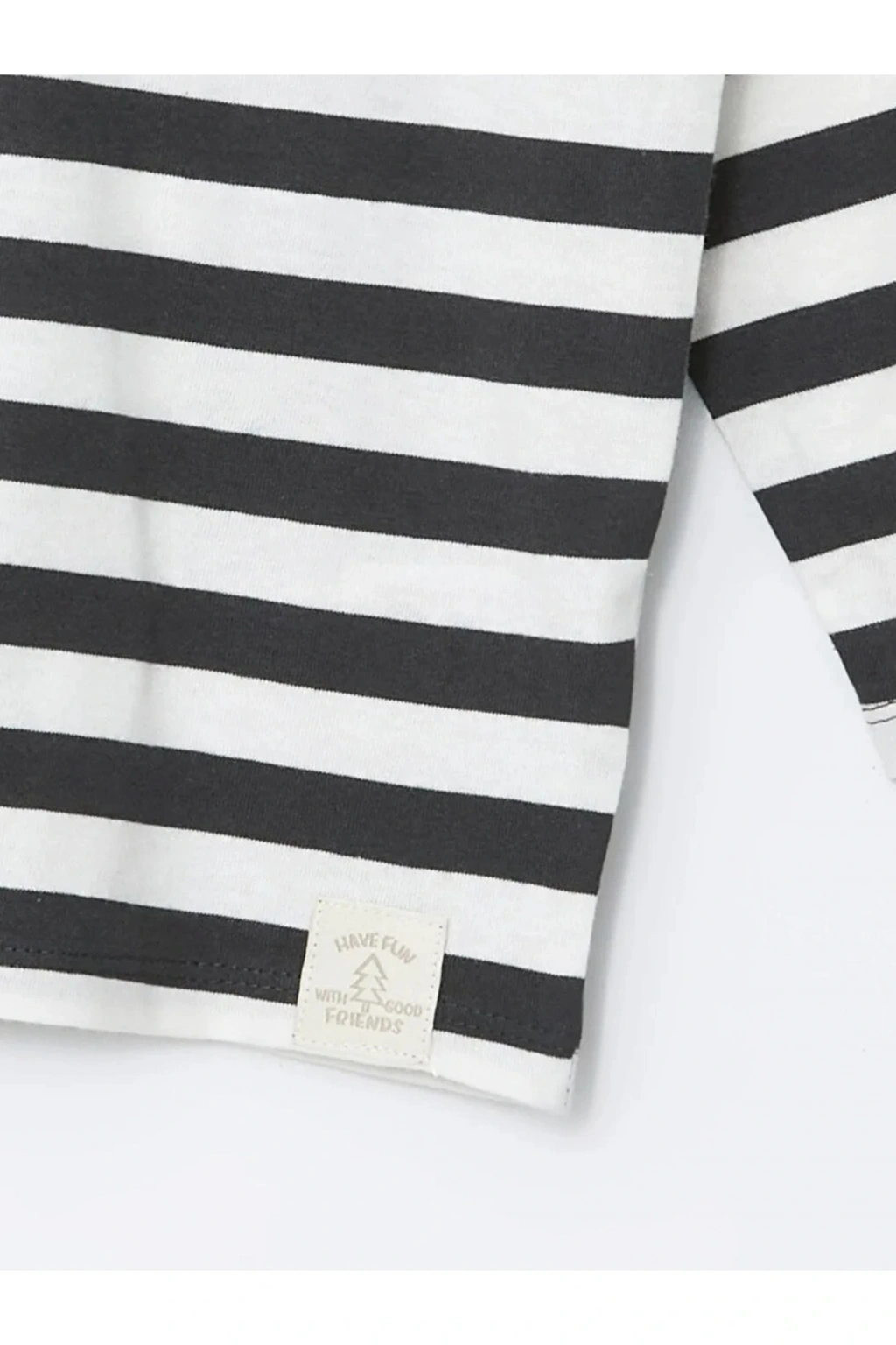 Bisiklet yaka çizgili erkek bebek tişört, penye kumaşıyla yumuşak ve rahat bir kullanım sunar. Sevimli çizgi deseni, bebeğinizin stiline eğlenceli bir dokunuş katar. Günlük aktivitelerde konfor sağlayan ideal bir tercihtir