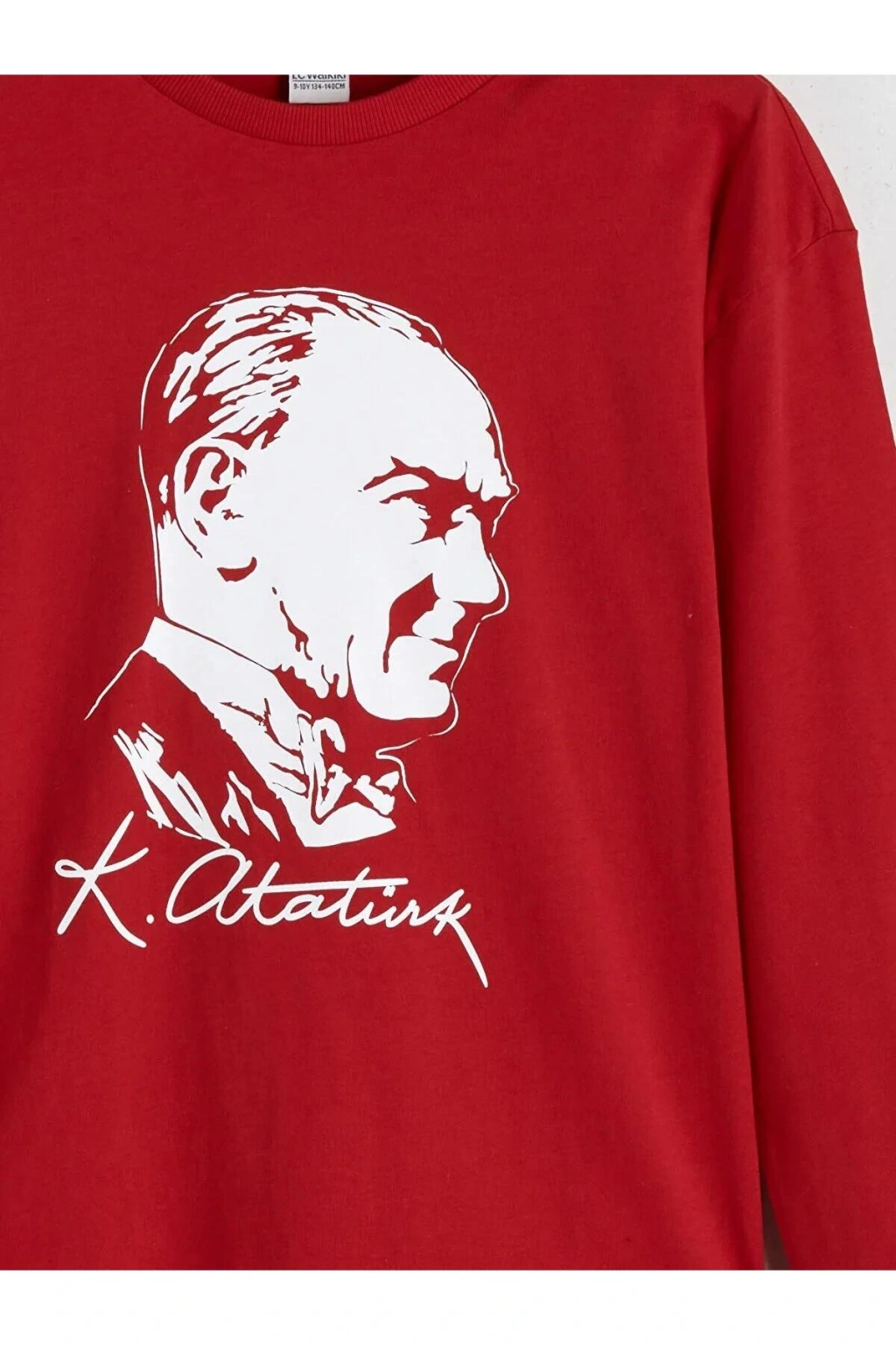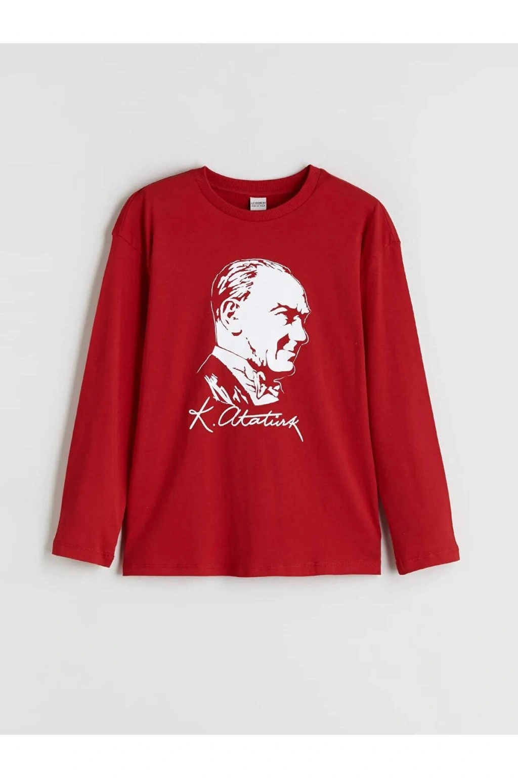 Atatürk baskılı erkek çocuk tişört, %100 pamuklu penye kumaştan üretilmiştir.; Bisiklet yaka ve uzun kolludur.; Ürün İçeriği ve ÖzellikleriAna Kumaş: %100 PamukMenşei: TurkıyeÜrün Tipi: TişörtKalıp: Standart & RegularYaka: Bisiklet YakaDesen: BaskılıKumaş: PenyeKalınlık: İnceKol Boyu: Uzun KolluMalzeme: %100 Pamuk