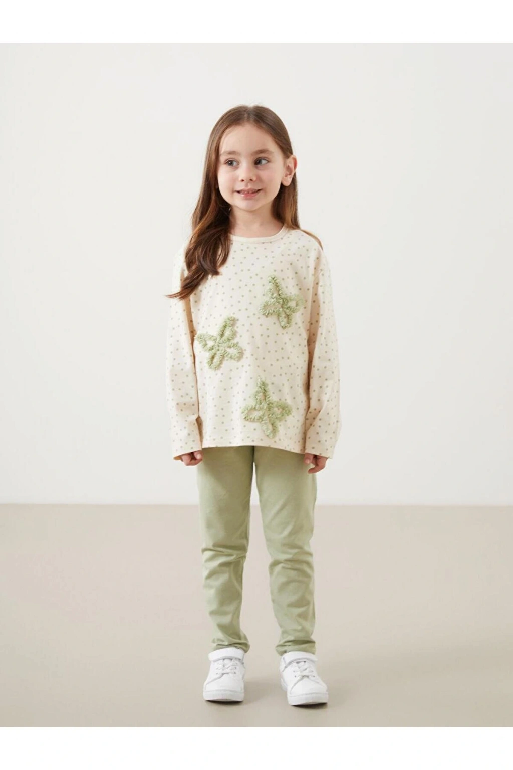 Ürün Açıklaması Bisiklet yaka kelebekli kız çocuk tişört ve tayt 2’li set, yumuşak kumaşıyla rahat bir kullanım sunar.; Kelebek nakış detaylarıyla şirin ve şık bir tercih.; Manken Bilgisi Göğüs: 0 cm Bel: 13 cm Basen: 0 cm Boy: 92 cm Manken 5y-6y beden ürün giyiyor.; Manken Bilgisi Boy: 92 cm Kilo: 13 kg Manken 5-6 YAŞ beden ürün giyiyor.; Ürün İçeriği ve Özellikleri Ürün İçeriği: Ana Kumaş Bluz: %100 Pamuk Ana Kumaş Tayt: %3 ELASTAN %97 Pamuk Ürün Özellikleri: Satıcı: LC Waikiki Marka: LCW Kids Ürün Tipi: Takım Cinsiyet: Kız Çocuk Kalıp: Standart & Regular Kumaş: Penye Desen: Baskılı Yaka: Bisiklet Yaka Kalınlık: İnce Kol Boyu: Uzun Kollu Uzunluk: Uzun Malzeme: %100 Pamuk Koleksiyon: Kreşe Dönüş Parça Sayısı: 2 Parça