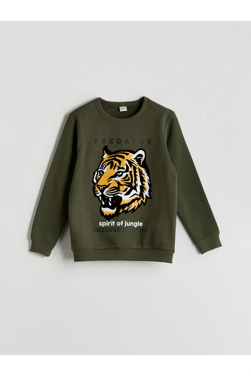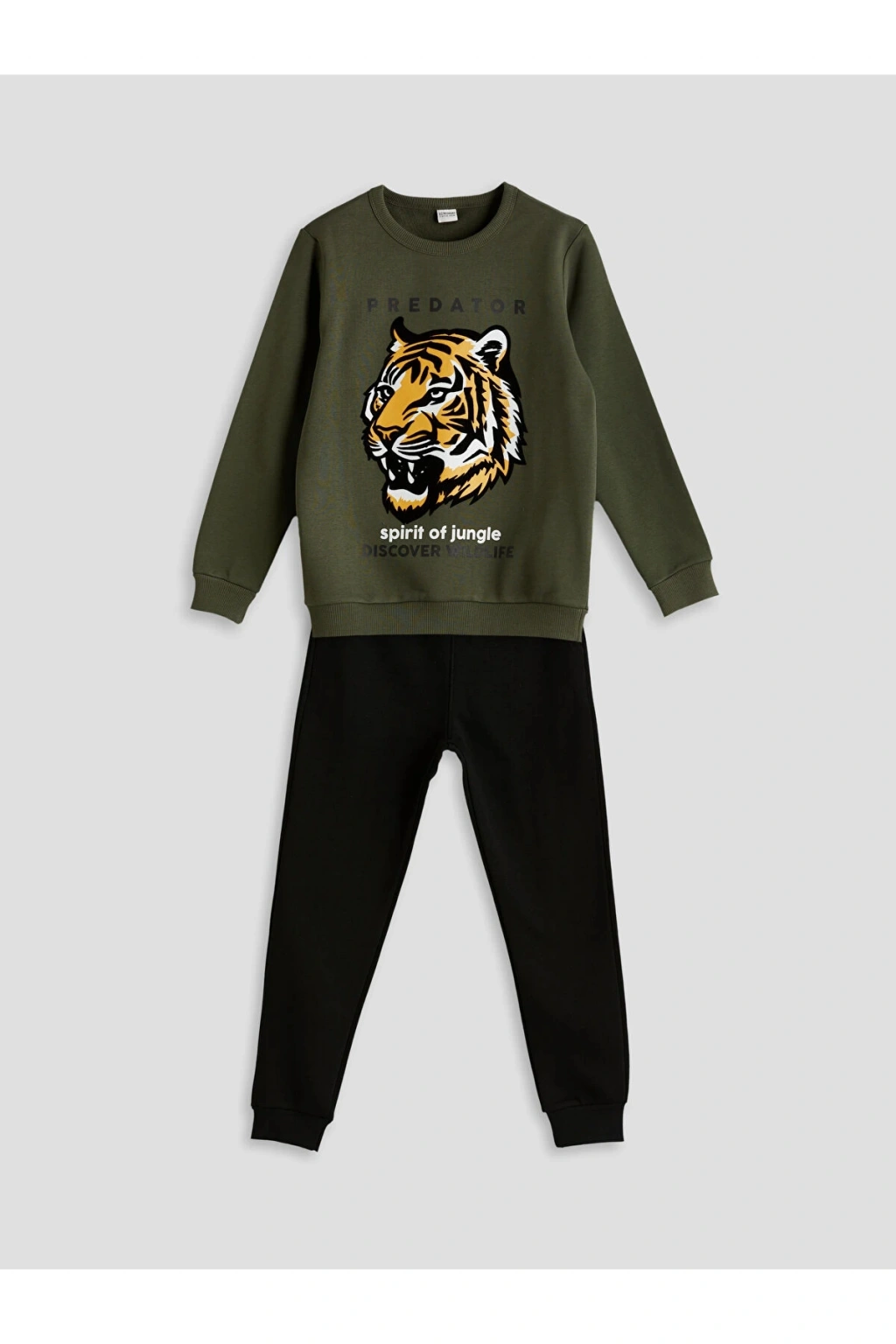 3 iplik şardonlu kumaştan üretilmiş, kaplan baskılı, paça ve manşetlerde ribanalı eşofman takımı.