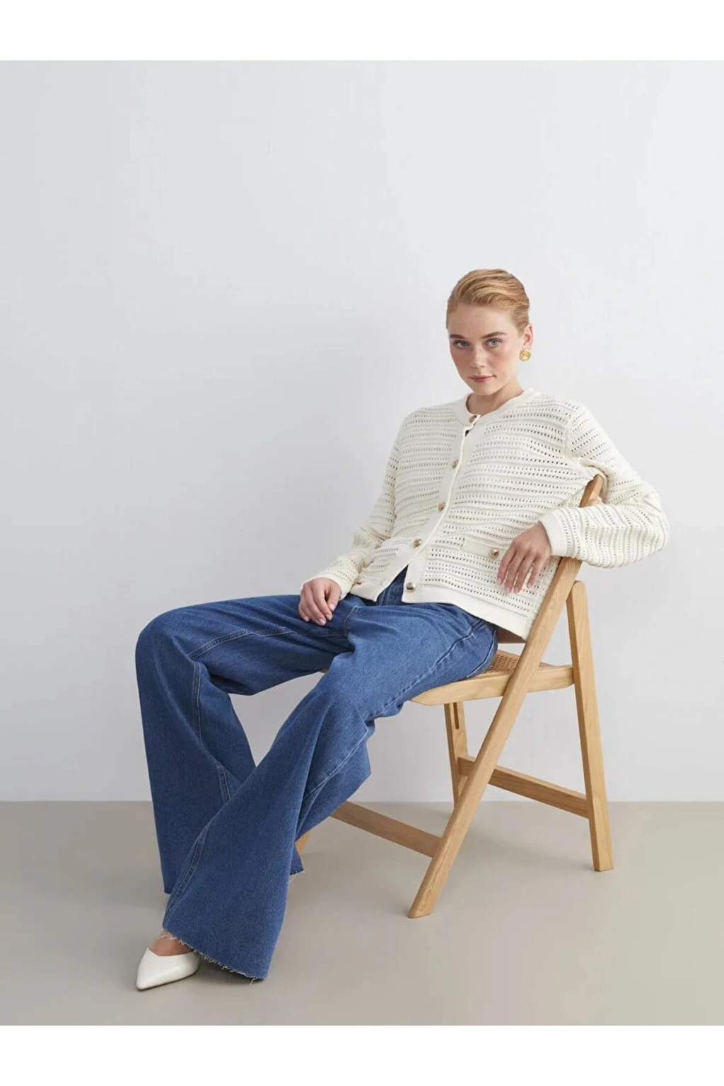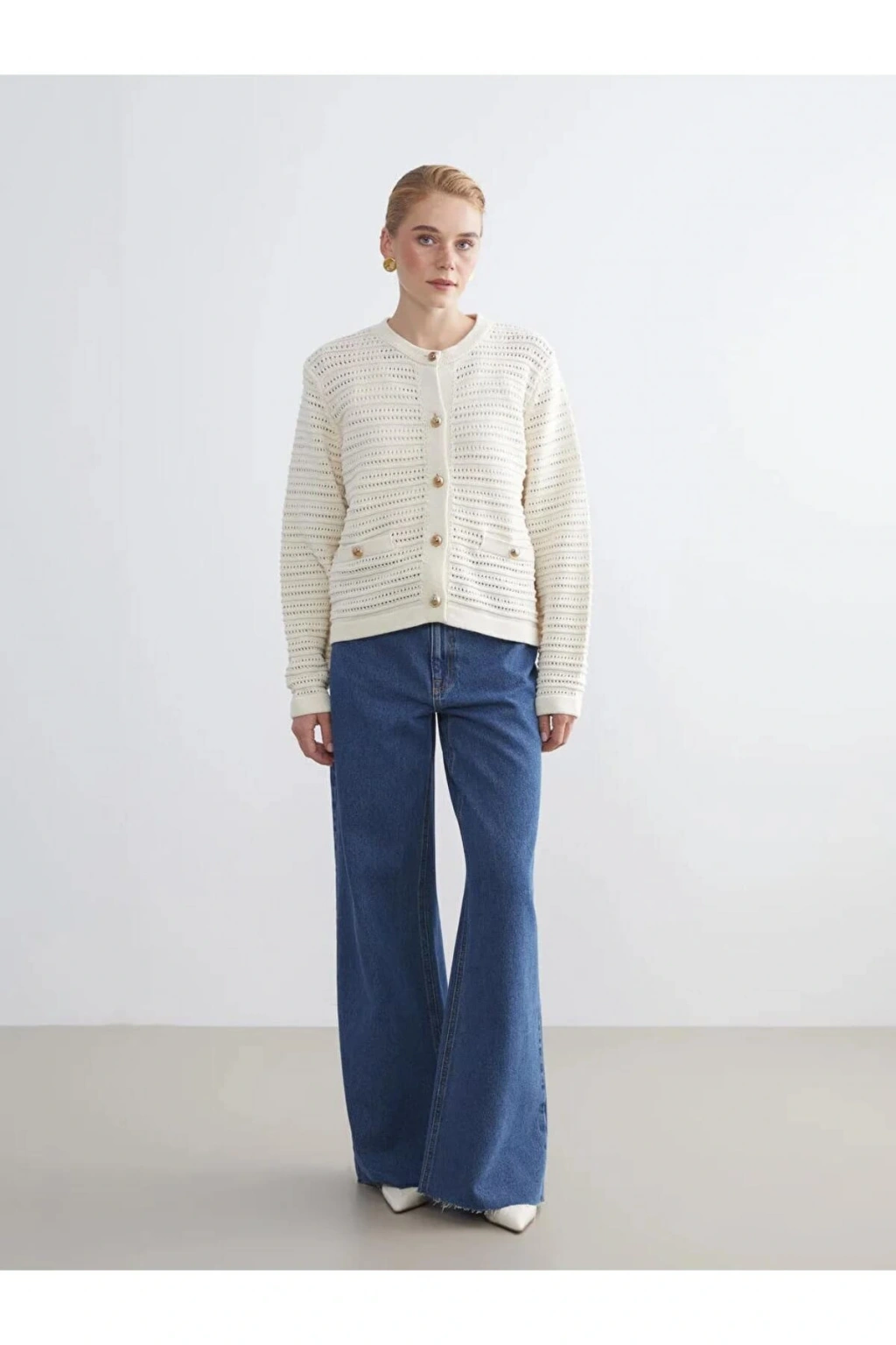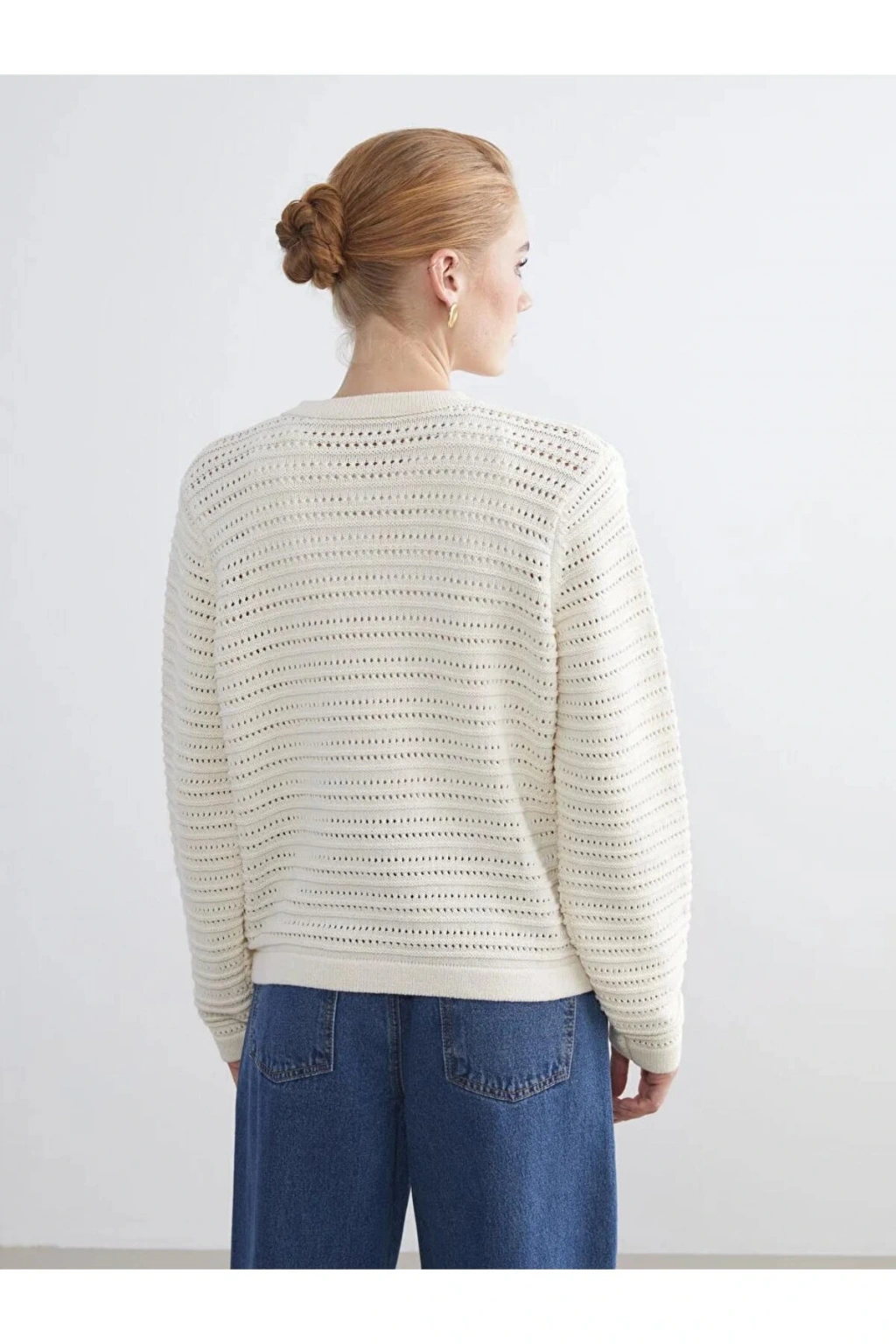 LCW Modest Ekru Bisiklet Yaka Ajurlu Kadın Triko Hırka