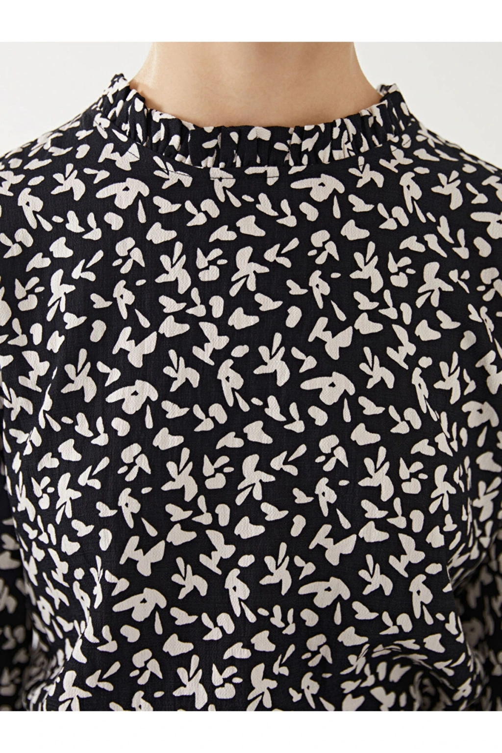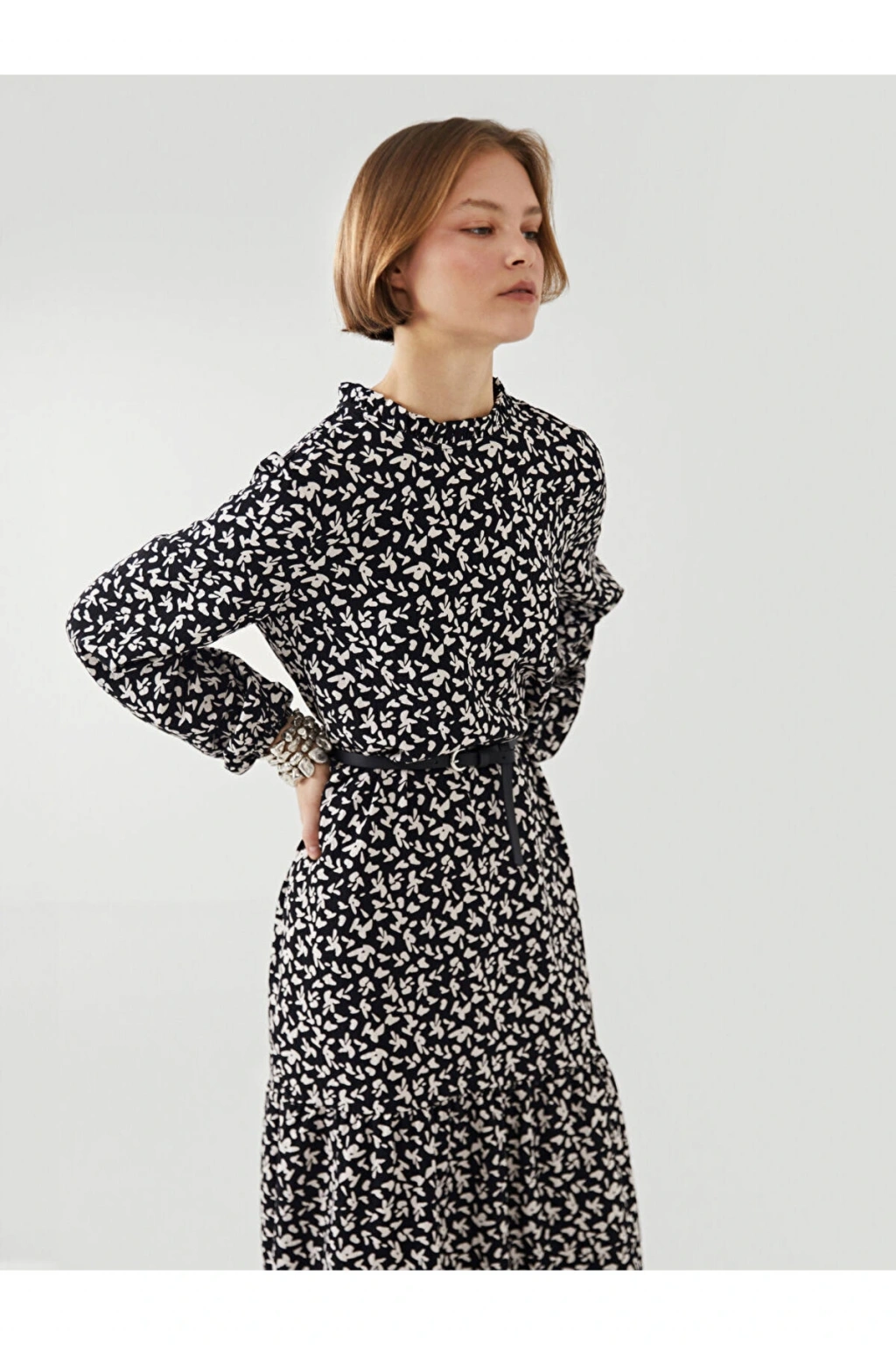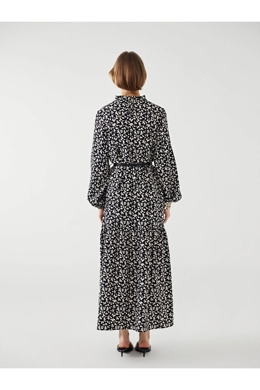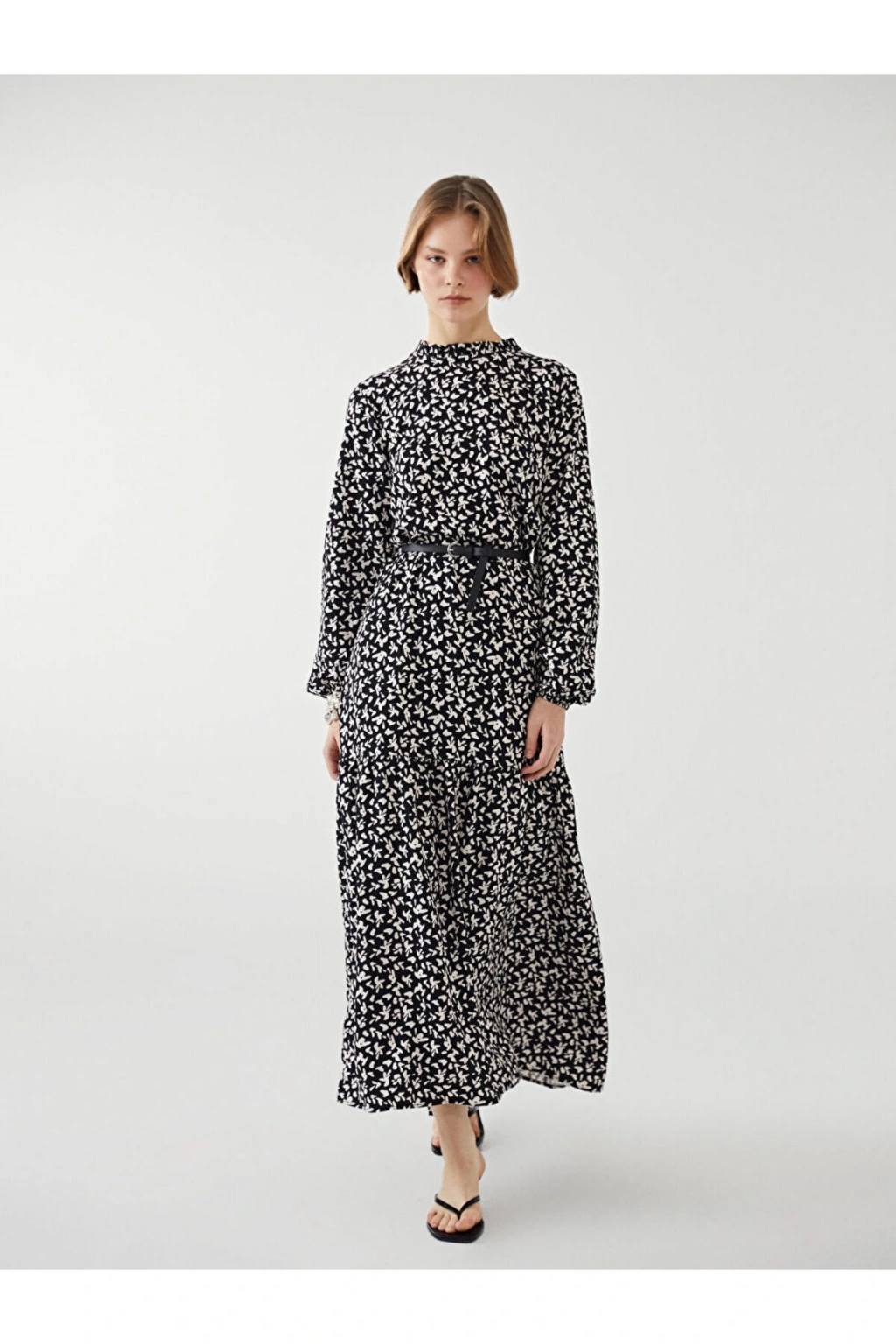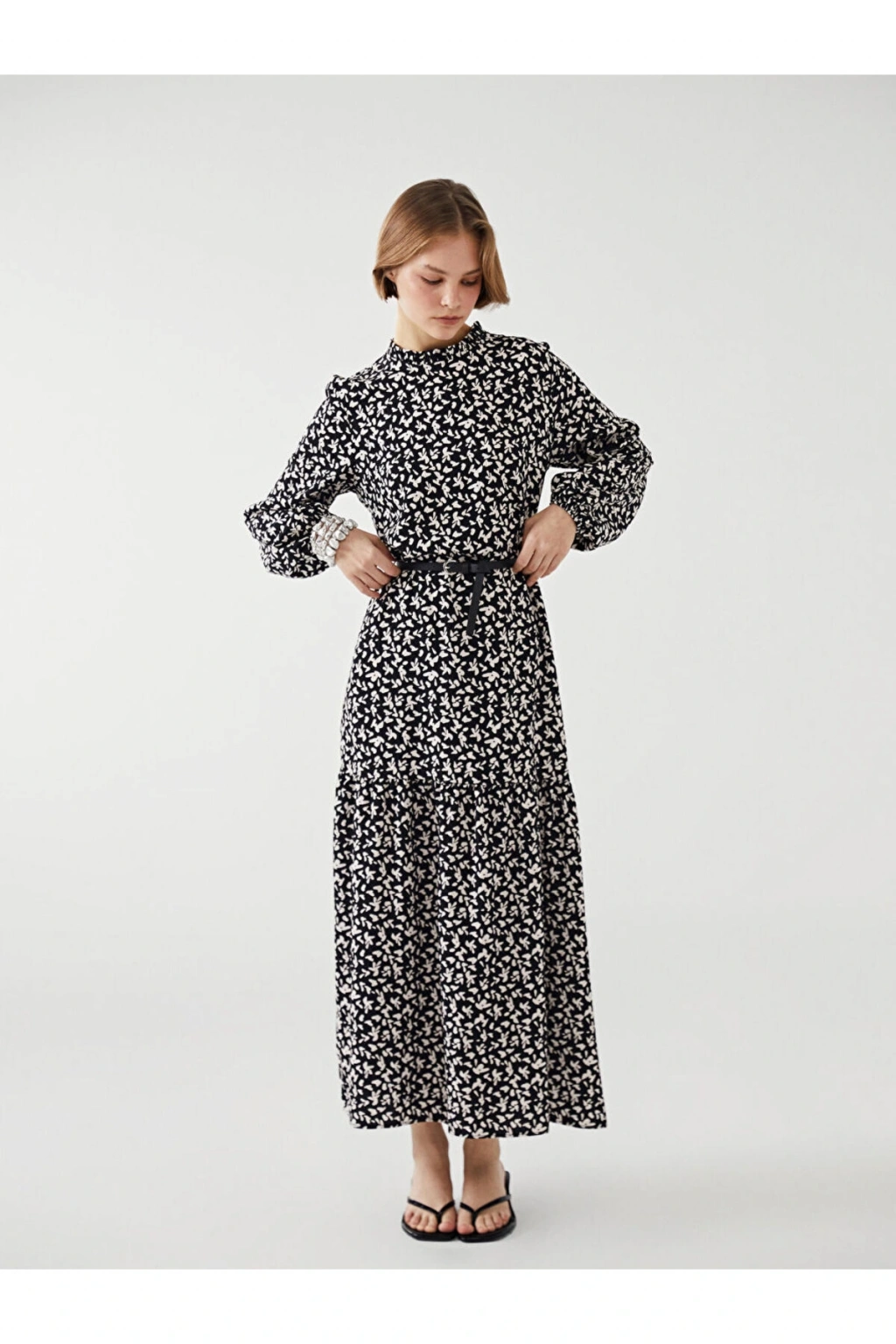 Dik yaka uzun kollu elbise, bel kısmındaki kemer detayı sayesinde zarif bir tasarıma sahiptir. yakası ve bileklerindeki fırfır detayları, elbiseye şıklık katar. Hem şık etkinliklerde hem de günlük hayatta tarzınızı konuşturabilirsiniz.