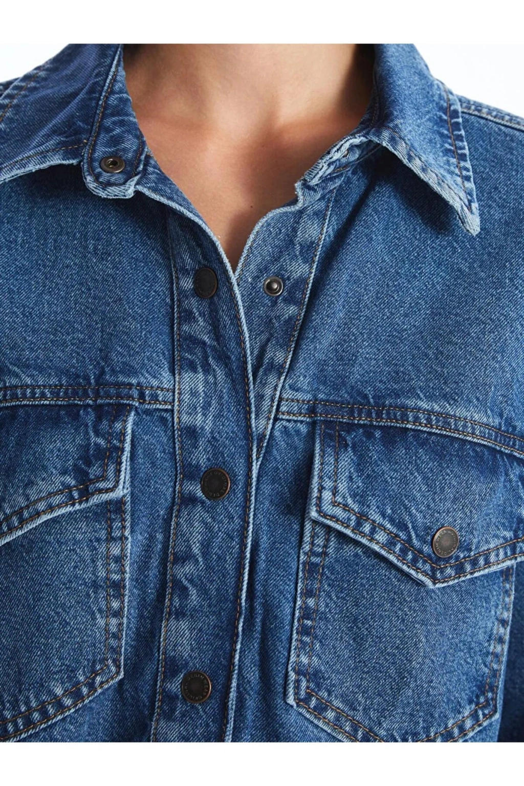 Düz uzun kollu crop jean gömlek ceket, önden düğme kapamalı tasarımıyla pratik bir kullanım sunar. Denim kumaştan üretilen shacket, kolay kırışmayan yapısı sayesinde ütü gerektirmez. Göğüs kısmında cep detayı bulunur.