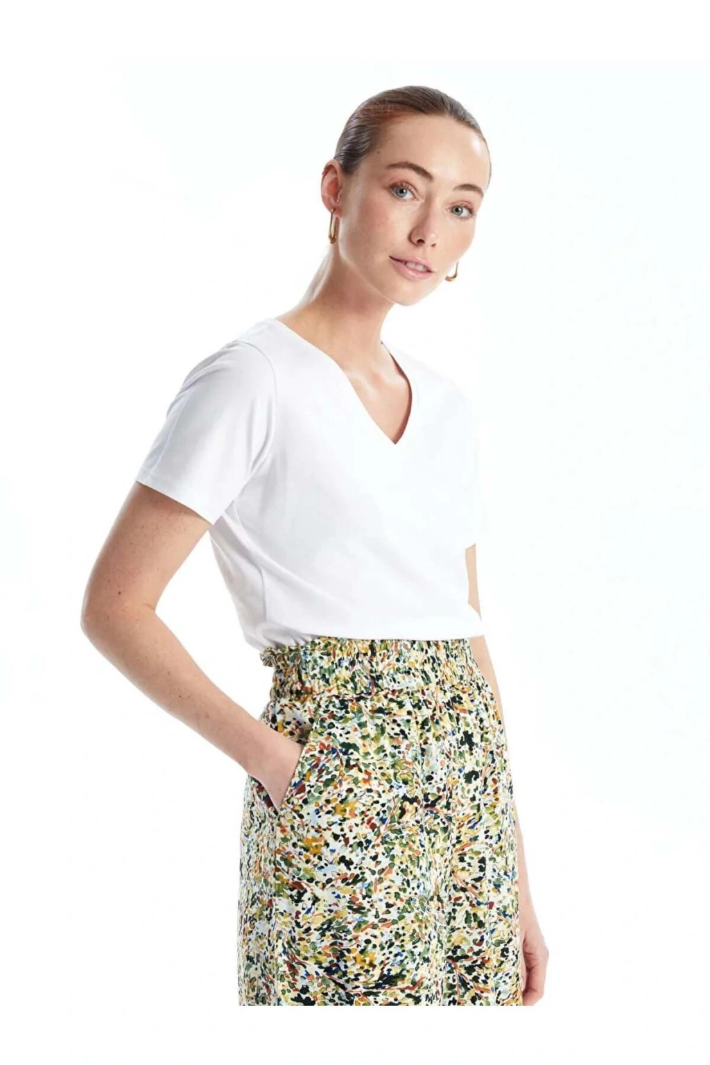 Kısa kollu kadın tişört, penye kumaşı sayesinde yumuşak bir dokunuş ve rahat bir kullanım deneyimi sunar. V yaka ve kısa kollu özellikleri, günlük kullanım için ideal olan bu tişörtü hem rahat hem de konforlu bir seçenek haline getirir.