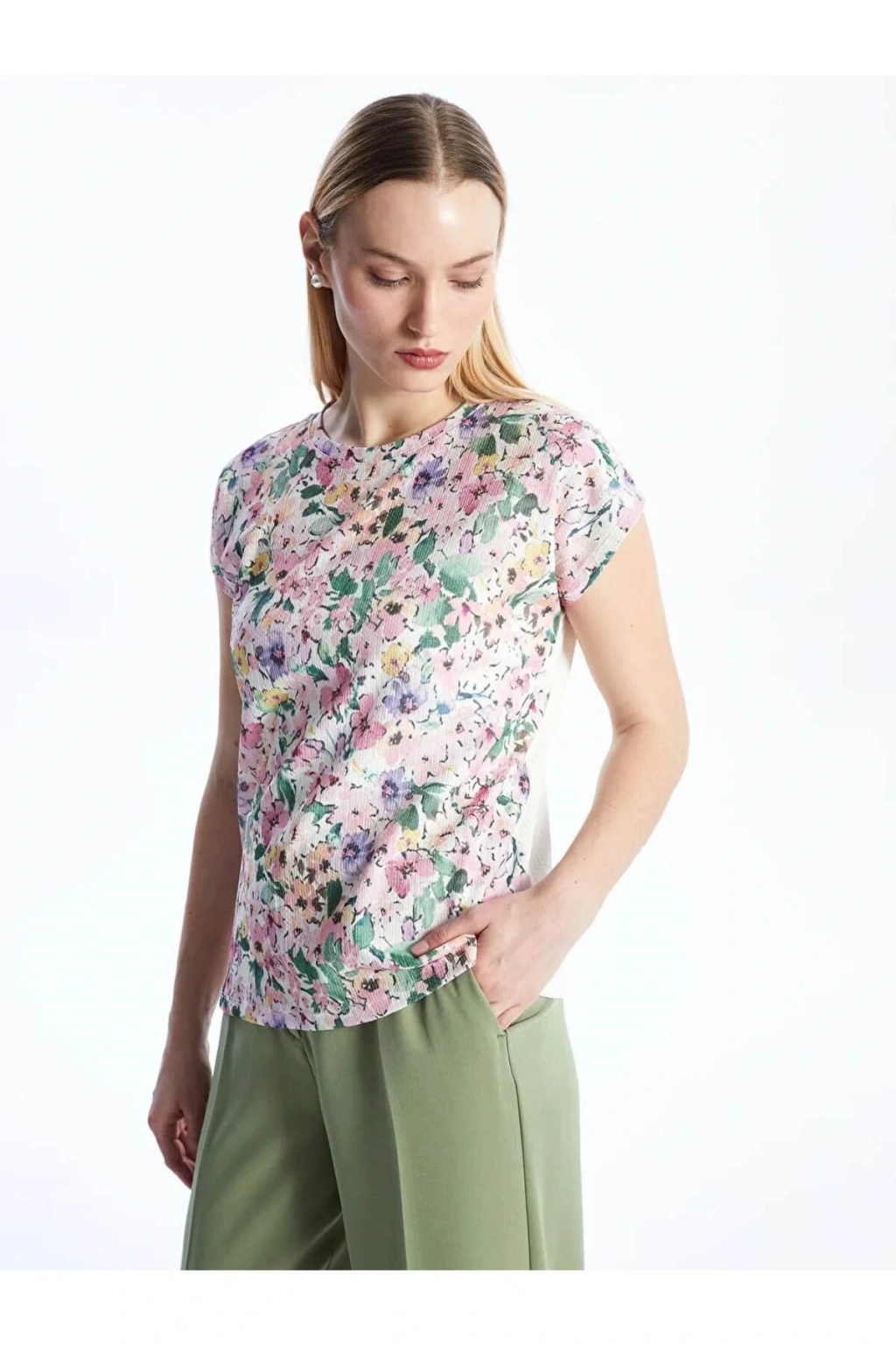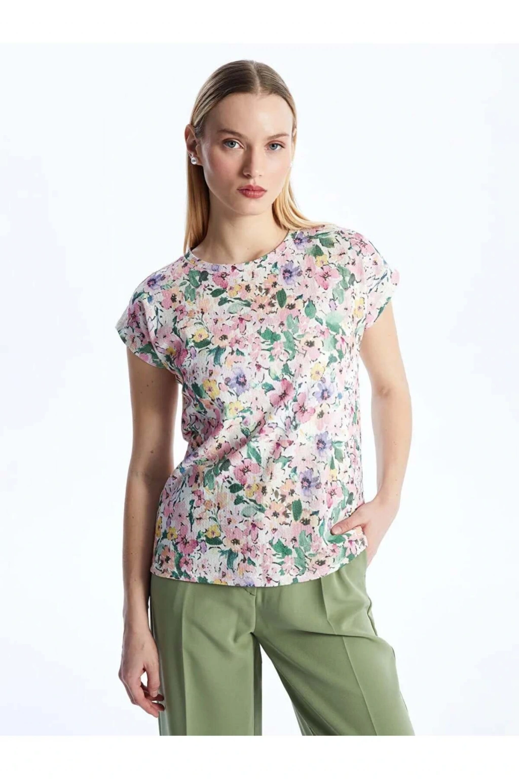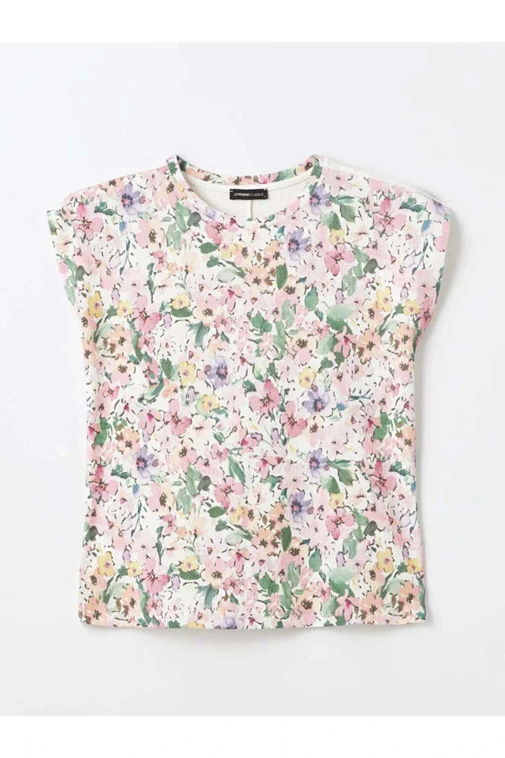 Bisiklet yaka çiçekli kısa kollu tişört, raşel kumaştan üretilmiştir. Hava alan yumuşak yapıdaki kumaşı, kolay yıkanır ve hızlı kuruma özelliğine sahiptir.