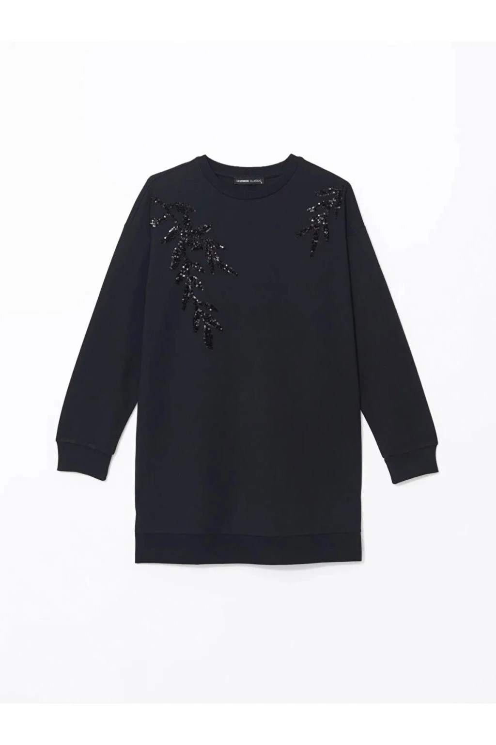 LCWAIKIKI Basic Siyah Bisiklet Yaka Pul İşlemeli Oversize Kadın Sweatshirt Tunik