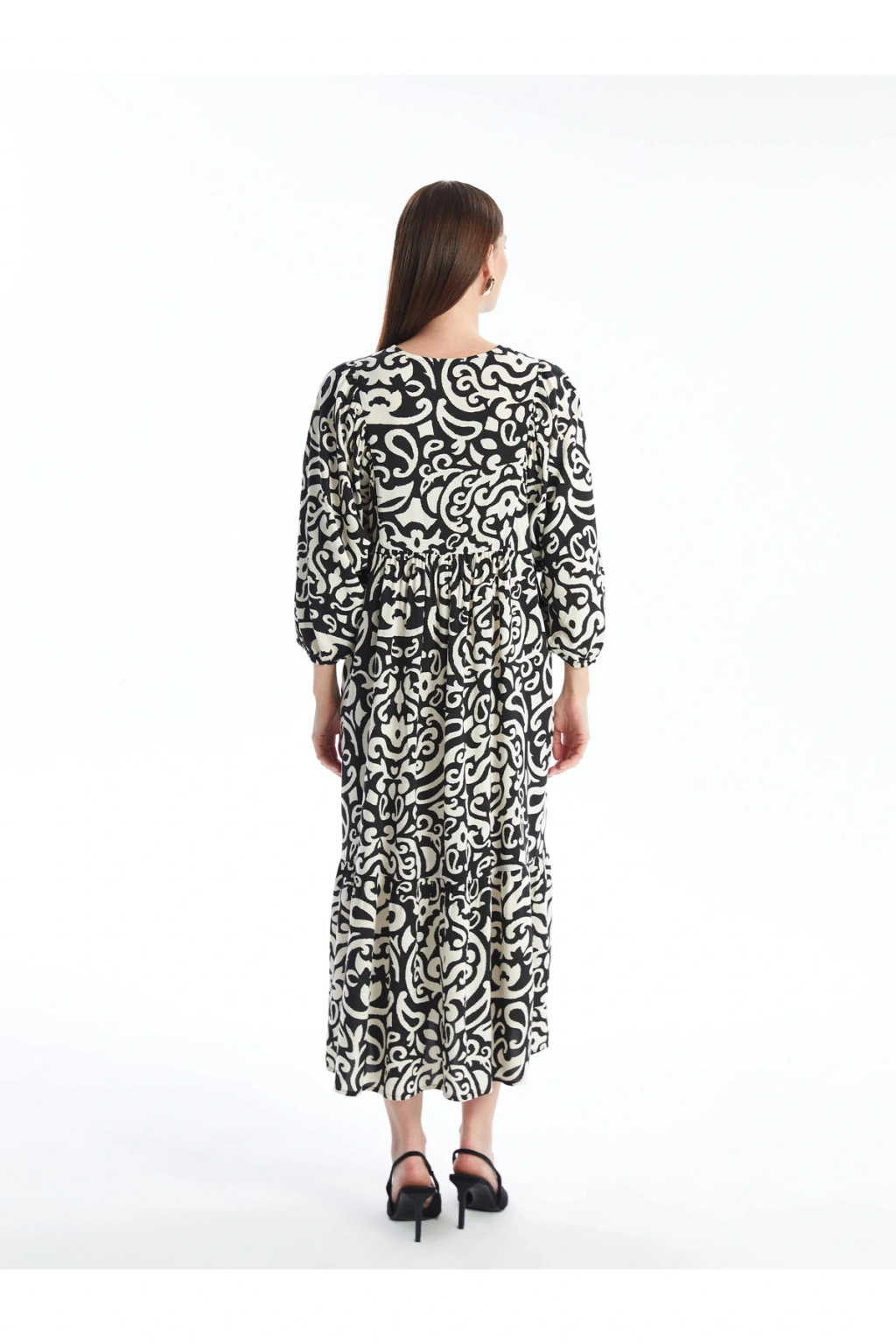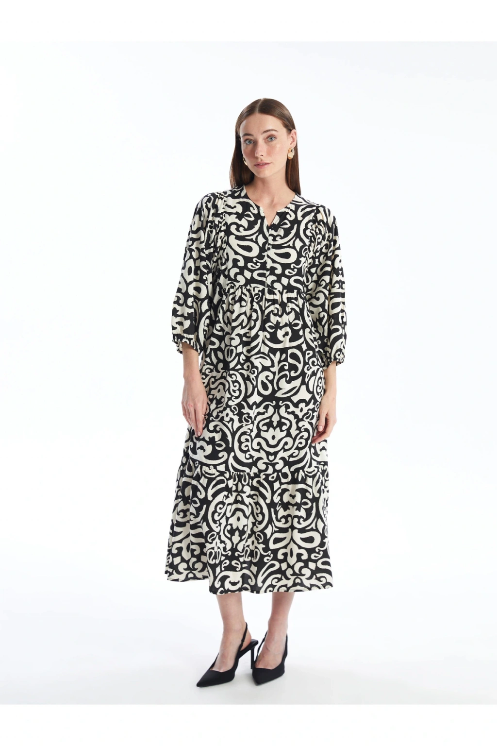 Ürün Açıklaması: Kaçık yaka balon kollu desenli oversize elbise, viskoz elyaftan üretilmiştir ve yumuşak bir dokuya sahiptir.; Hafif ve ince yapısı ile gün boyu konfor sunar.; Lastikli tasarımı ile kol ucunu sarar.; Yakası düğme kapamalı yapısı sayesinde kolay giyilir.; Manken Bilgisi: Göğüs: 83 cm Bel: 60 cm Basen: 89 cm Boy: 173 cm Manken 38 beden ürün giyiyor.; Ürün İçeriği ve Özellikleri: Ürün İçeriği: Ana Kumaş: %100 VİSKOZ Ürün Özellikleri: Marka: LCWAIKIKI Classic Ürün Tip: Elbise Cinsiyet: Kadın Kalıp: Oversize Kumaş: Viskon Desen: Desenli Kalınlık: İnce Siluet: A Kesim Astar Detay: Astarsız Uzunluk: Midi Yaka: Kaçık Yaka Kol Boyu: 3/4 Boy Koleksiyon: Bayram Koleksiyonu