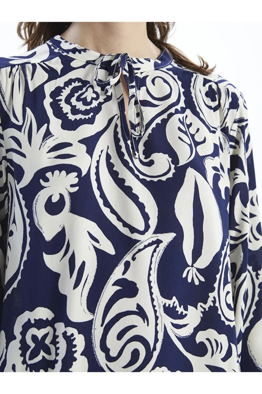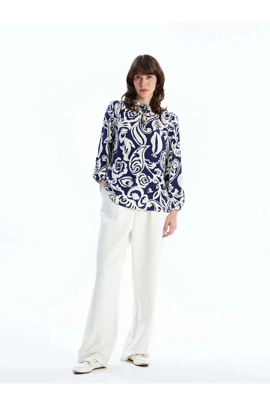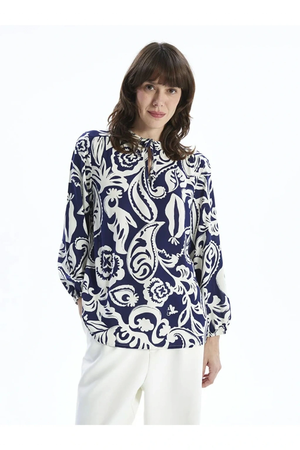 LCWAIKIKI Classic Mavi Bağlamalı Yaka Desenli Kadın Bluz