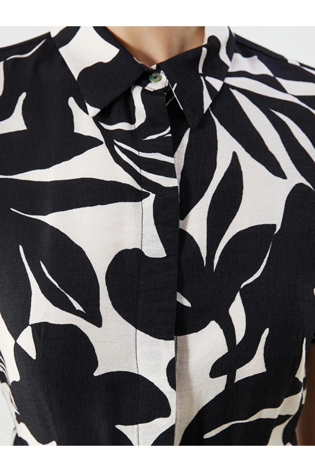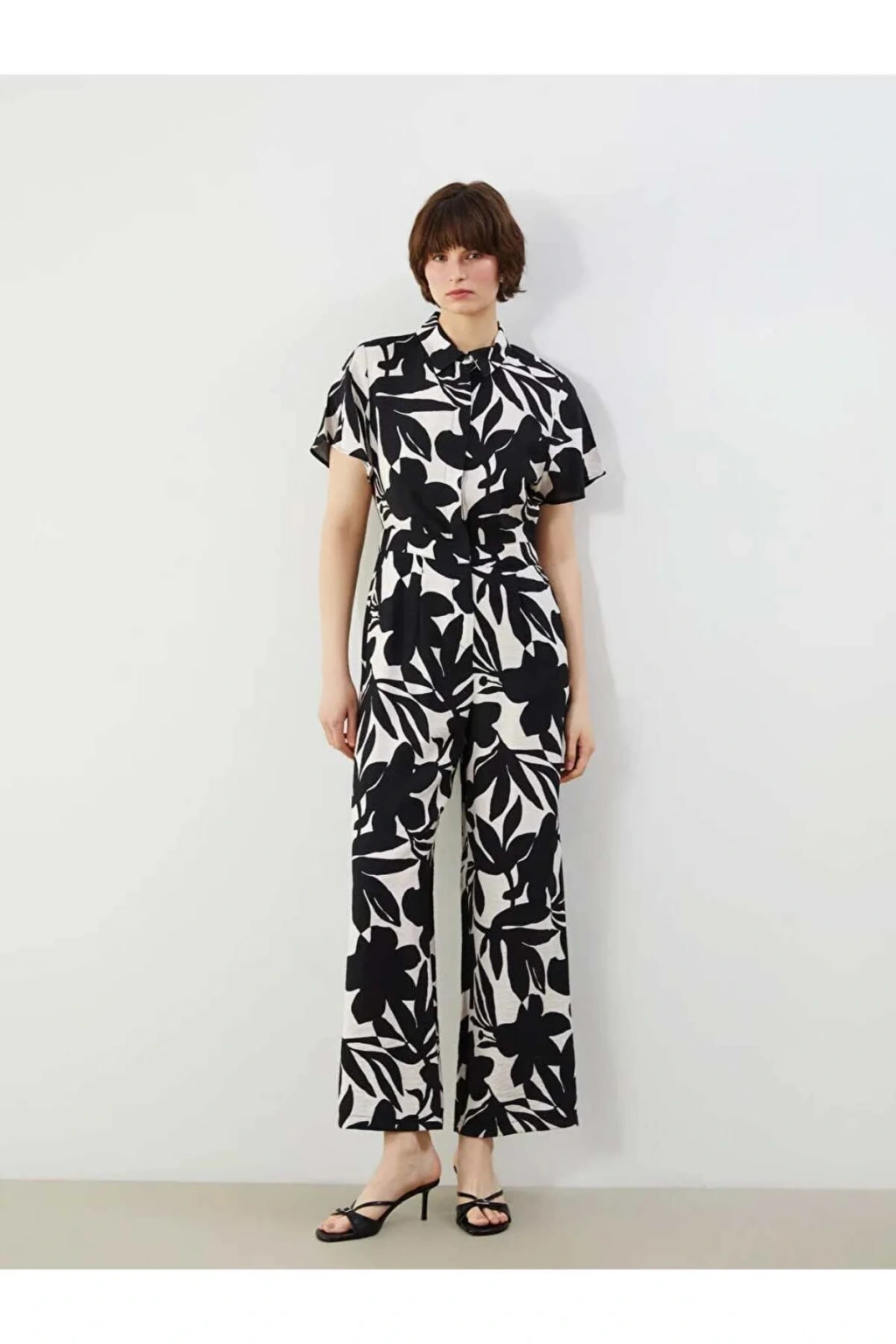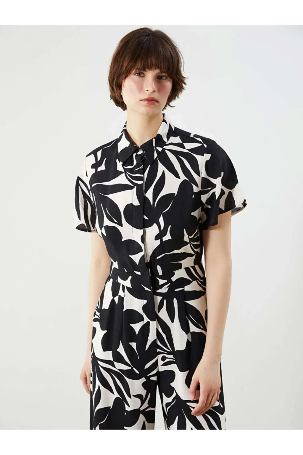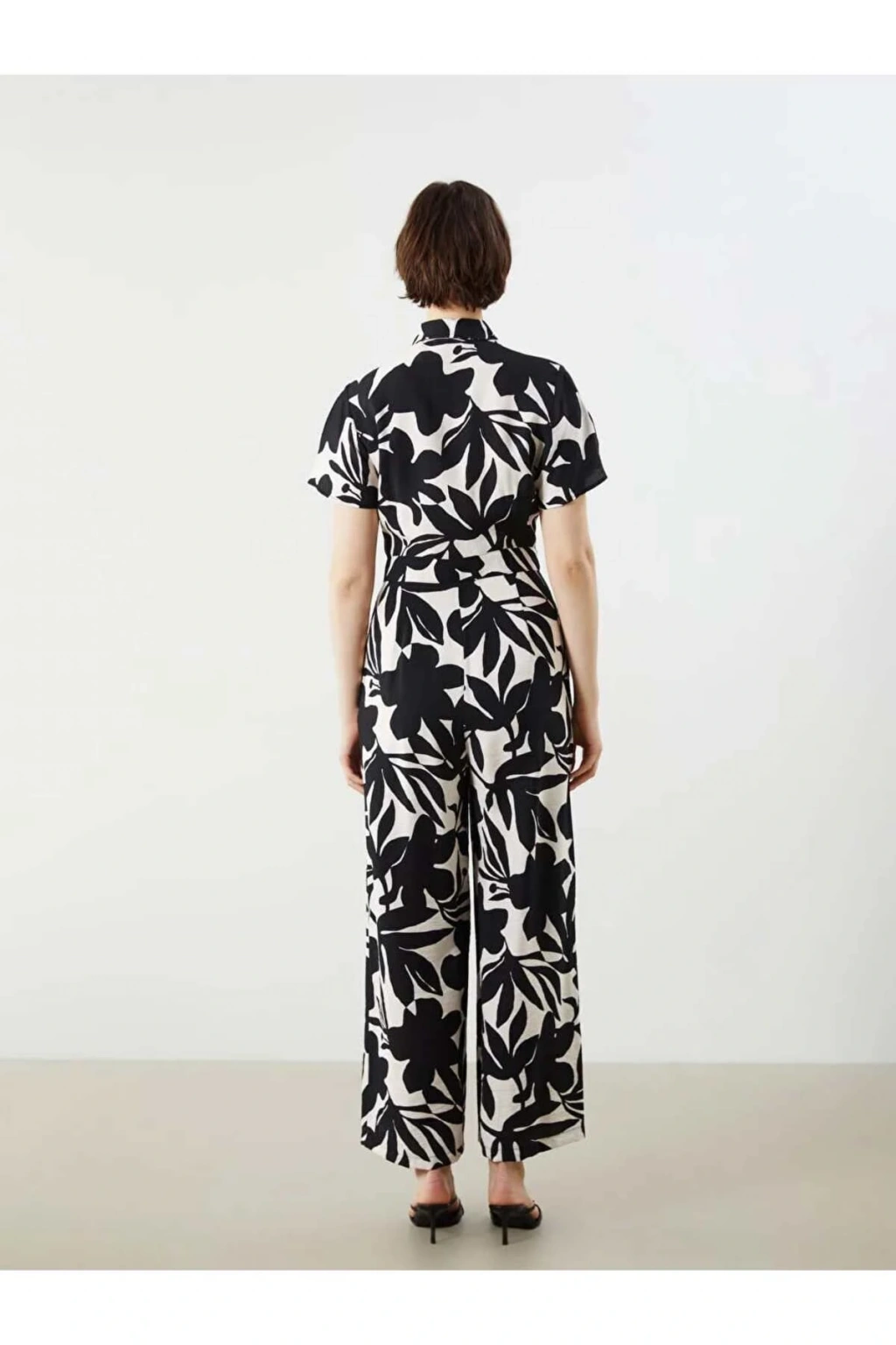Ürün AçıklamasıGömlek yaka, kısa kollu ve desenli kadın tulum, önden düğme kapamalıdır. Geniş paçalıdır ve kuşak aksesuarına sahiptir.Ürün İçeriği ve ÖzellikleriÜrün İçeriği: Göğüs: