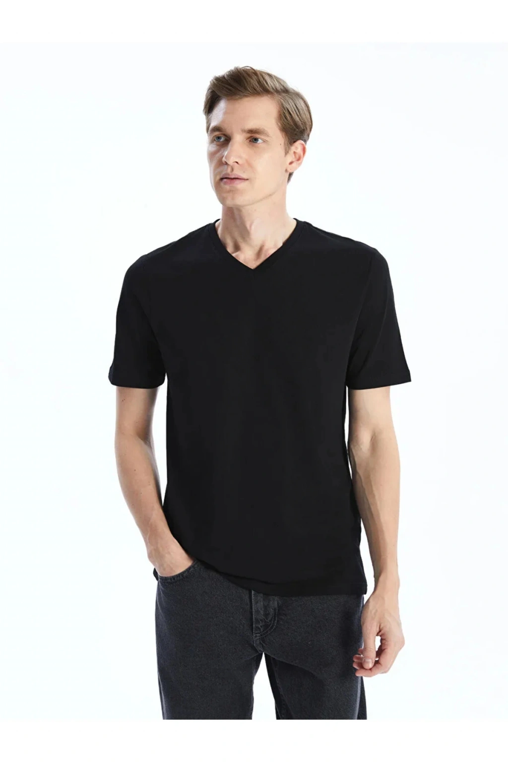 V yaka tasarımıyla modern bir görünüm sunan bu tişört, pamuk karışımlı kumaşı sayesinde cildinize yumuşak bir dokunuş sağlar. Düz ve sade yapısıyla her tarza uyum sağlar.