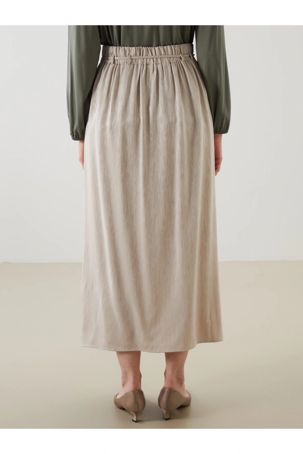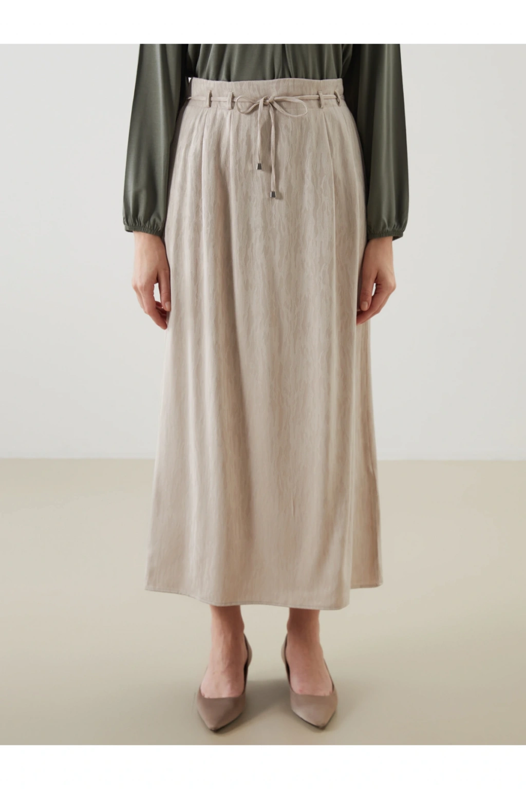 Loose fit A kesim kadın etek, belindeki bağlama detayıyla kişisel uyum sağlar.; Yumuşak dokulu kumaşı ise gün boyu rahatlık ve zarif bir görünüm sunar.
