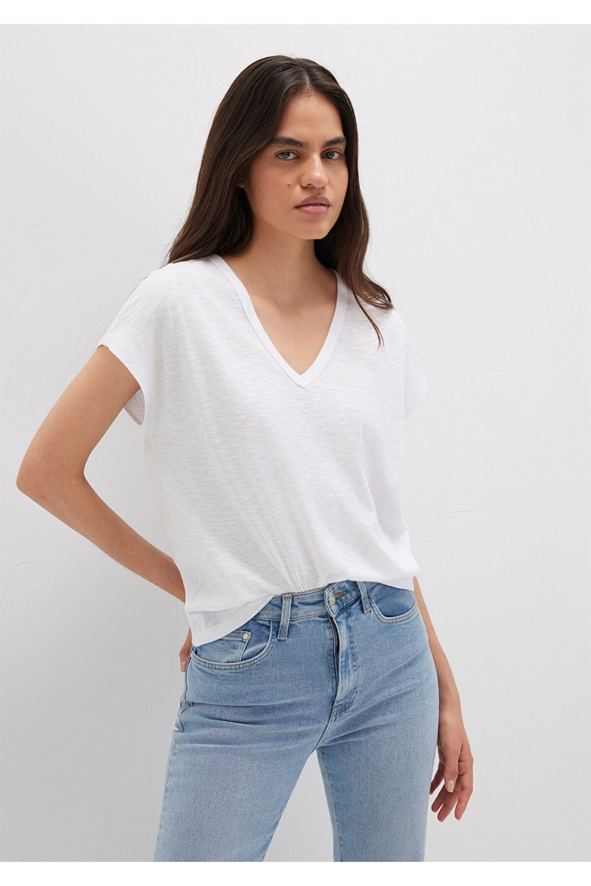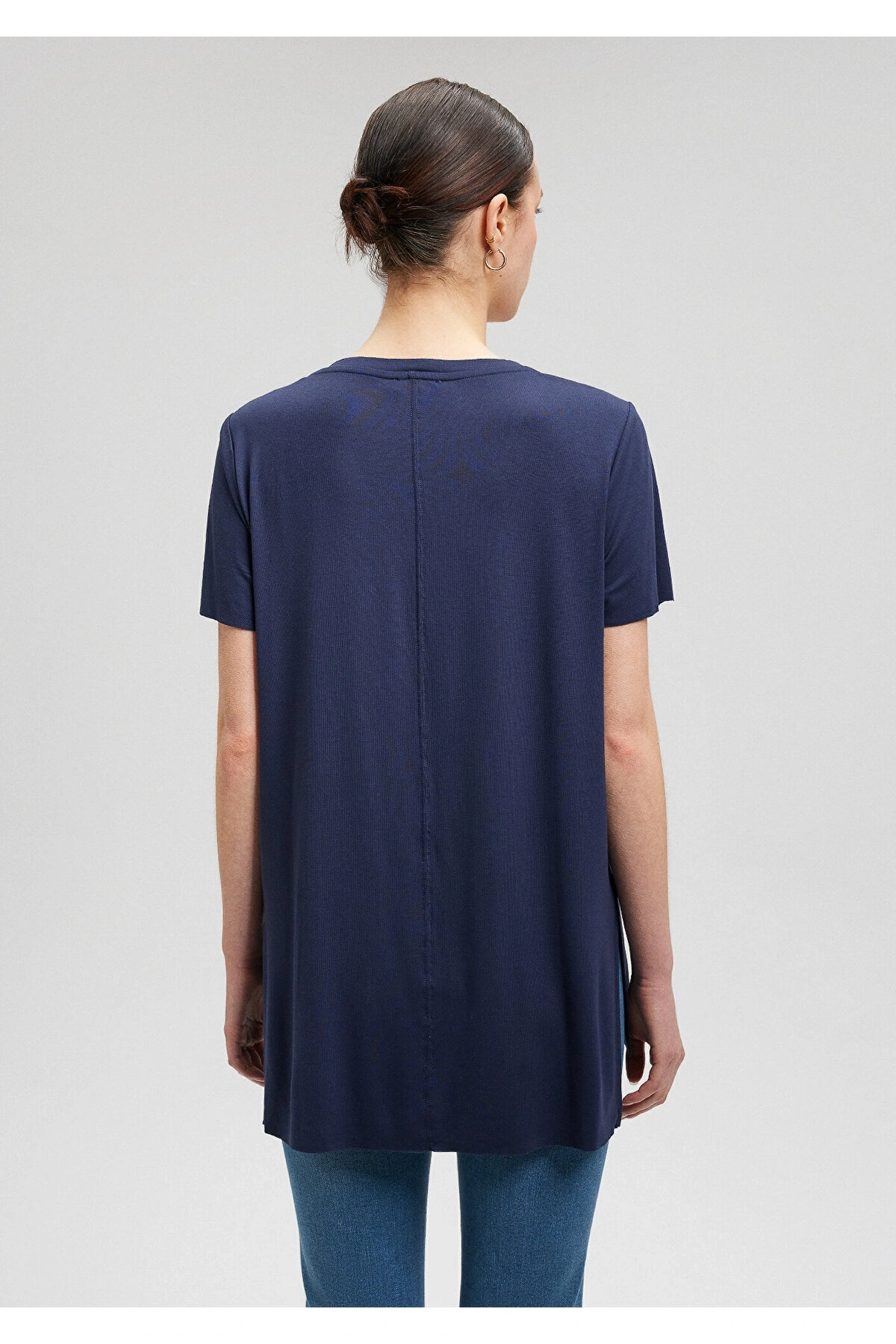 Mavi V Yaka Lacivert Basic Viskoz Tişört Loose Fit / Bol Rahat Kesim