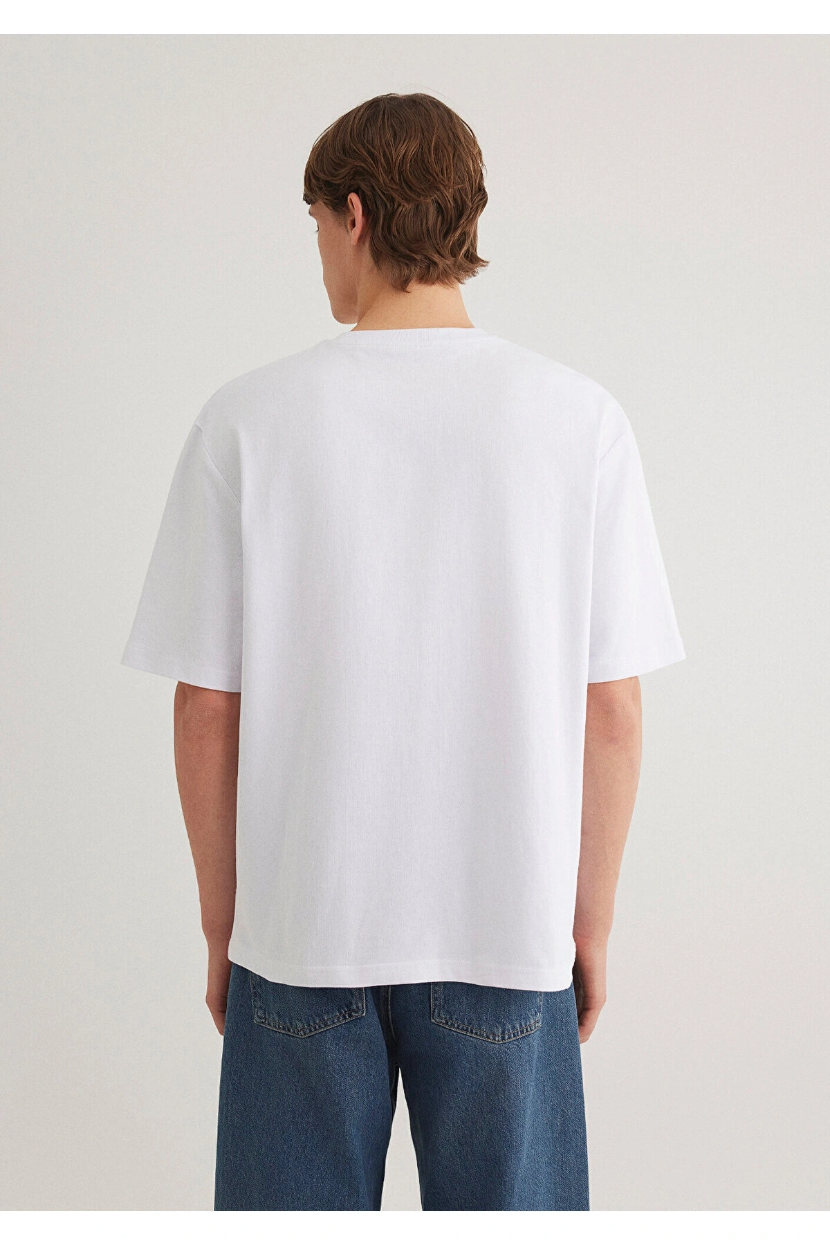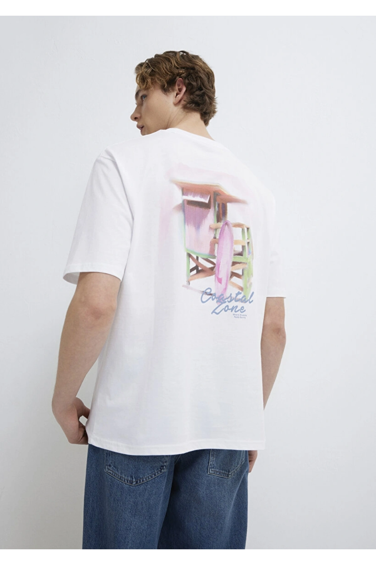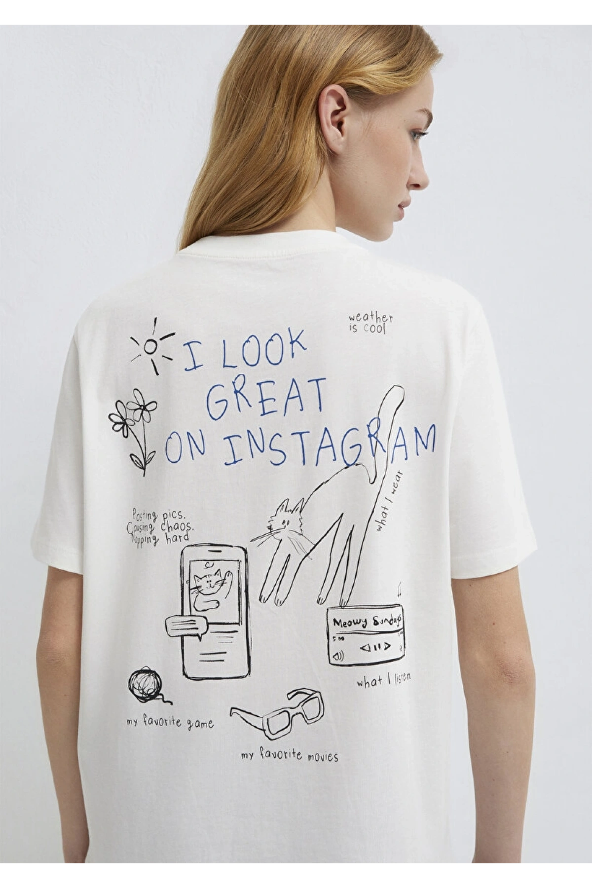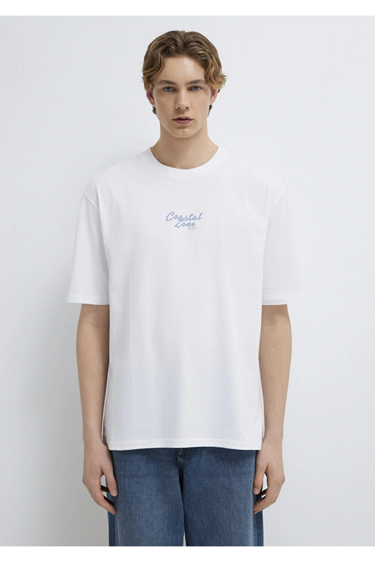Mavi Baskılı Beyaz Tişört Loose Fit / Bol Rahat Kesim