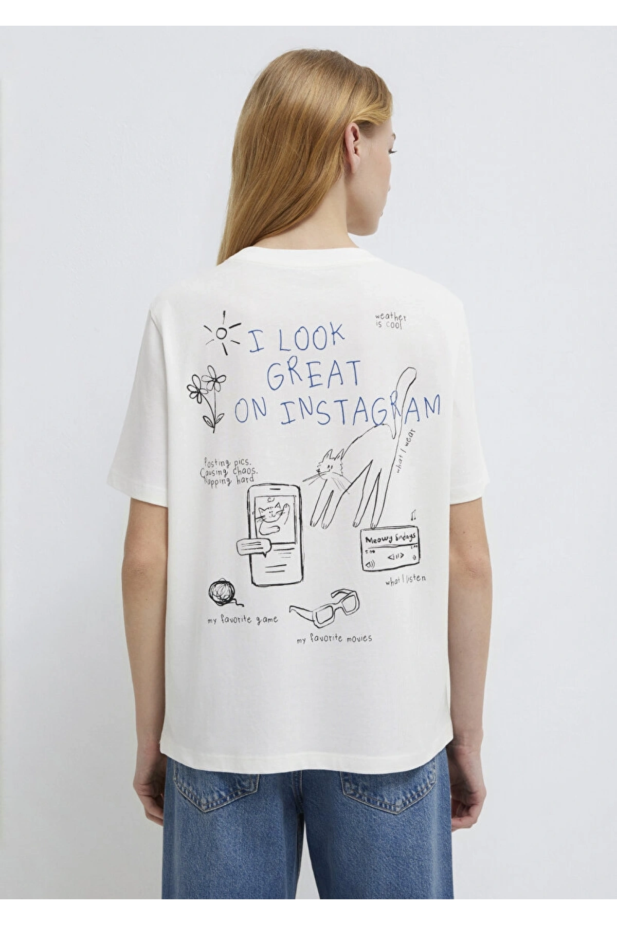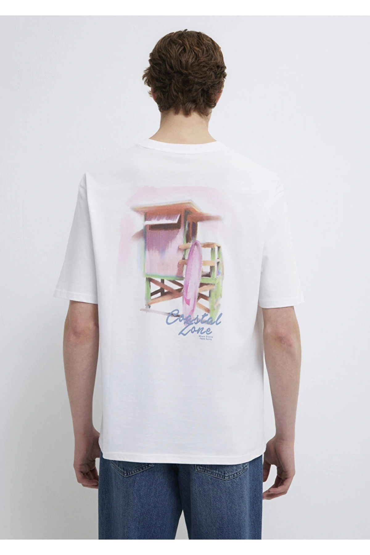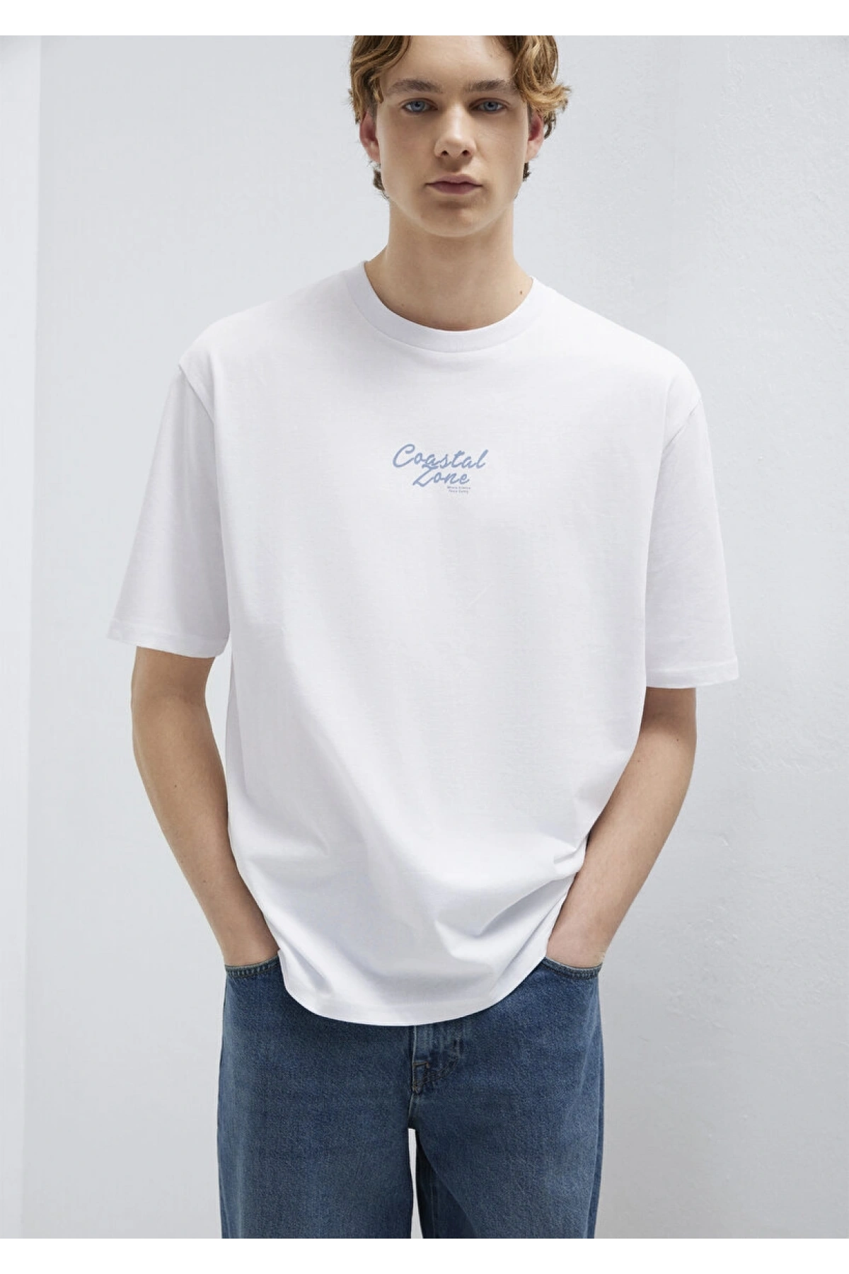 Mavi Baskılı Beyaz Tişört Loose Fit / Bol Rahat Kesim