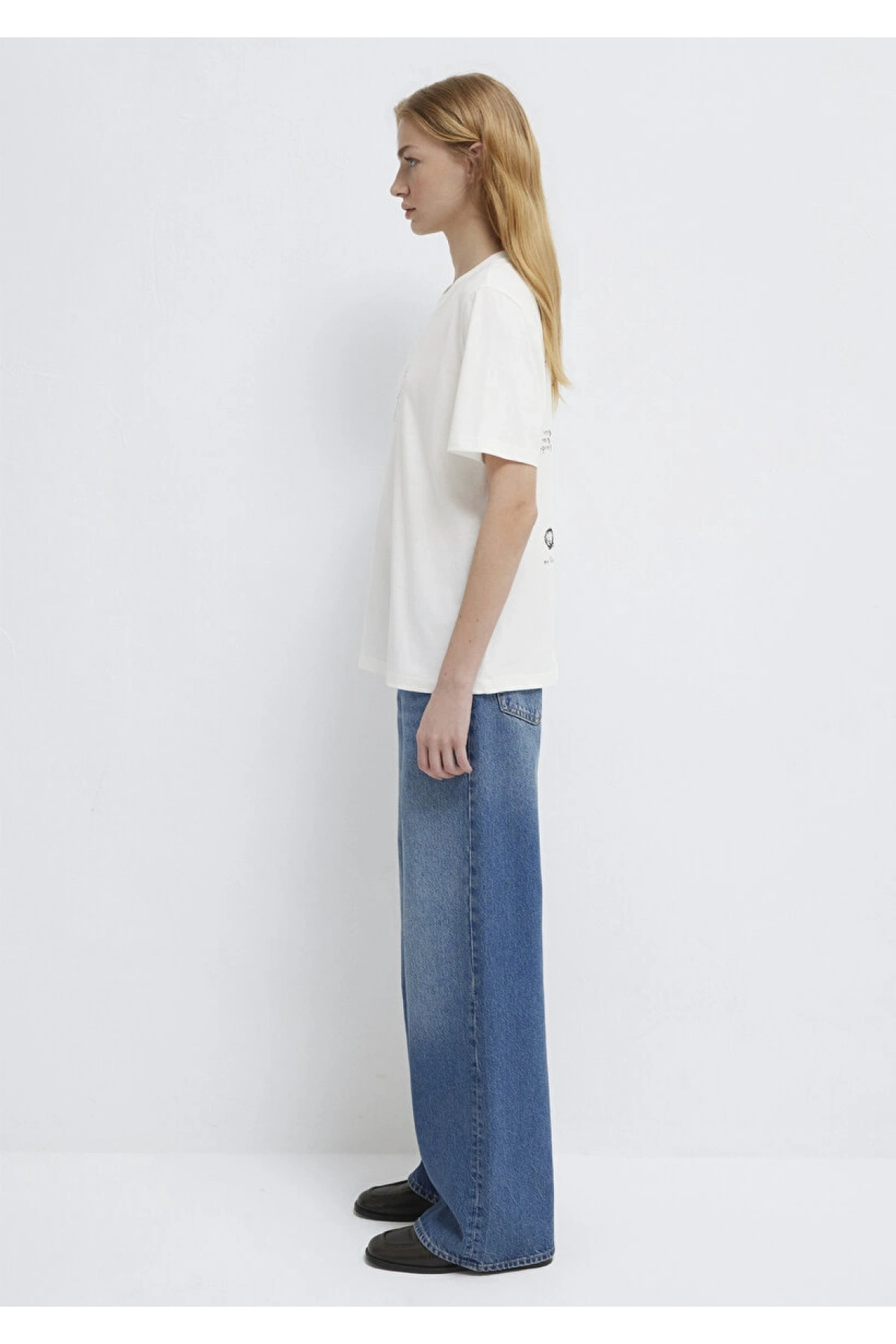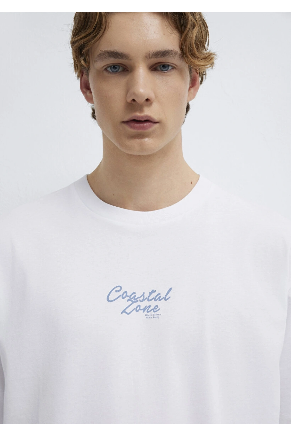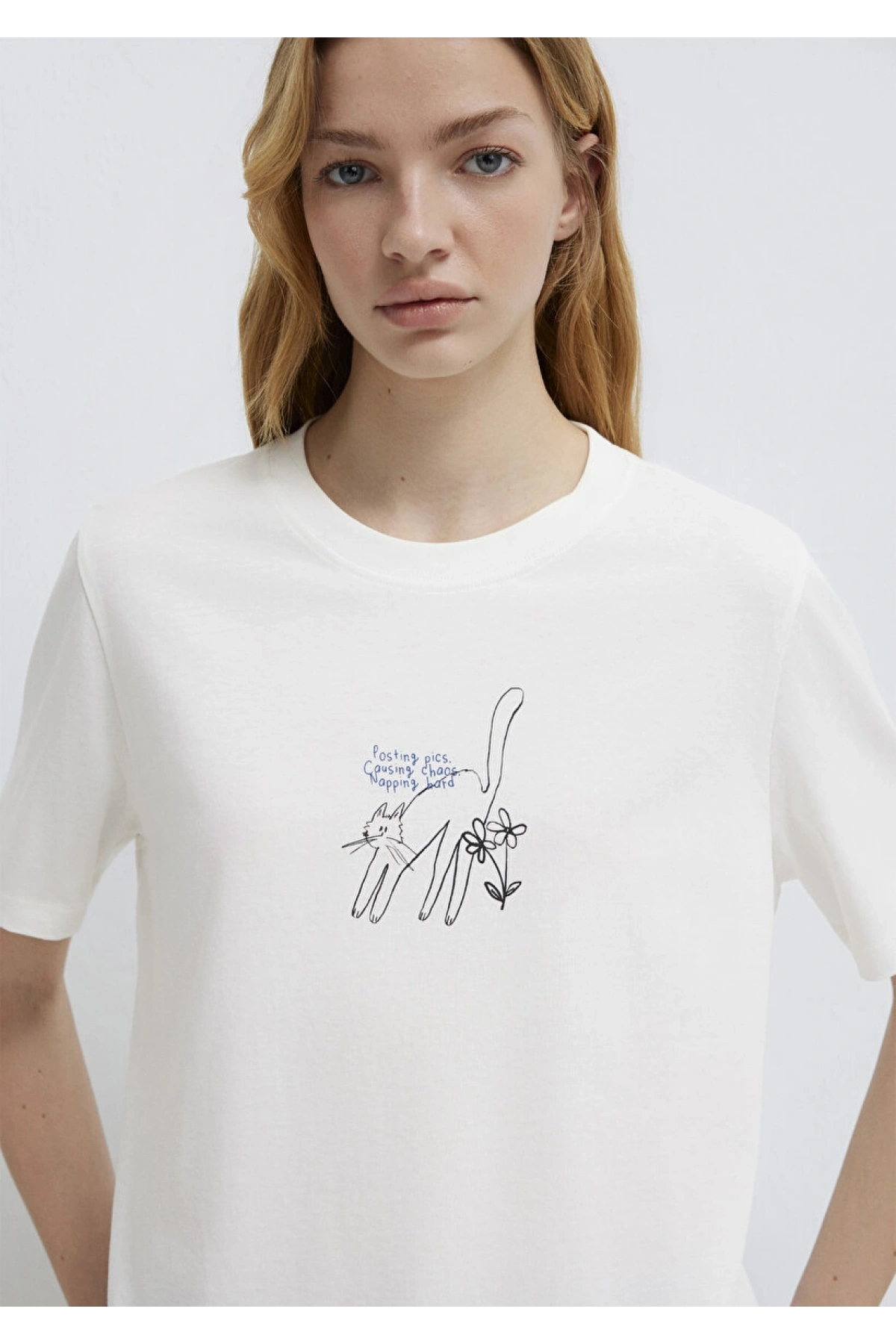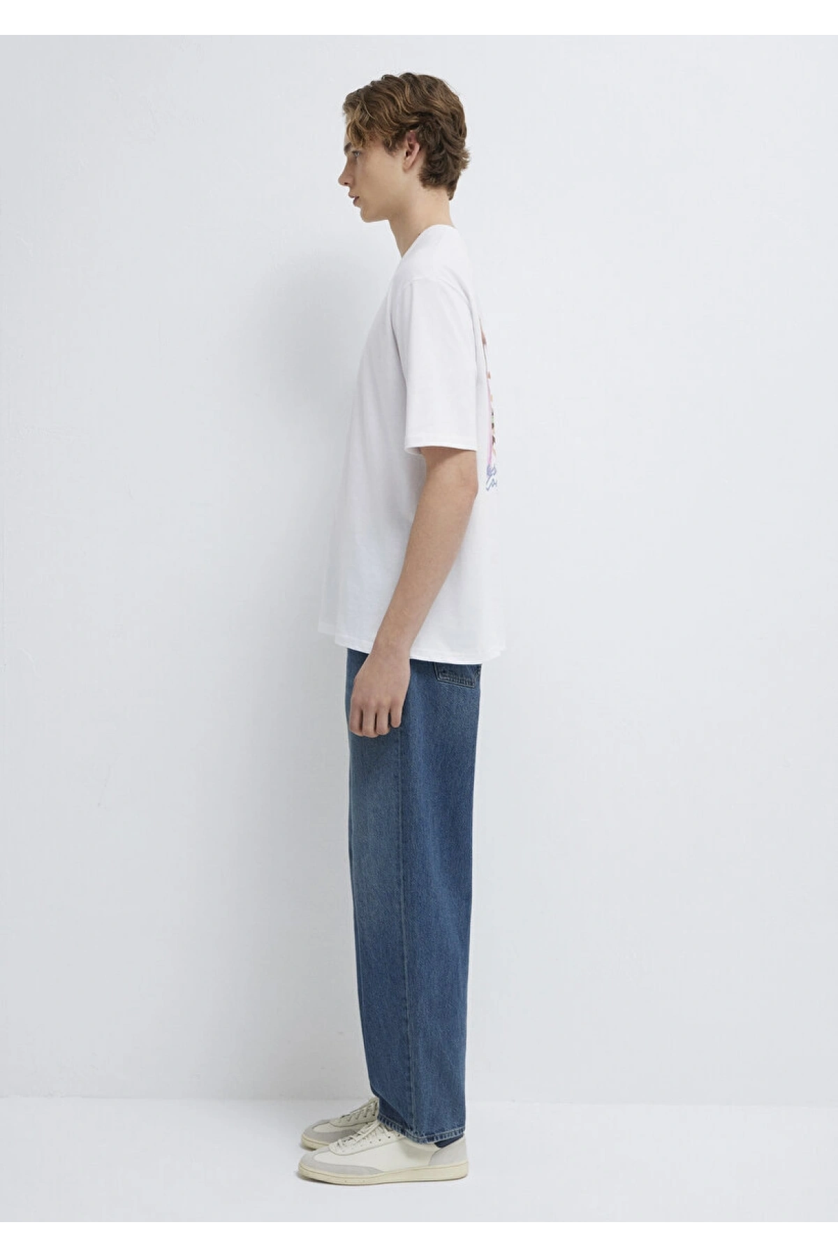 Mavi Baskılı Beyaz Tişört Loose Fit / Bol Rahat Kesim