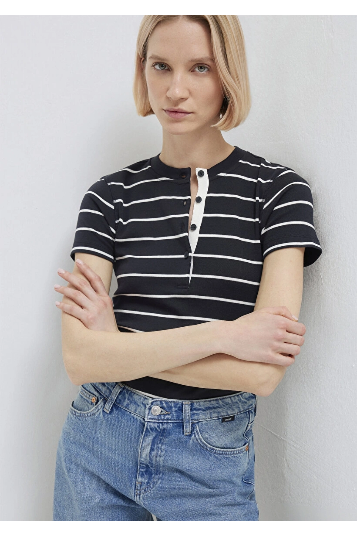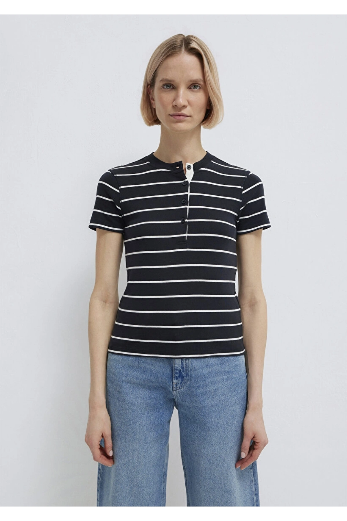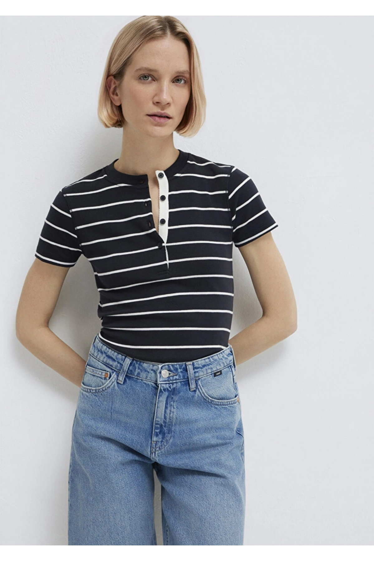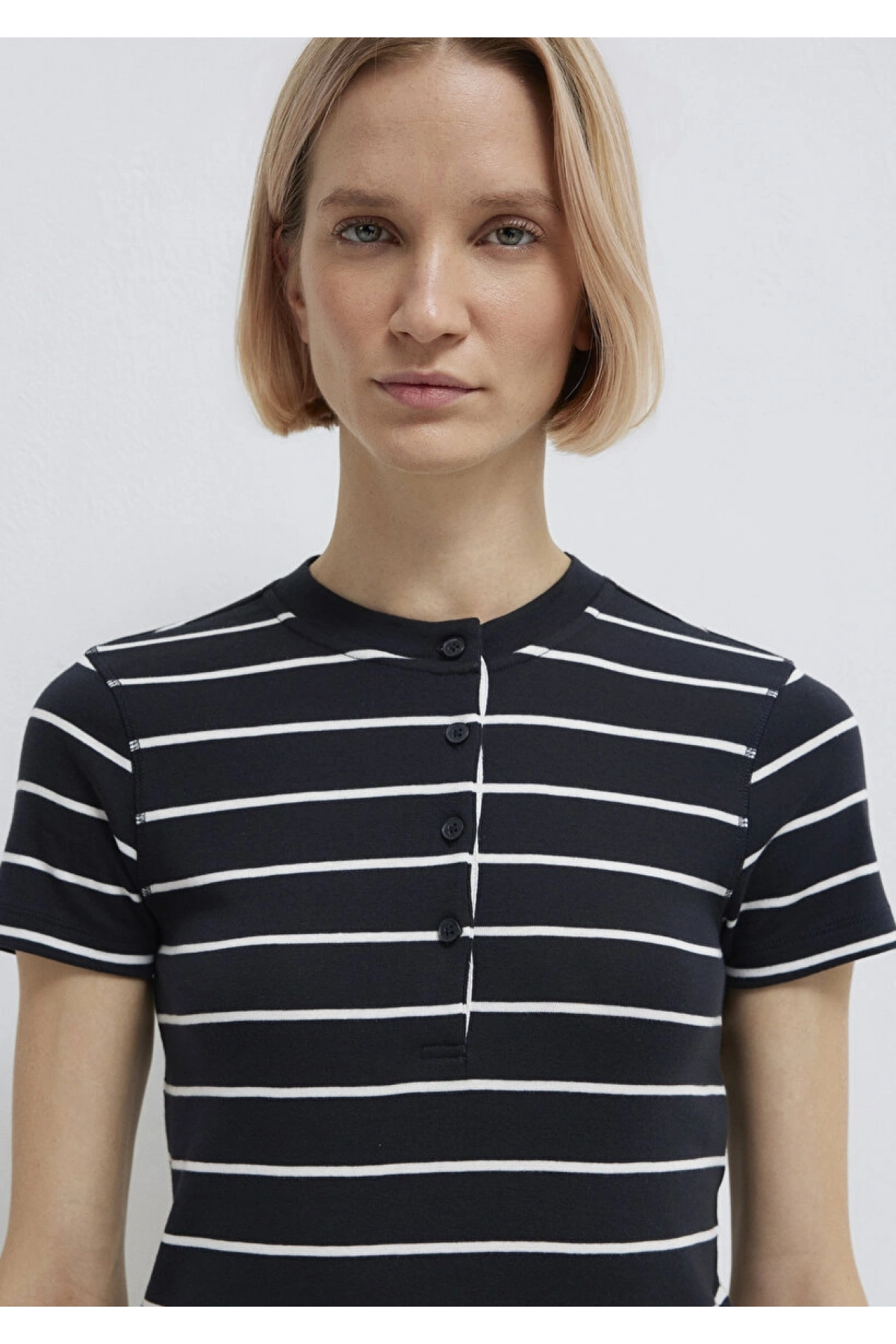 MAVİ Yarı Düğmeli Çizgili Lacivert Tişört