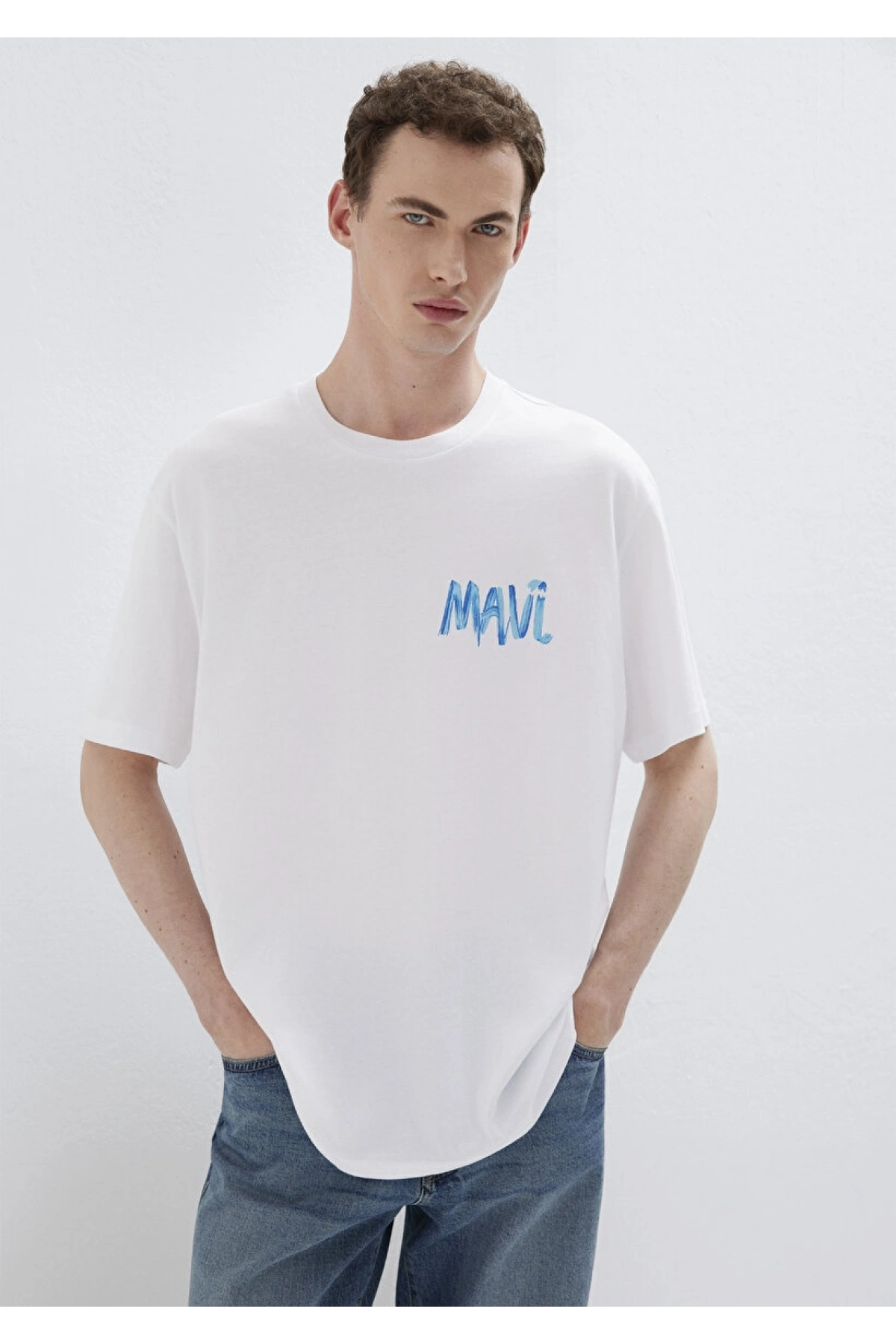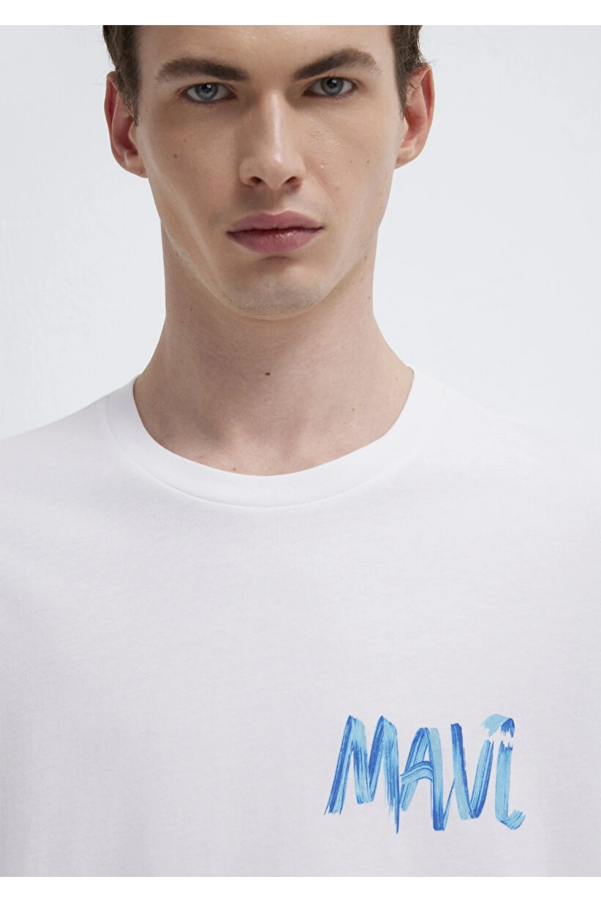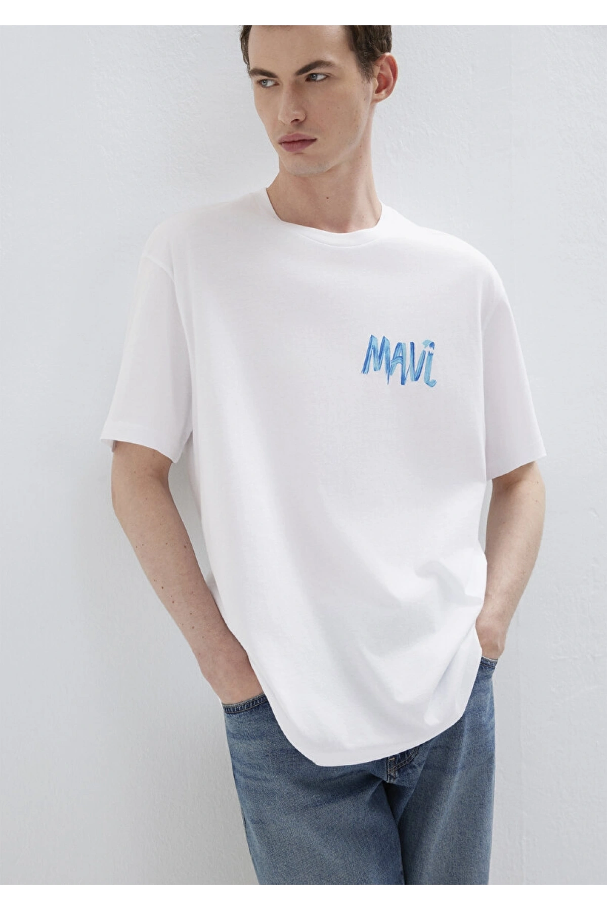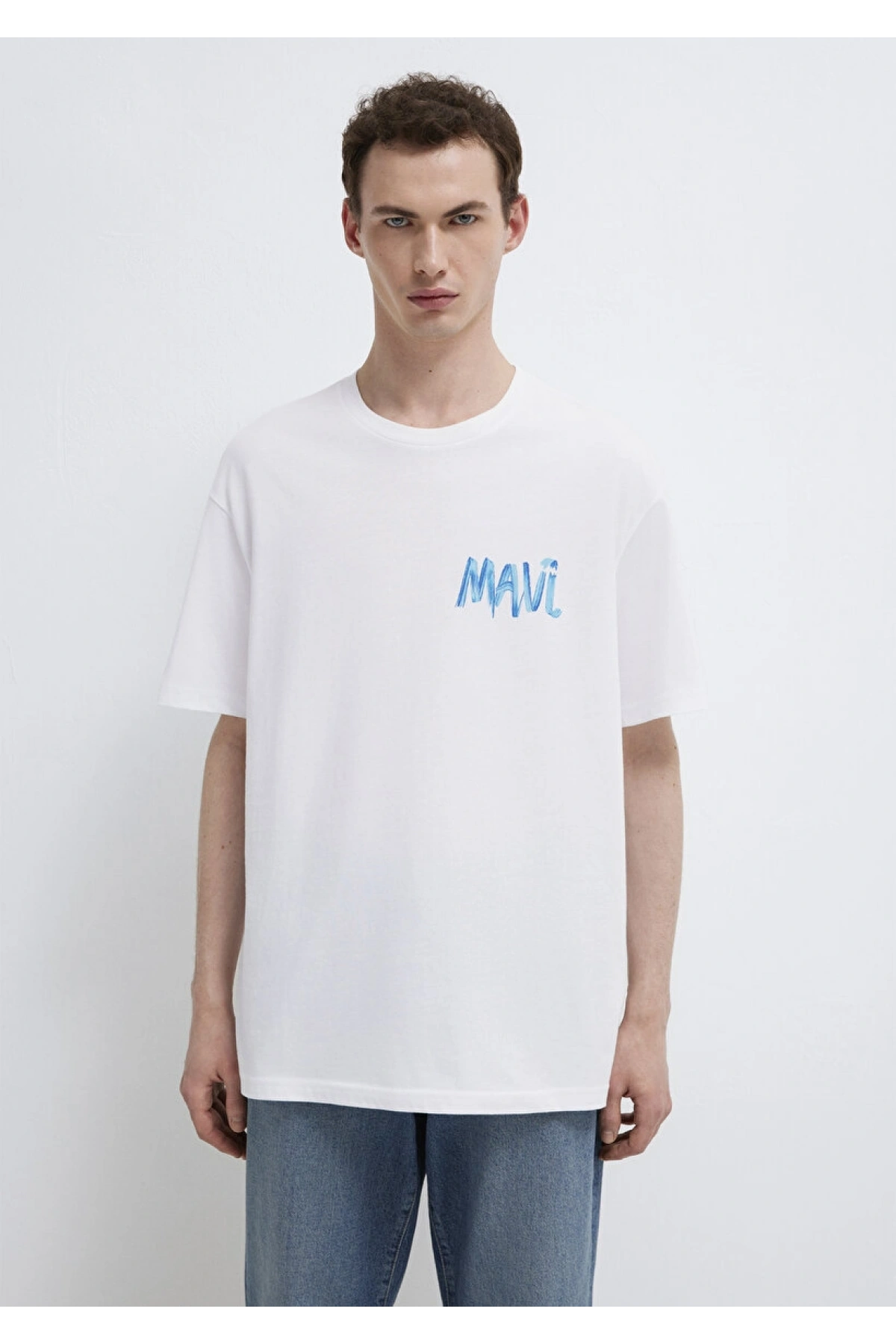 Mavi Baskılı Beyaz Tişört