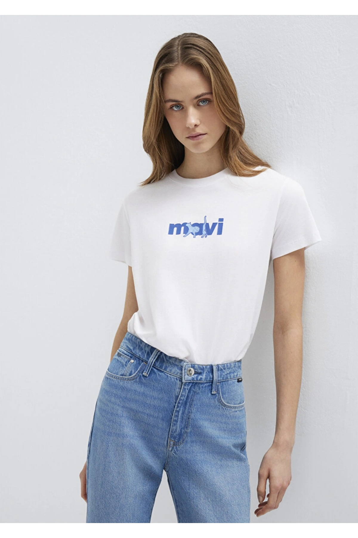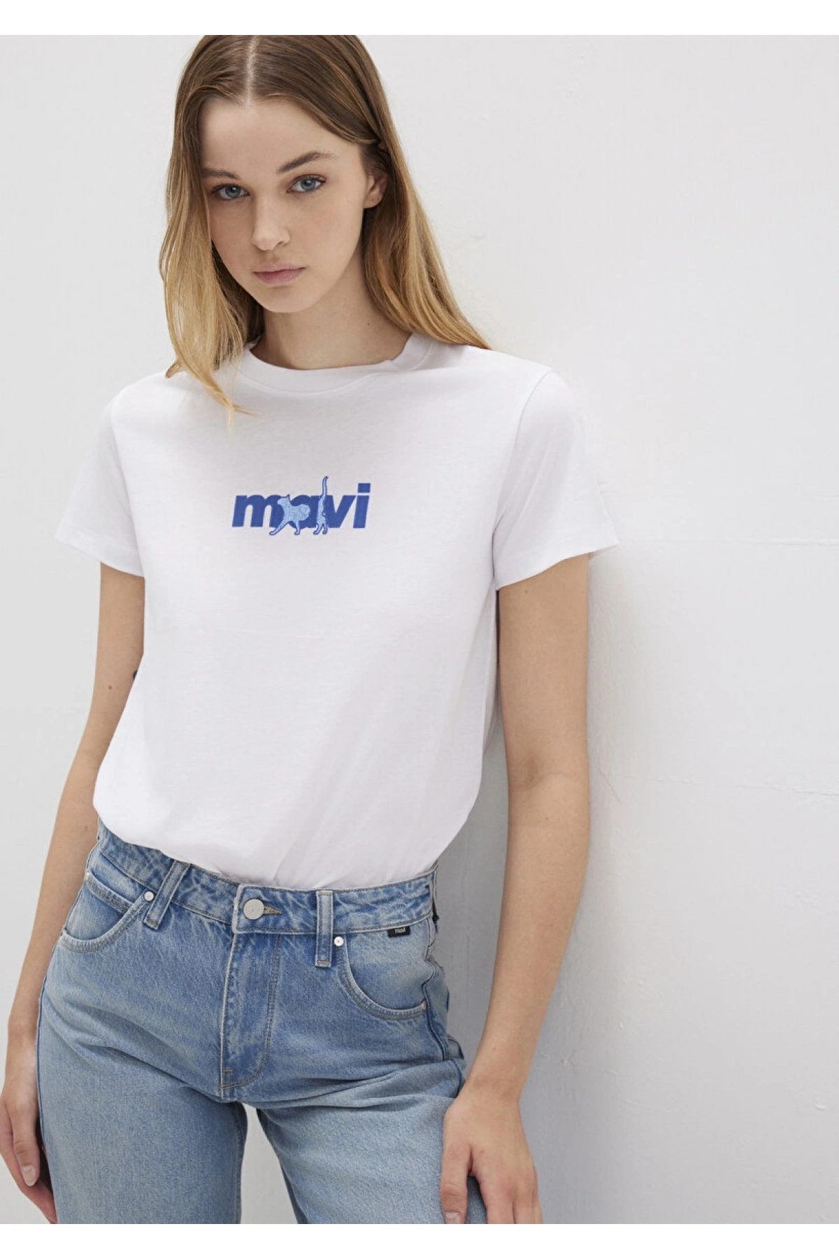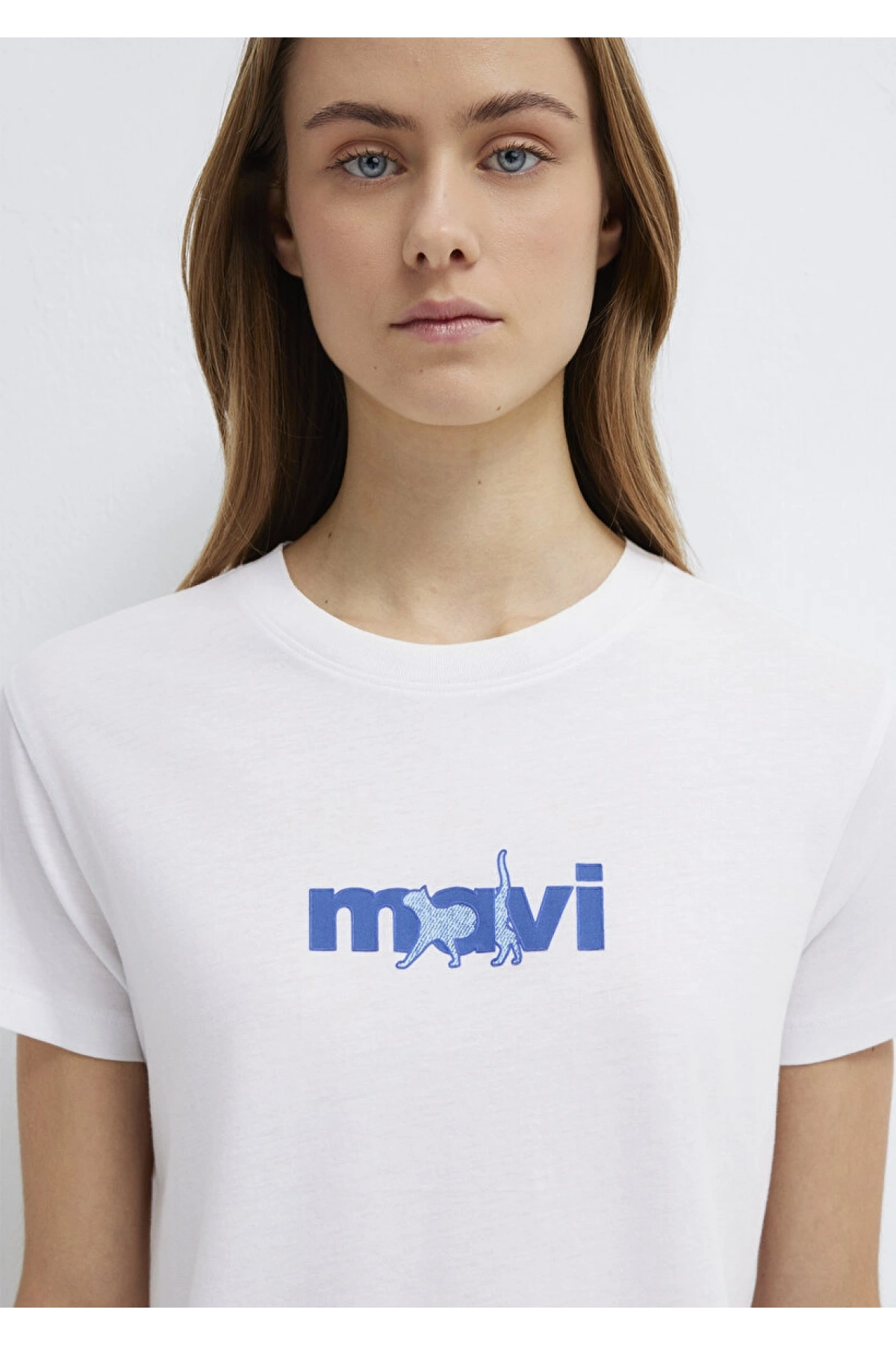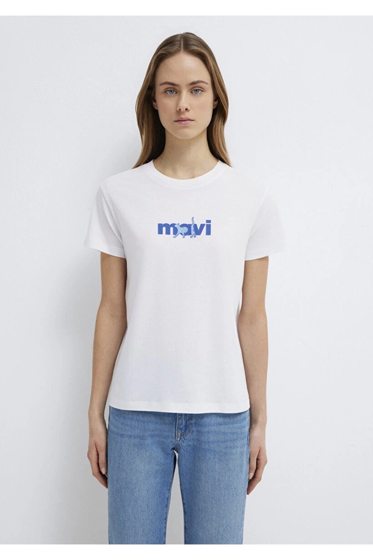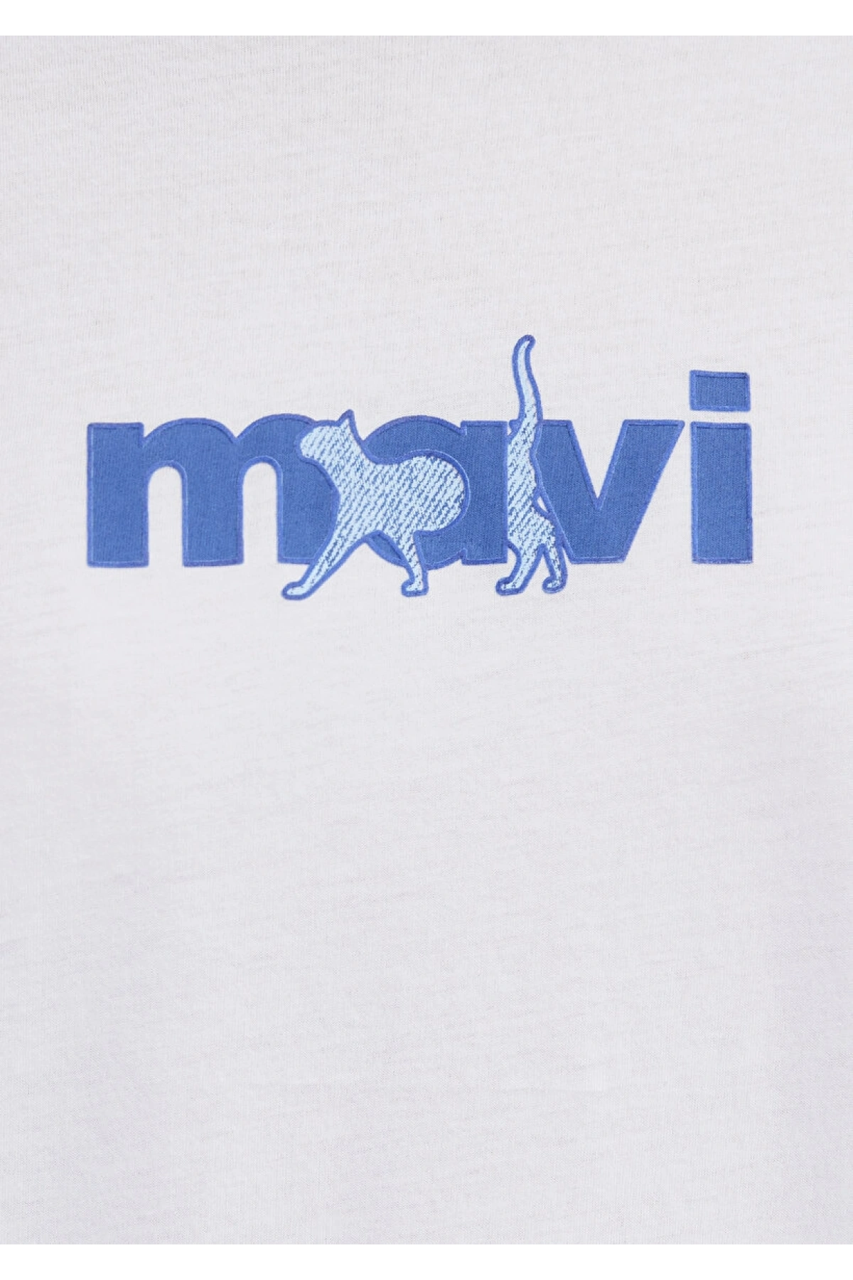 Mavi Kedi Baskılı Beyaz Tişört