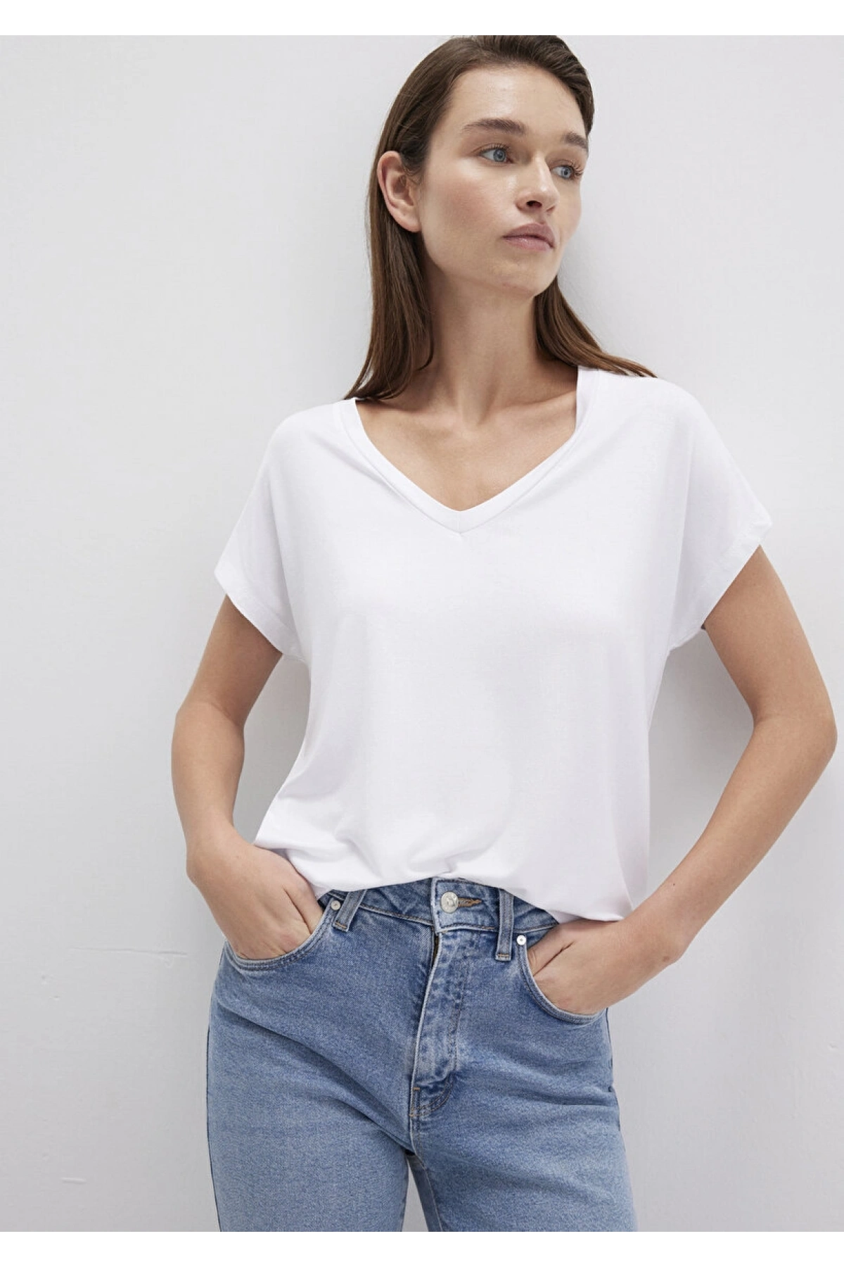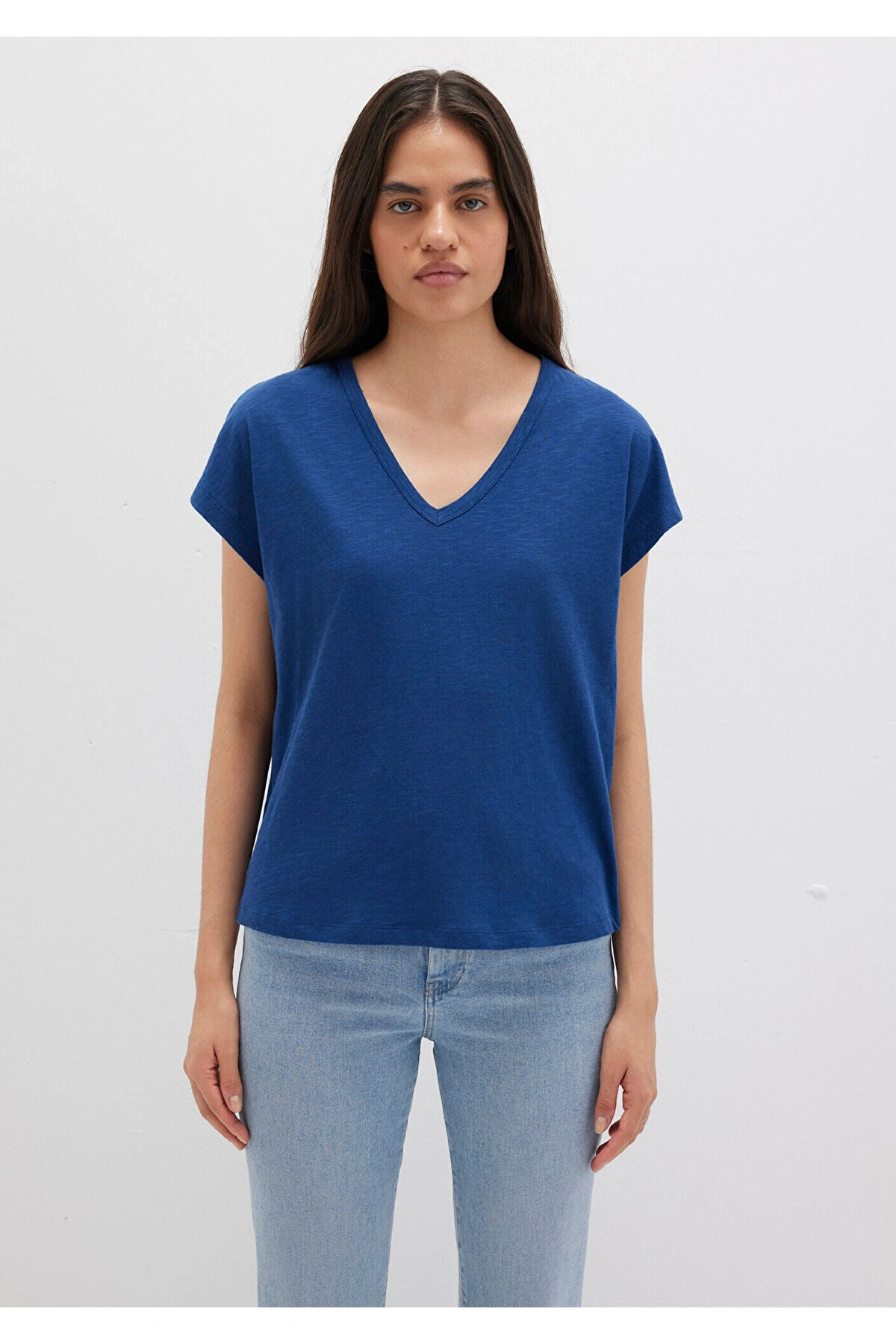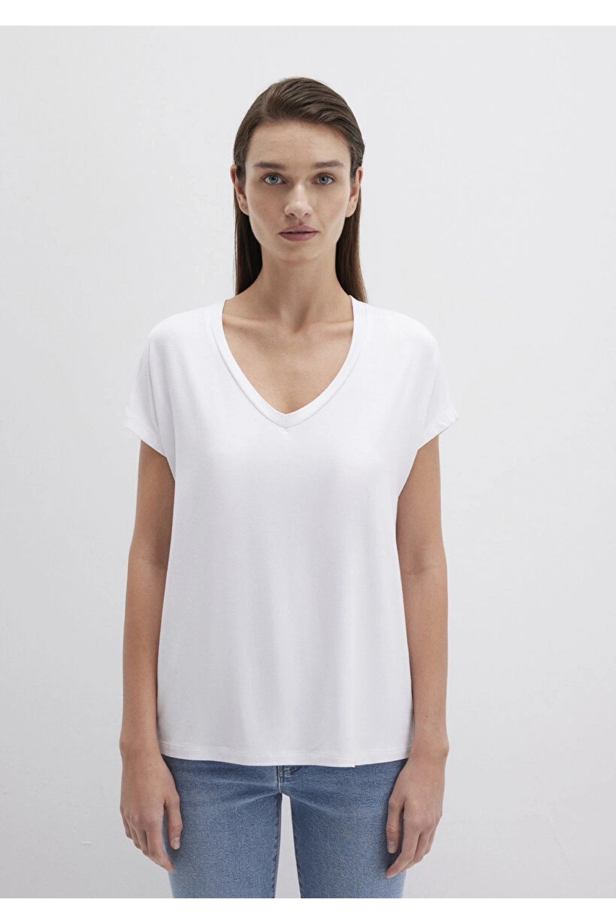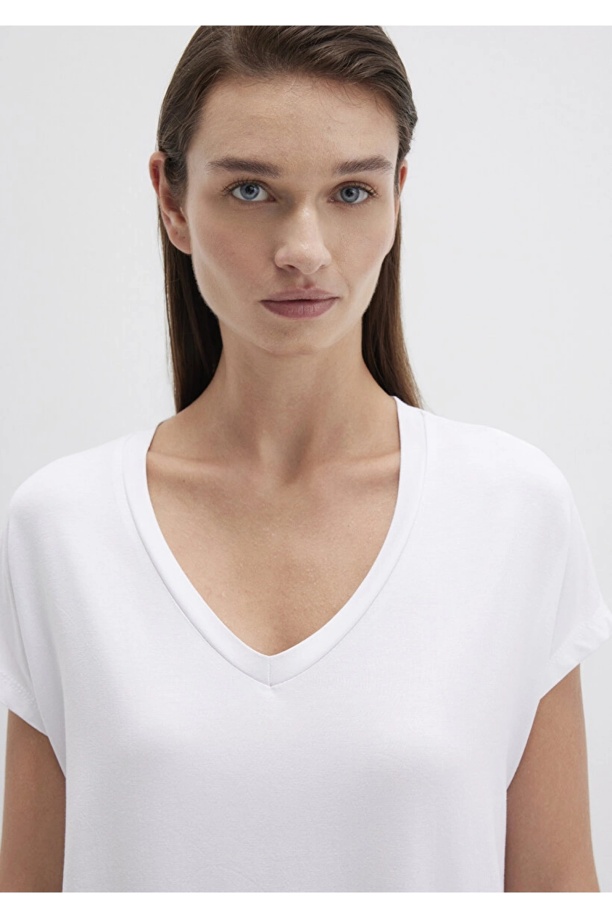 Mavi V Yaka Beyaz Basic Viskoz Tişört Regular Fit / Normal Kesim