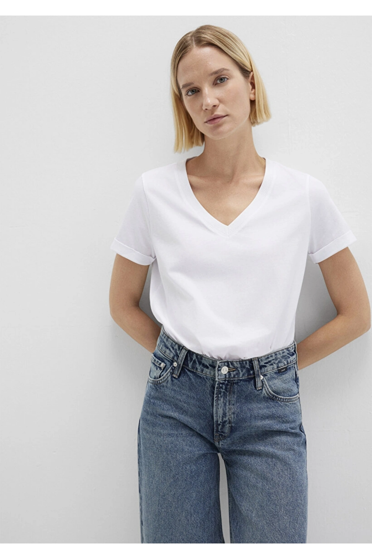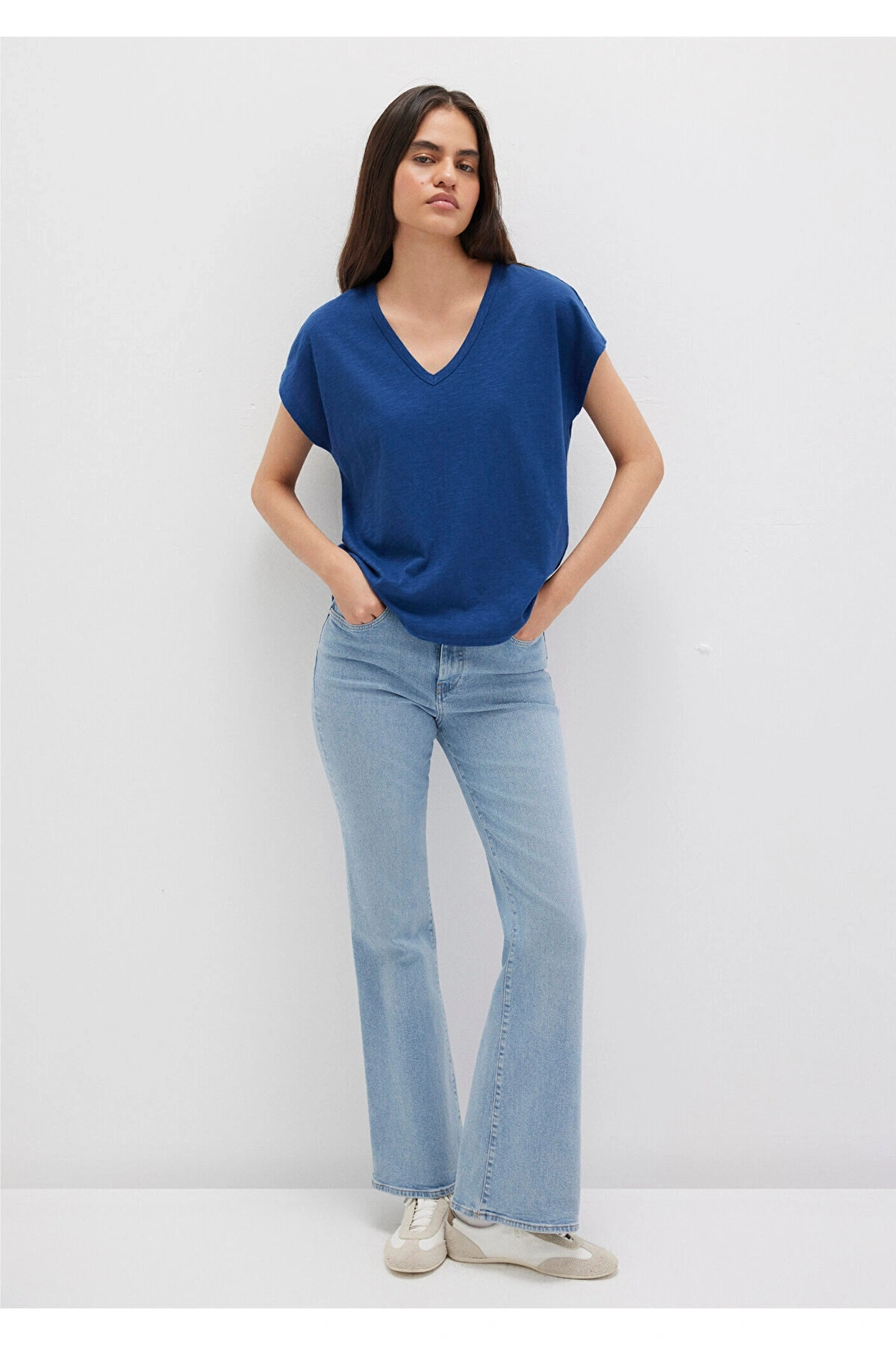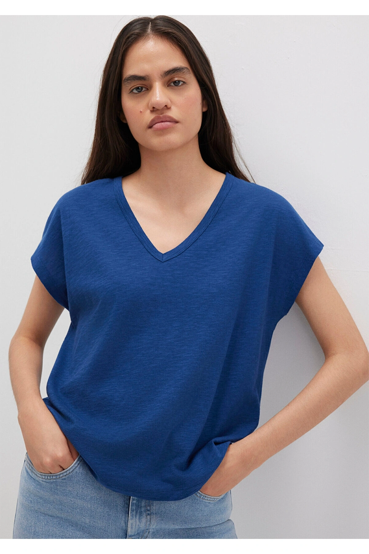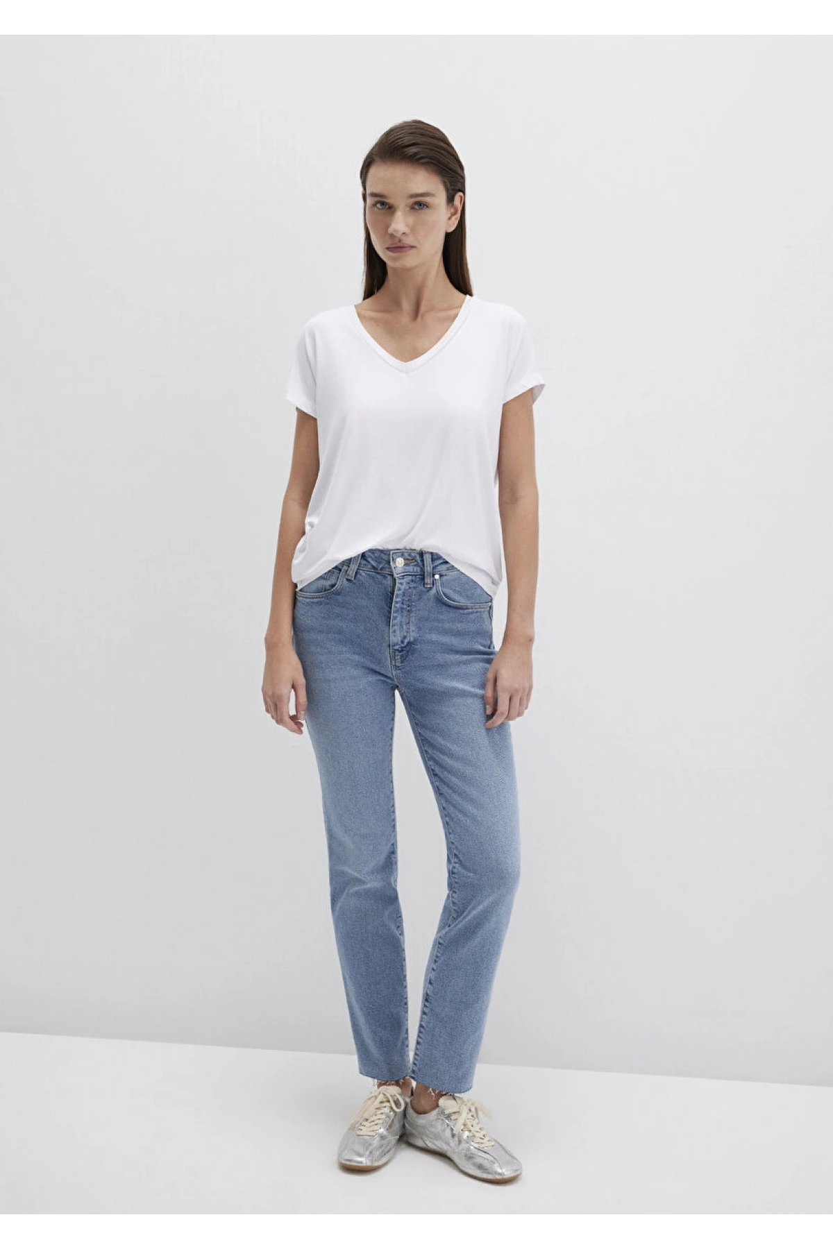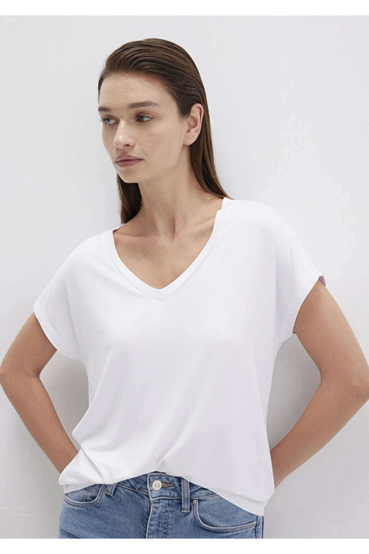 Mavi V Yaka Beyaz Basic Viskoz Tişört Regular Fit / Normal Kesim