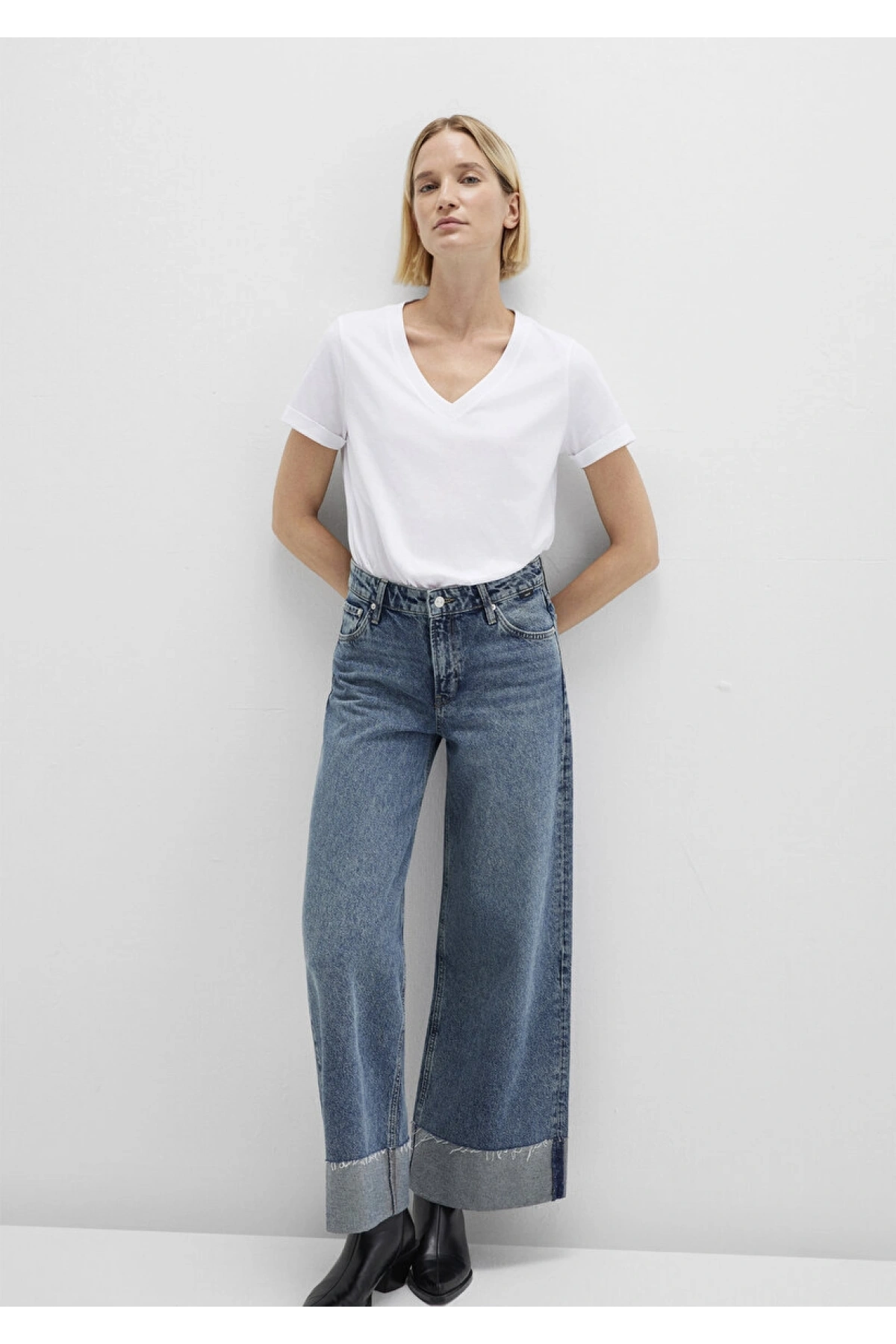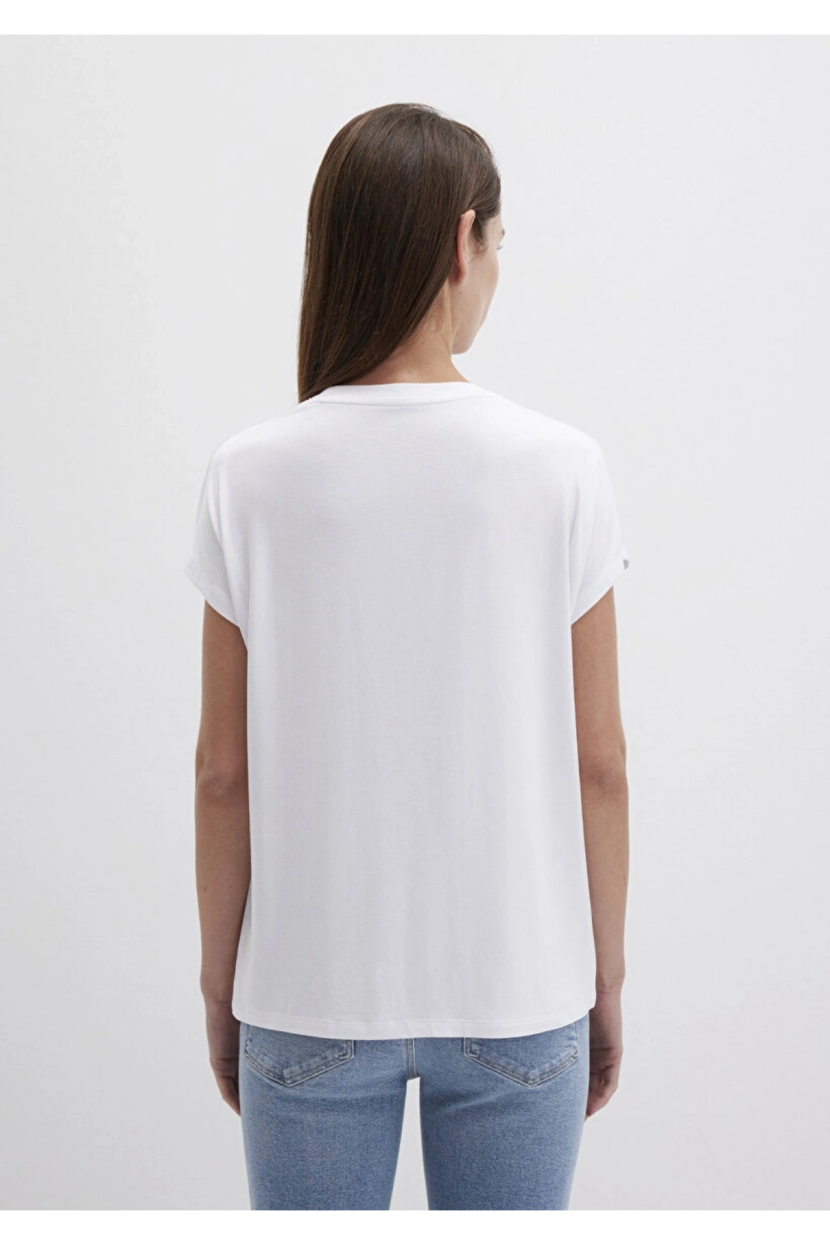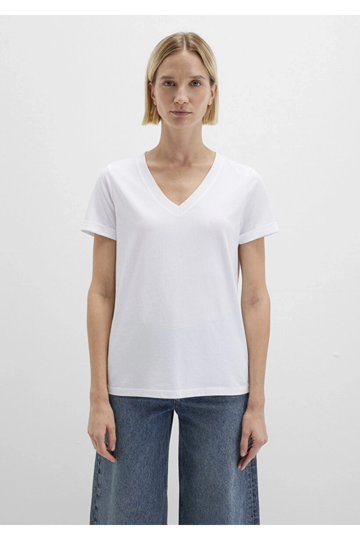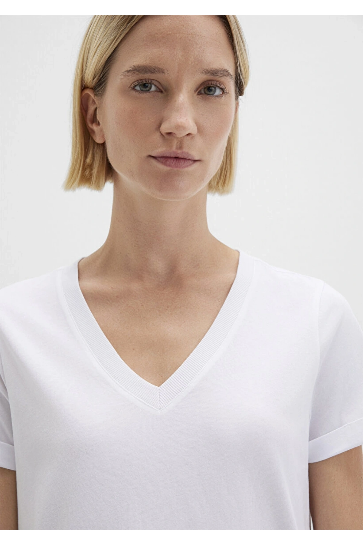 Mavi V Yaka Beyaz Basic Viskoz Tişört Regular Fit / Normal Kesim