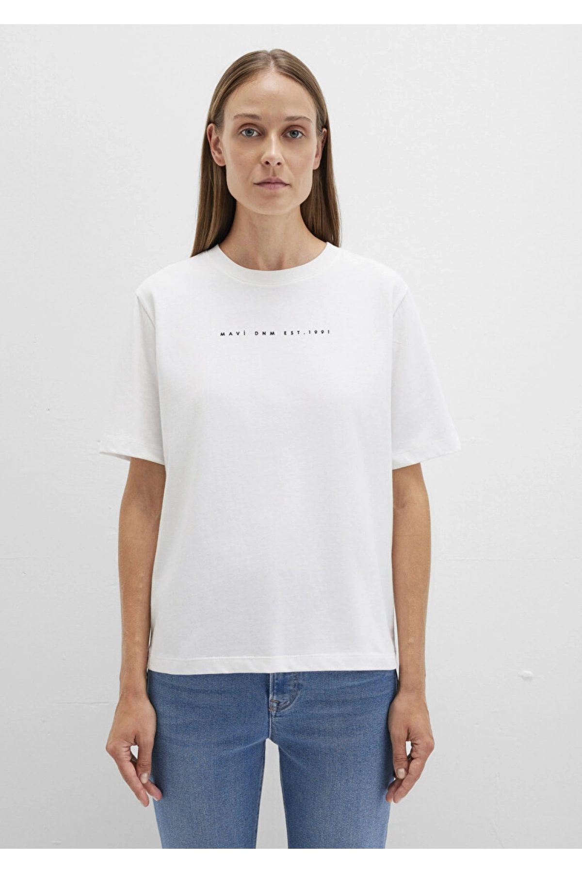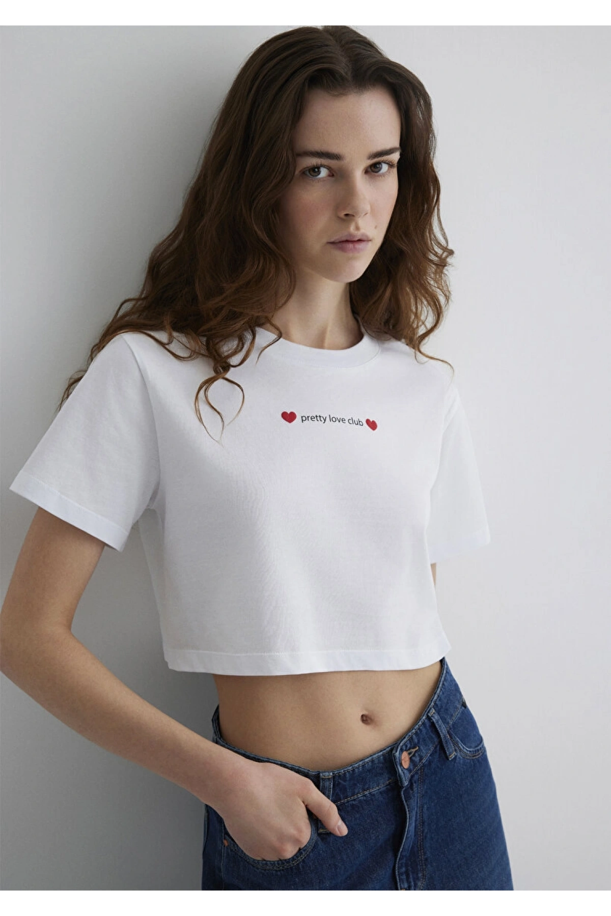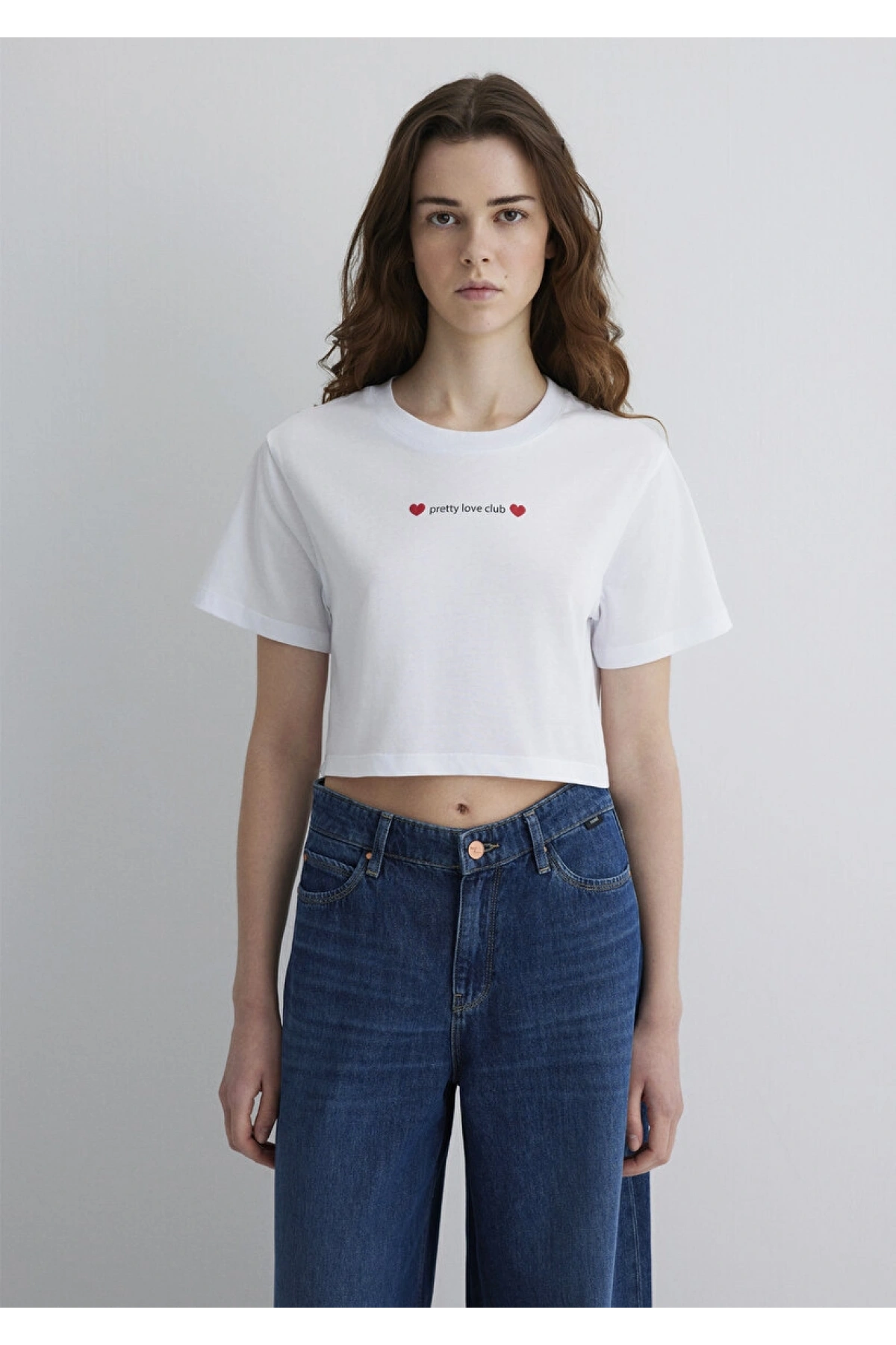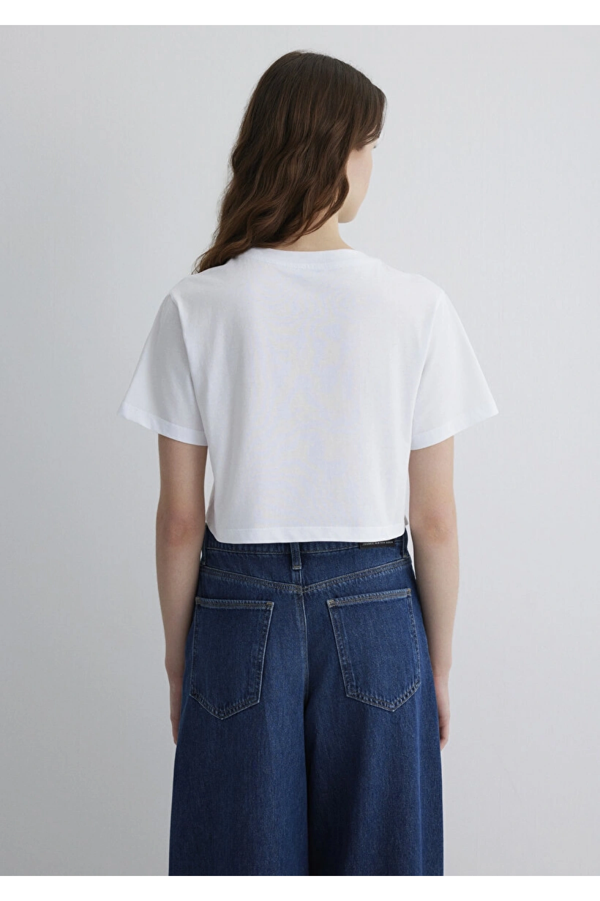 Mavi Baskılı Beyaz Crop Tişört Regular Fit / Normal Kesim