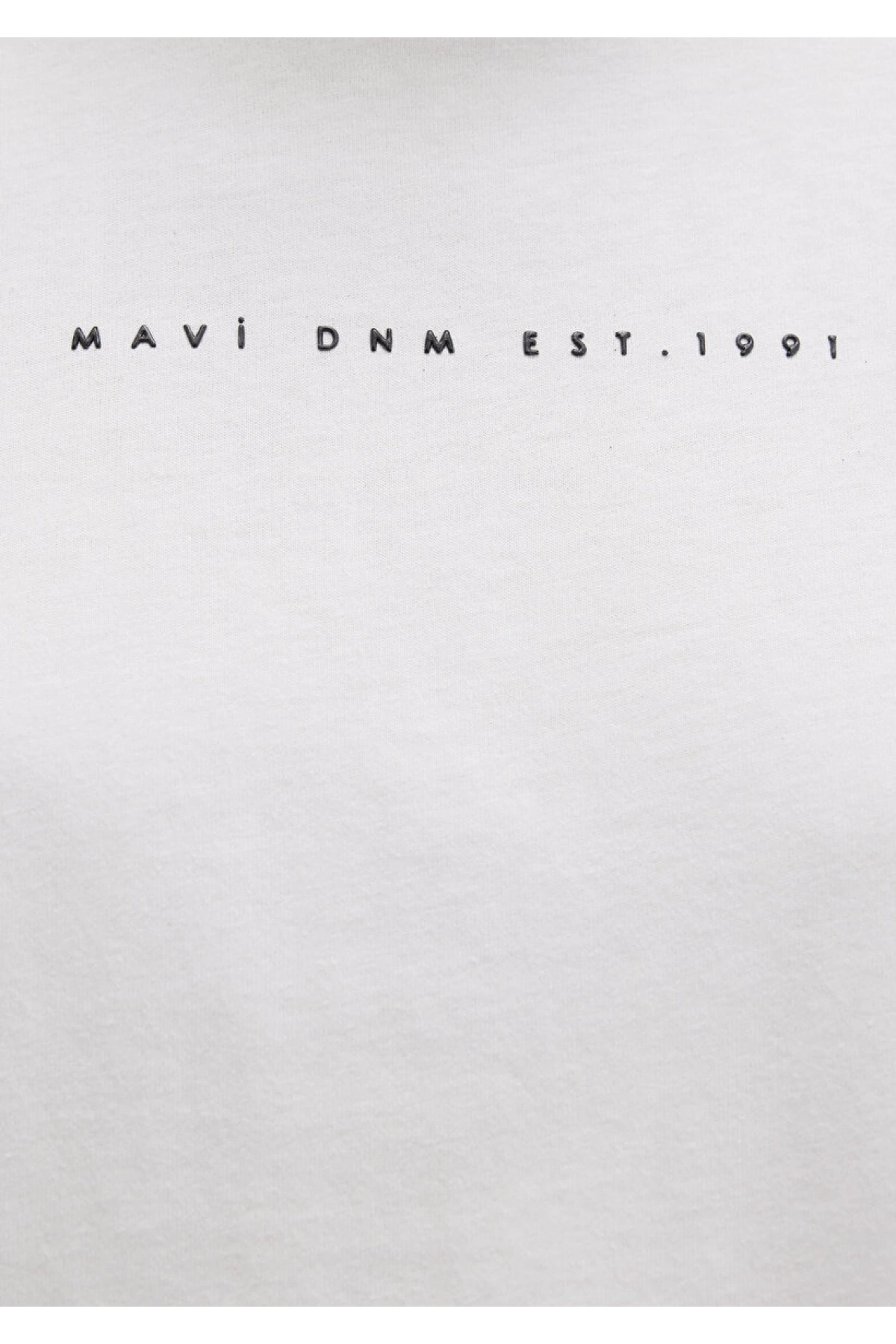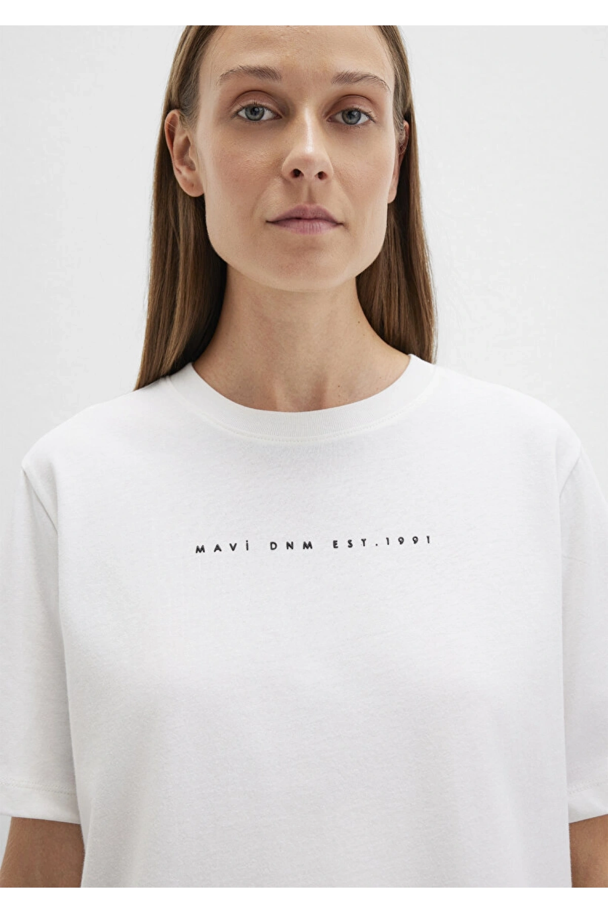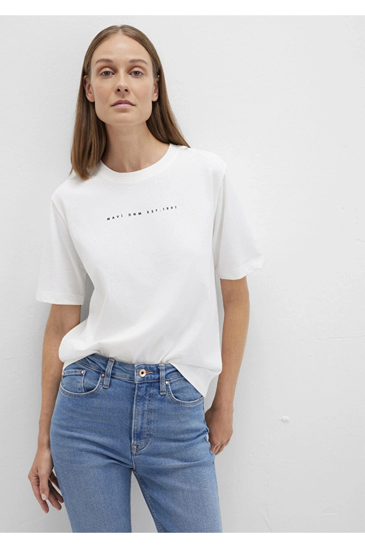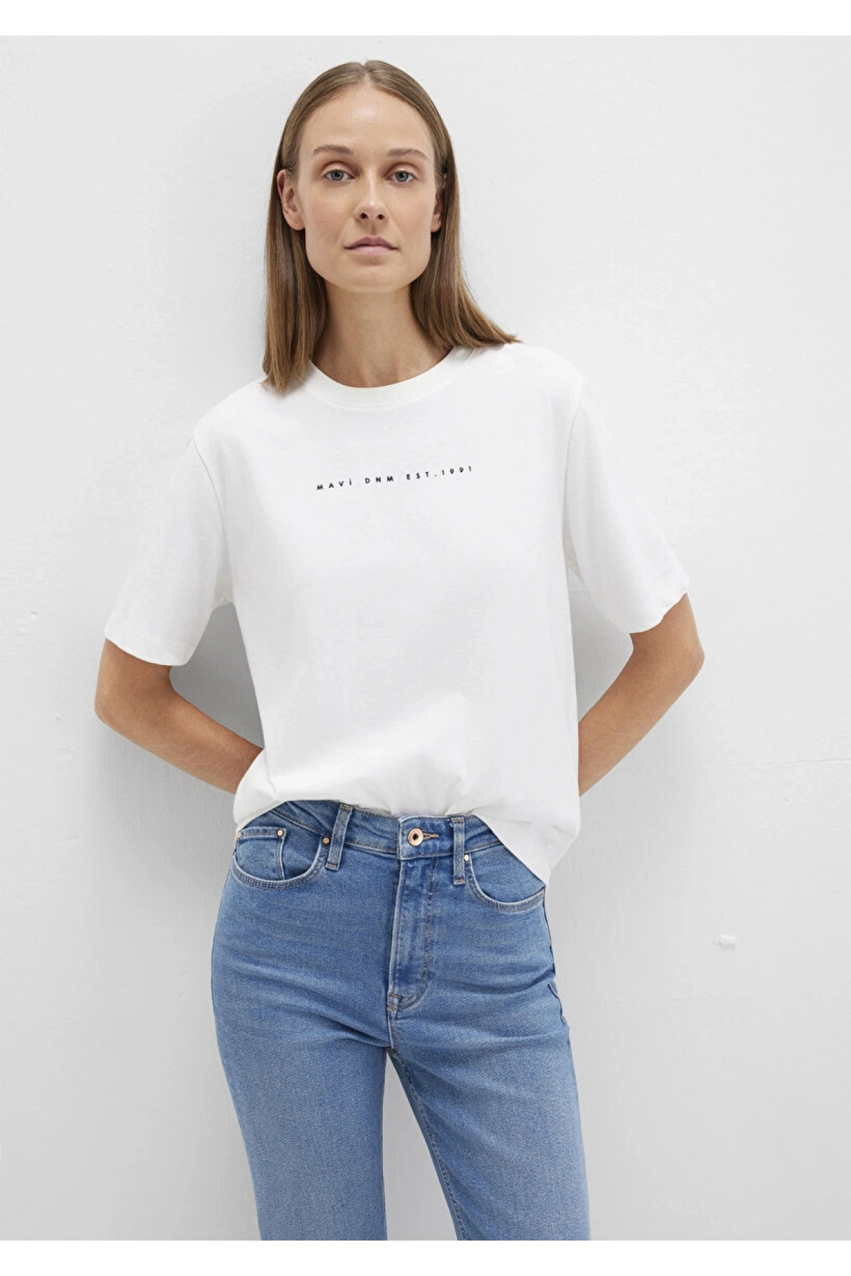 Mavi Baskılı Beyaz Crop Tişört Regular Fit / Normal Kesim