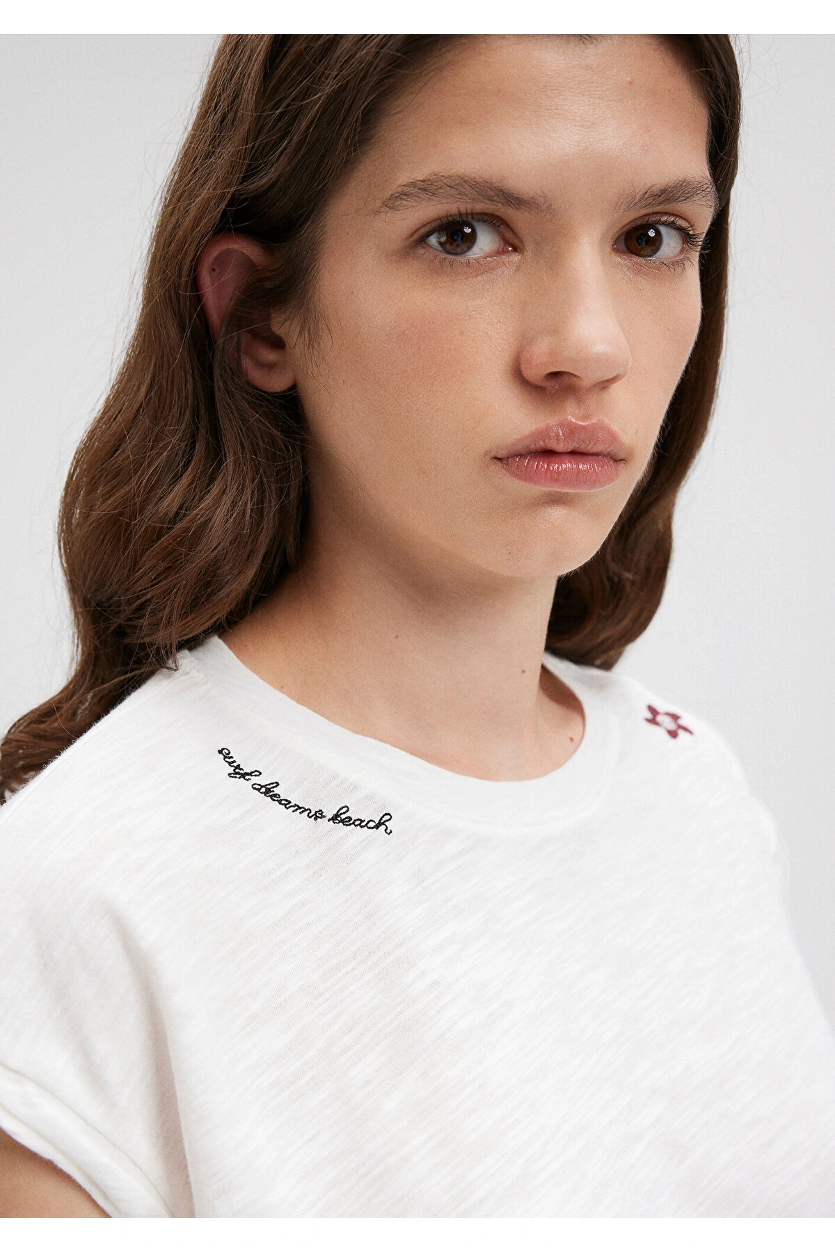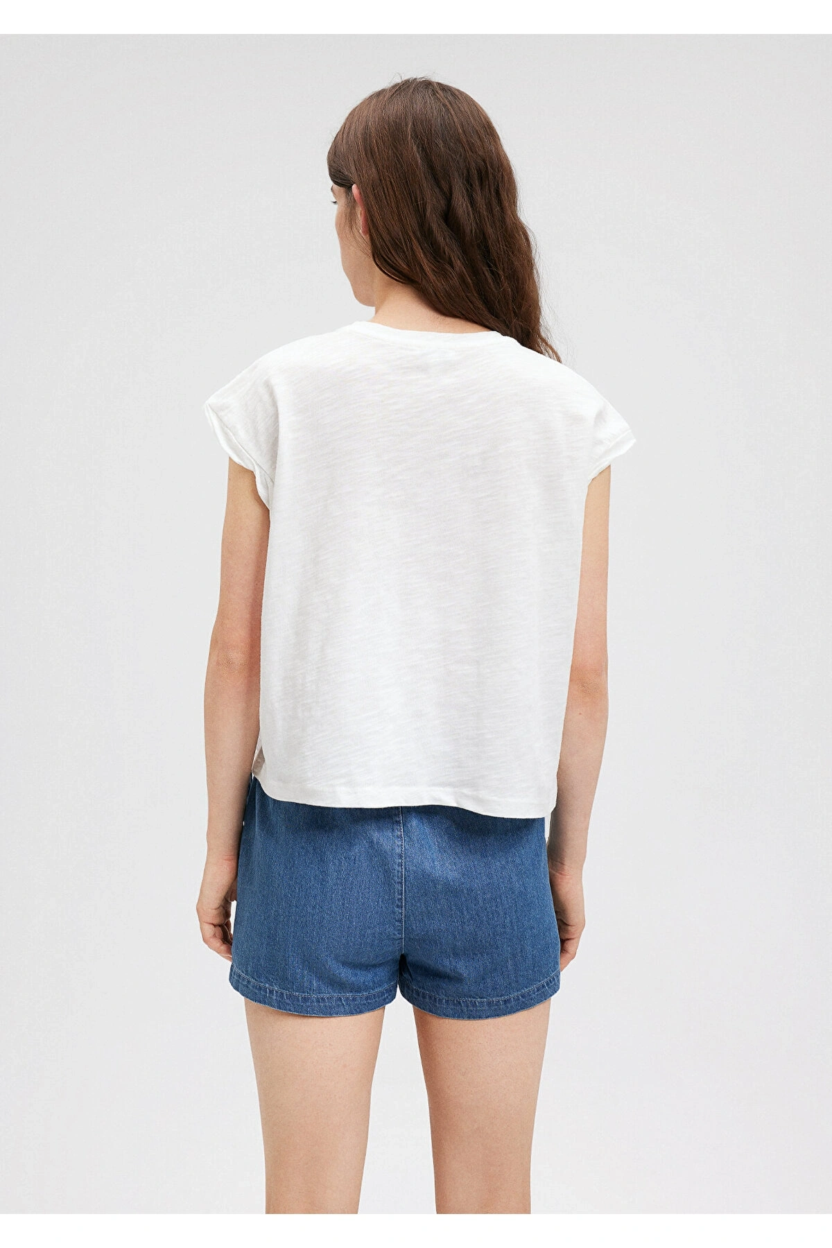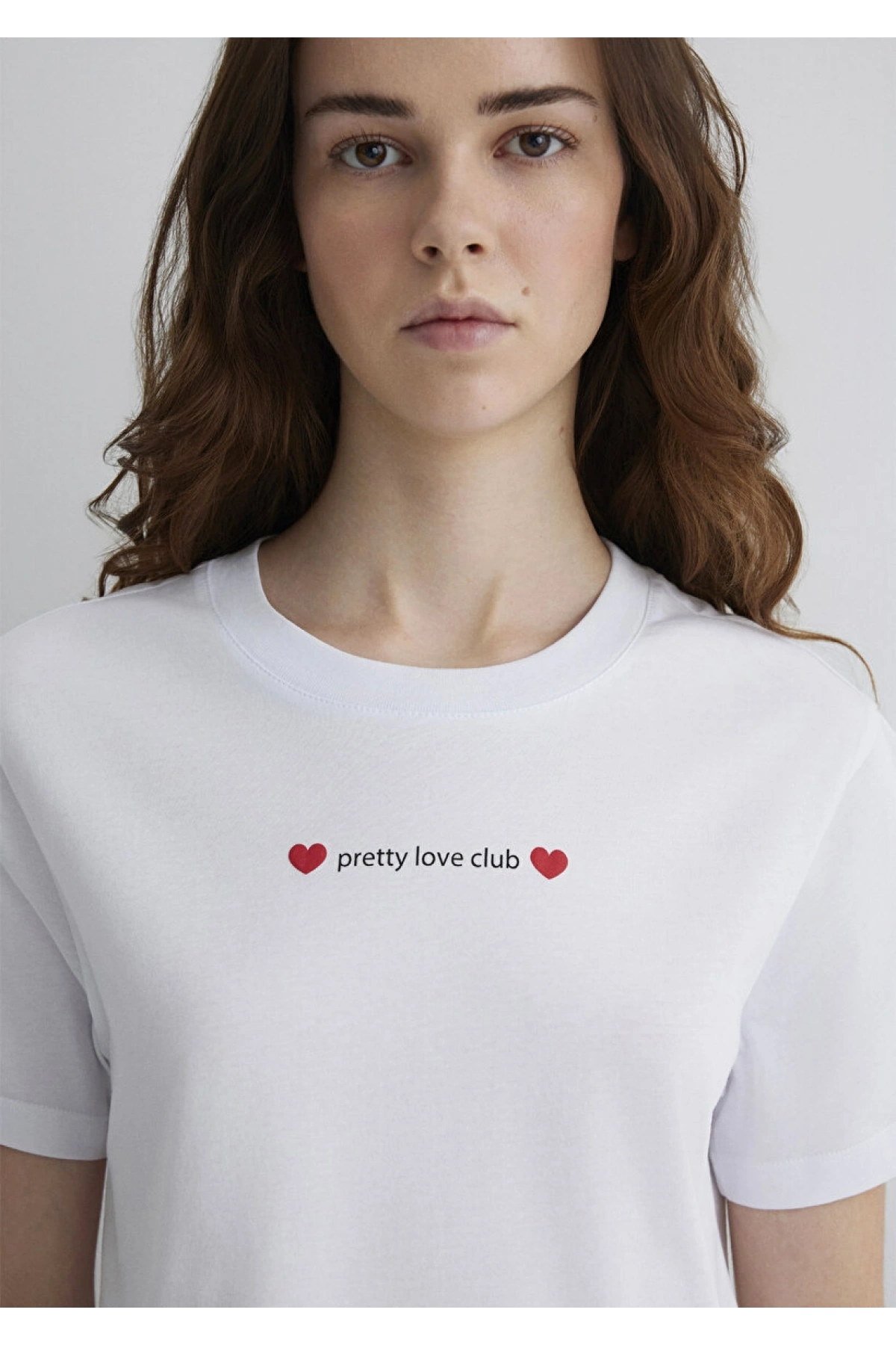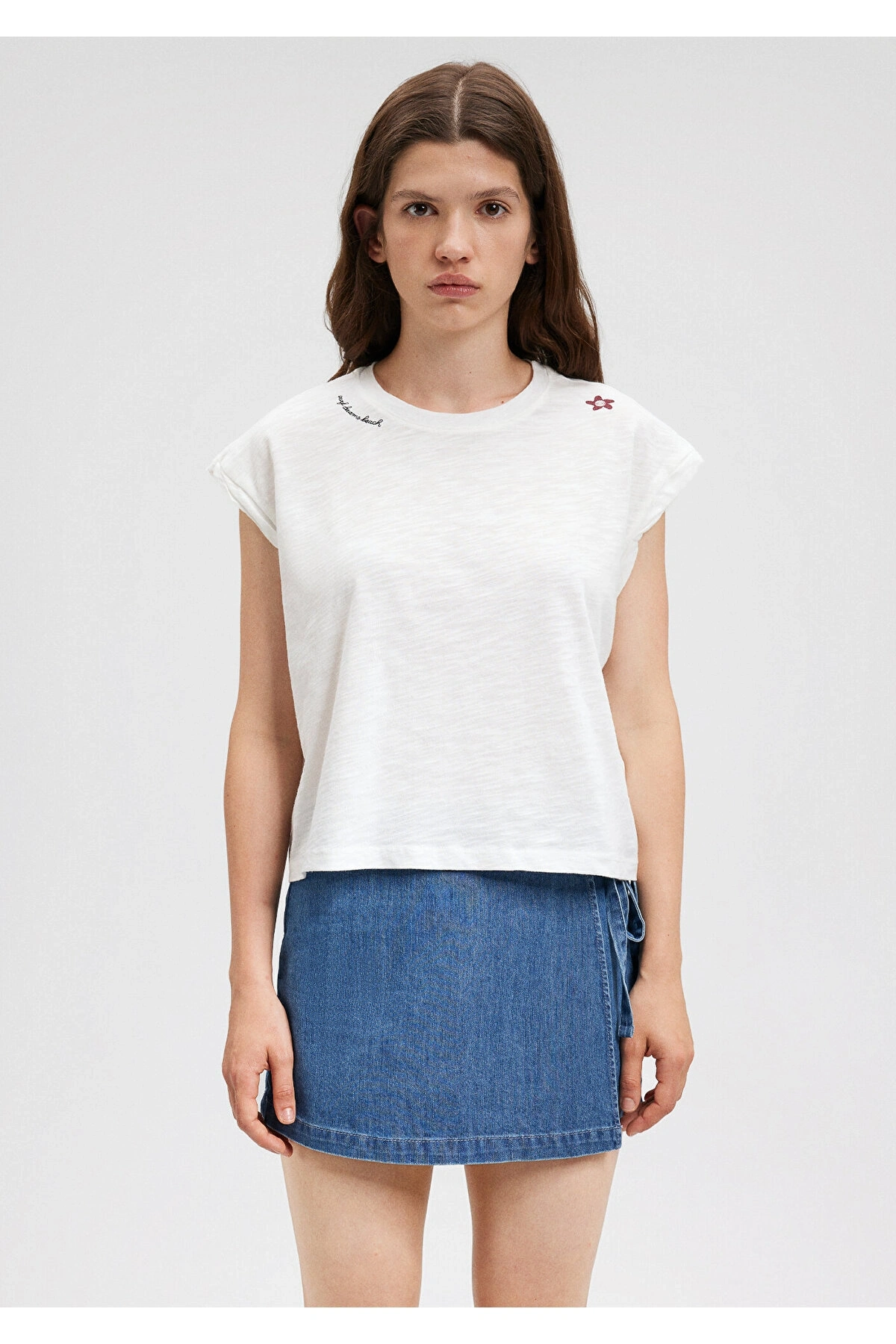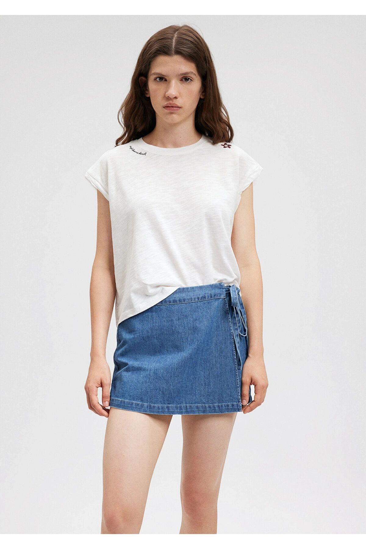 Mavi Baskılı Beyaz Crop Tişört Regular Fit / Normal Kesim