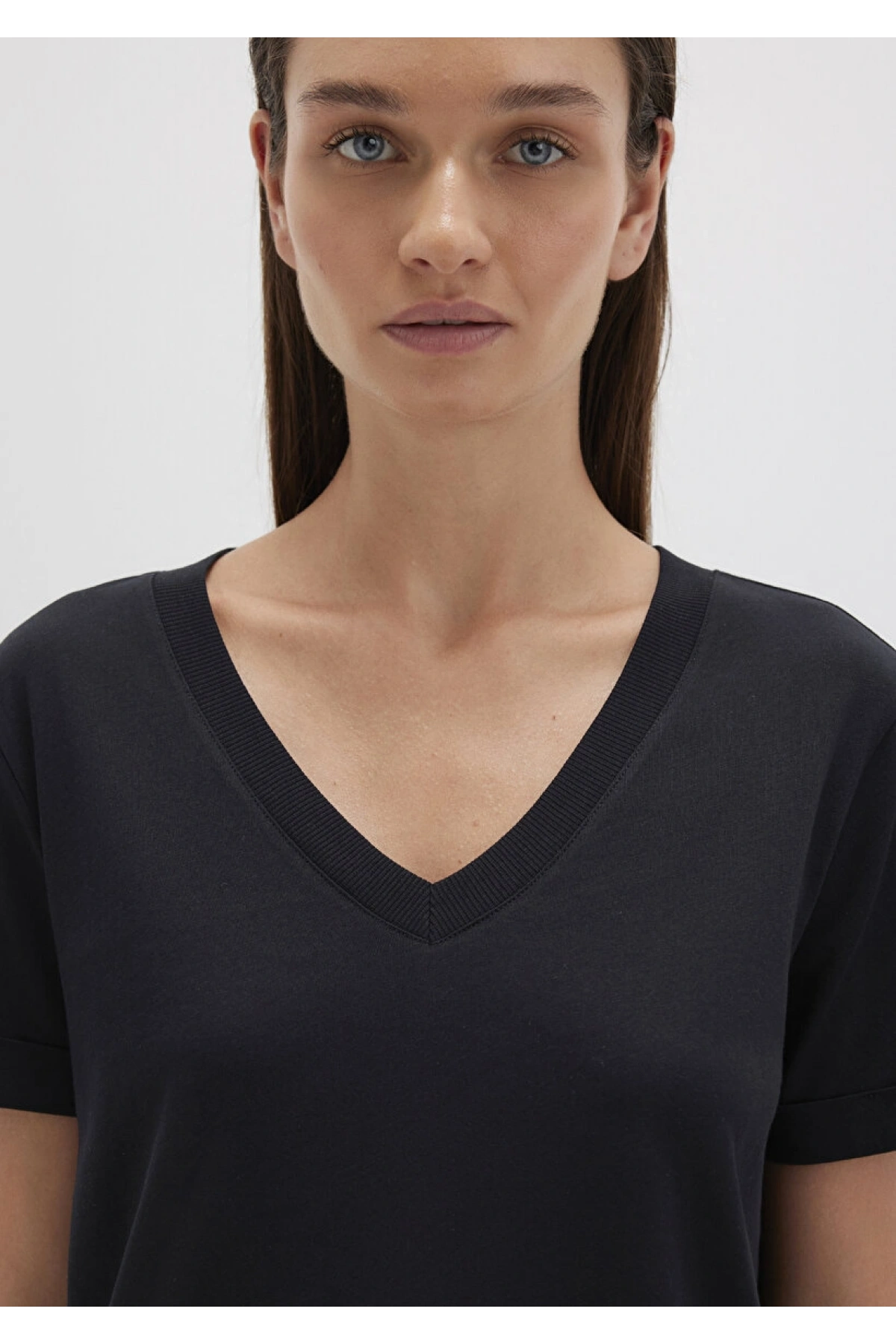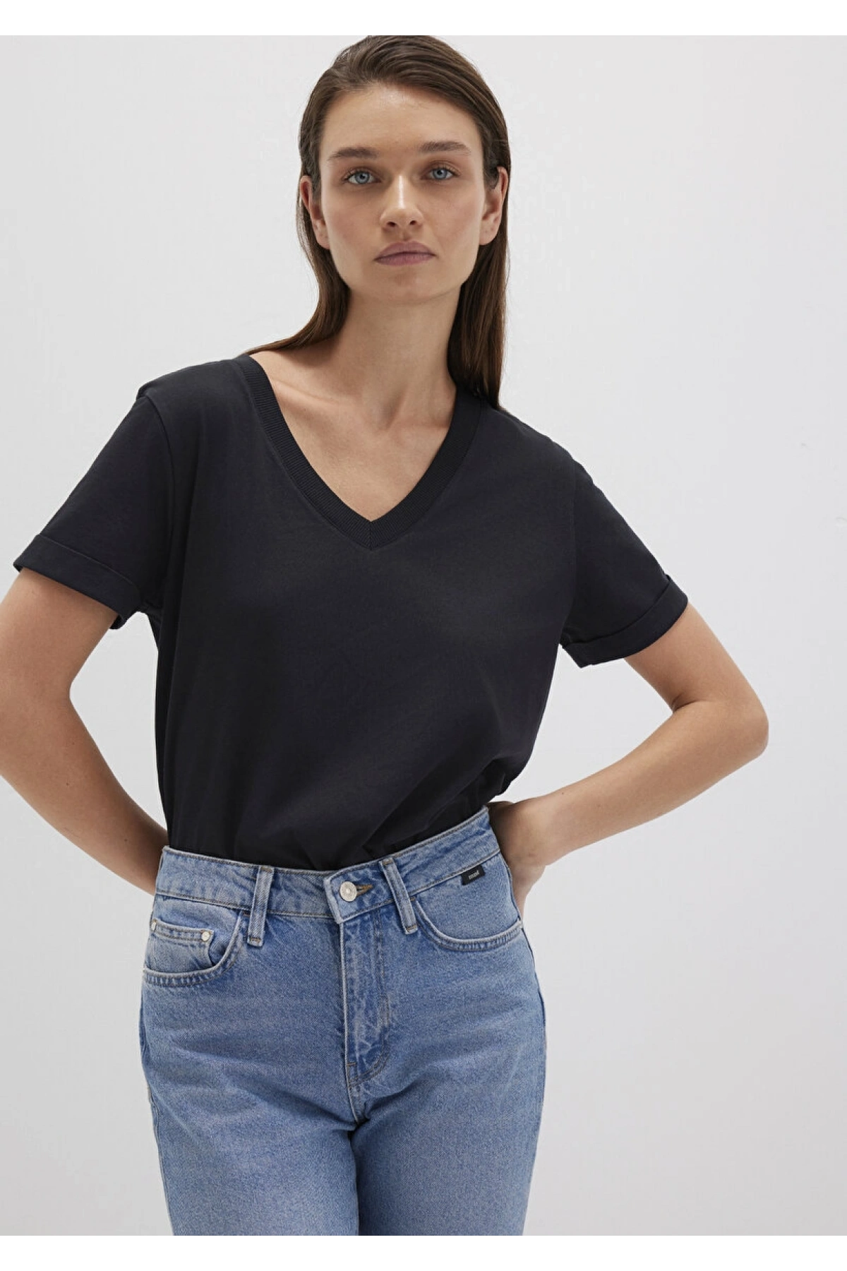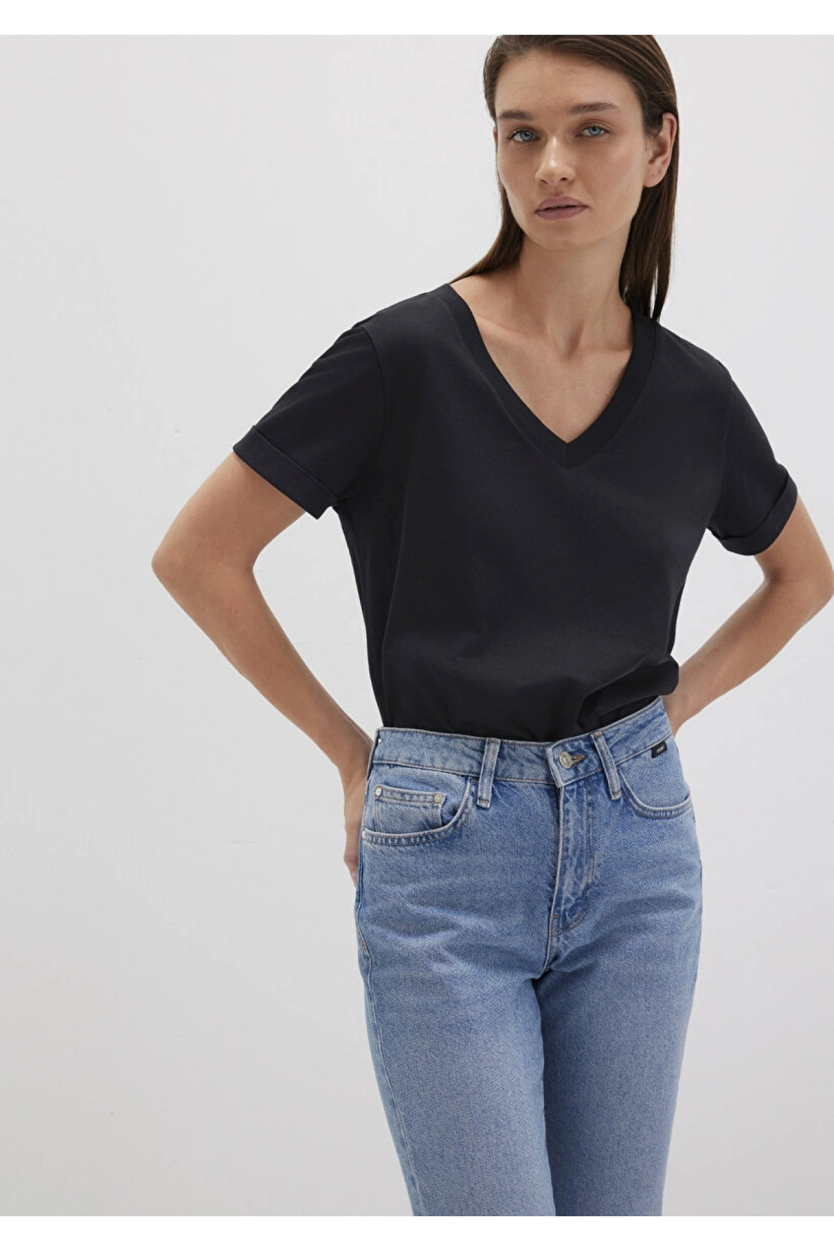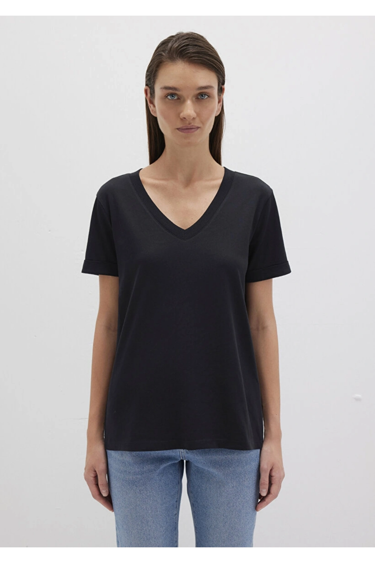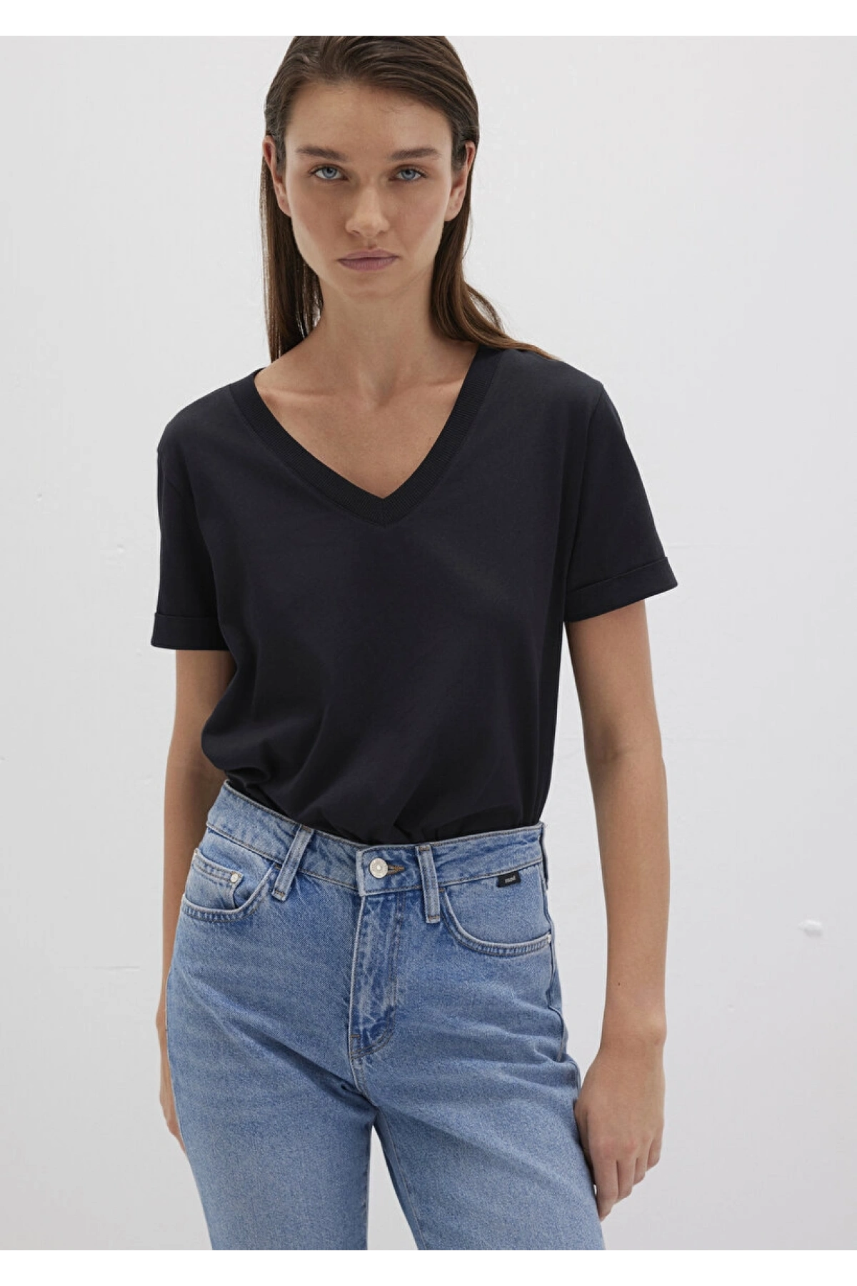 Mavi V Yaka Siyah Basic Tişört Regular Fit / Normal Kesim
