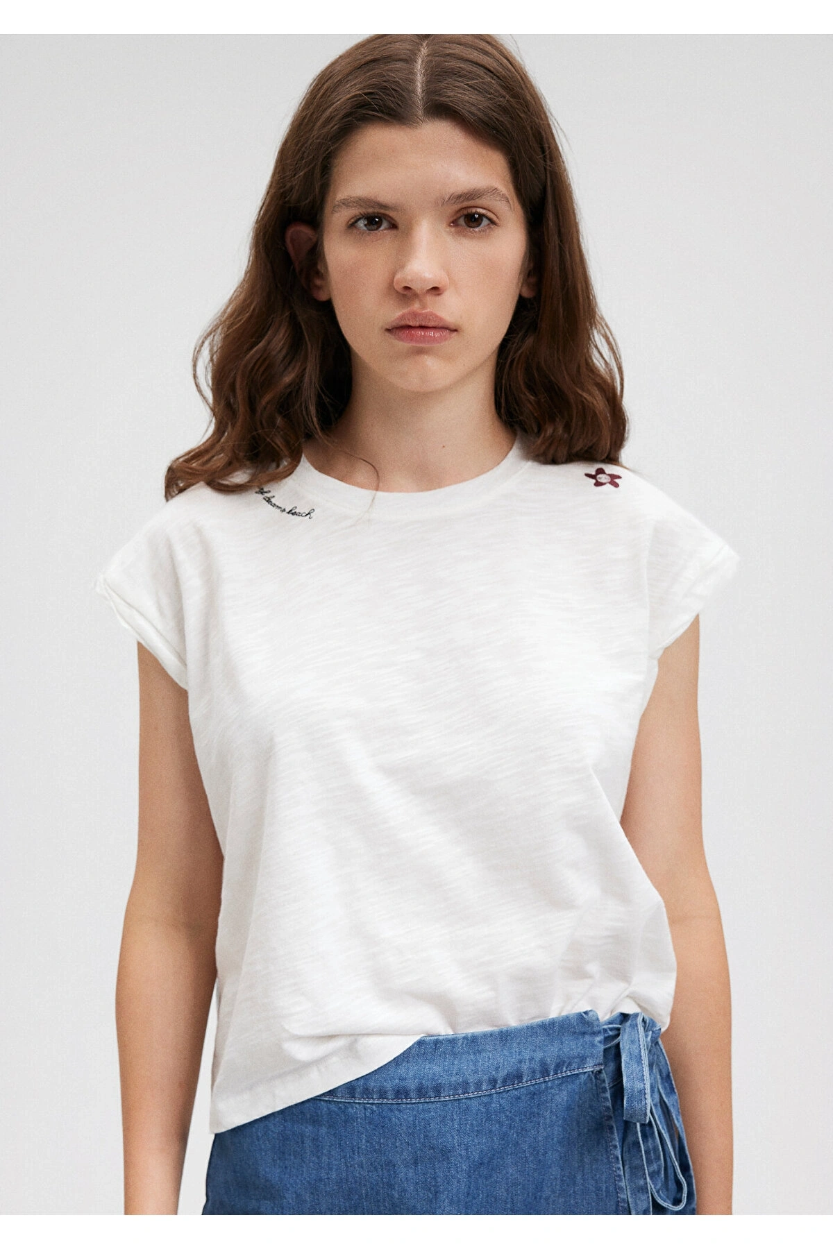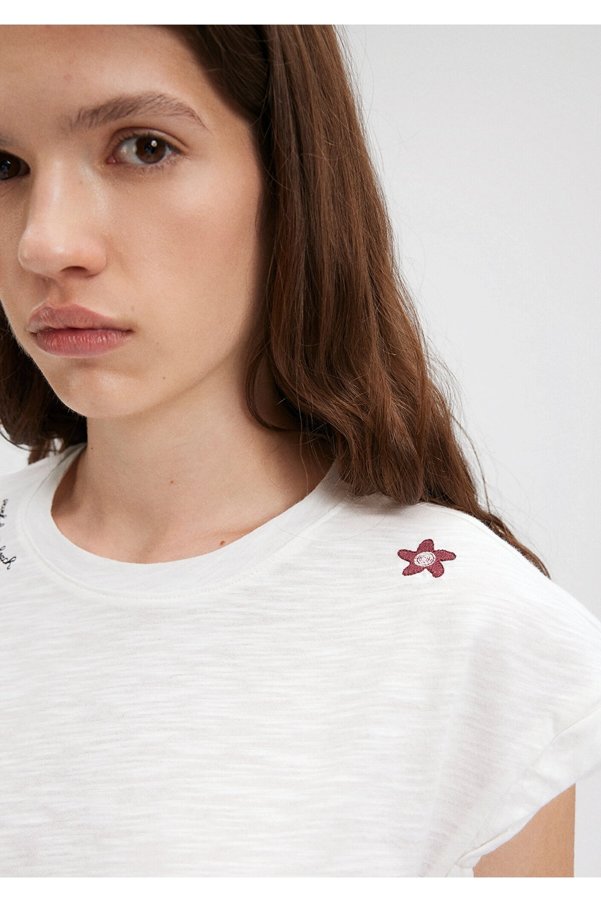 Mavi Nakış Detaylı Beyaz Tişört Loose Fit / Bol Rahat Kesim