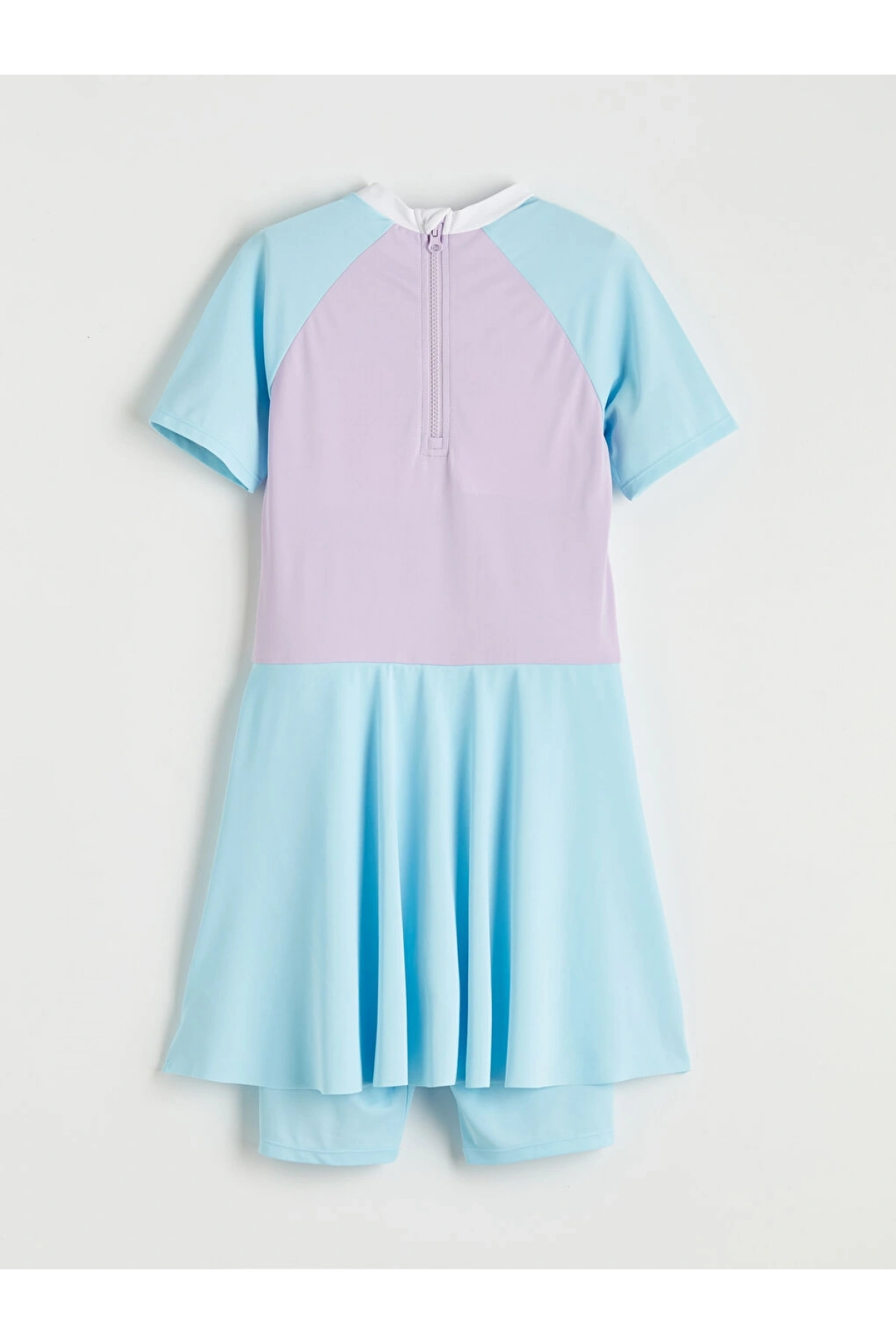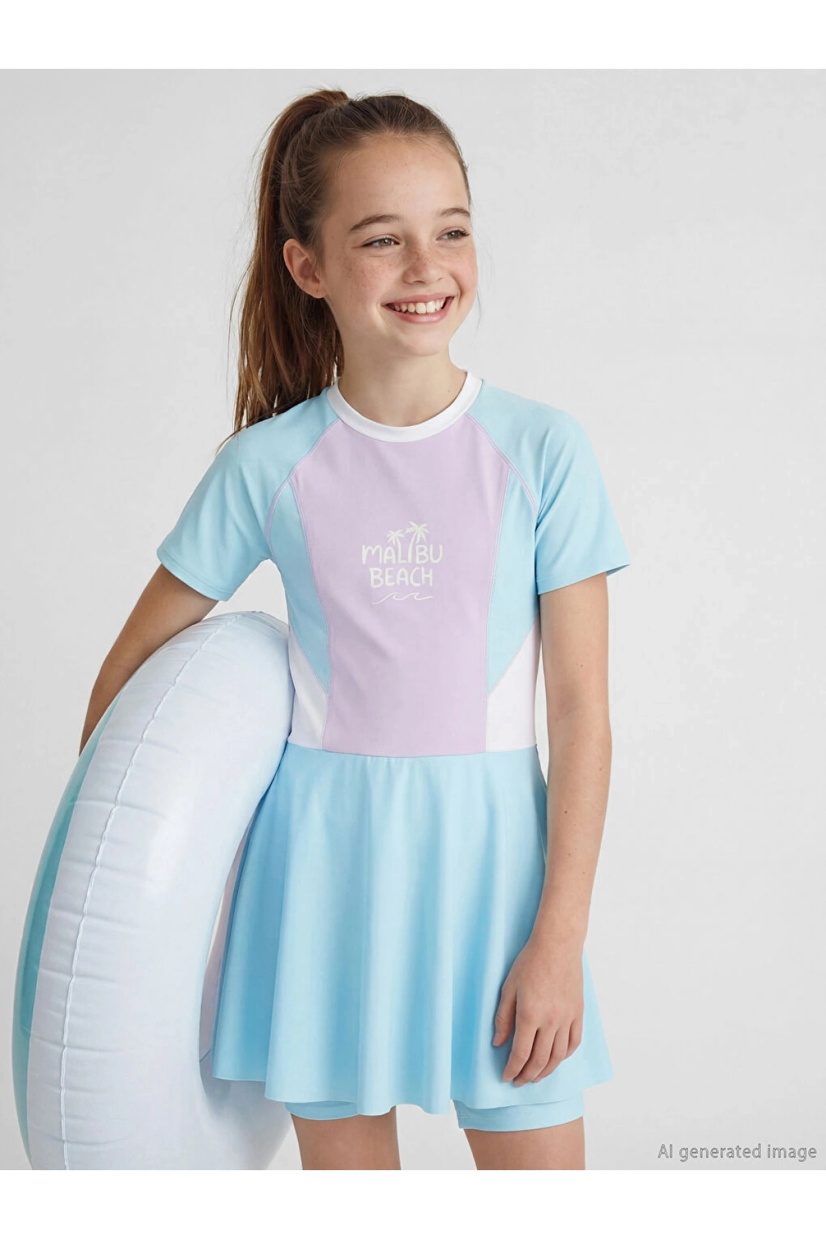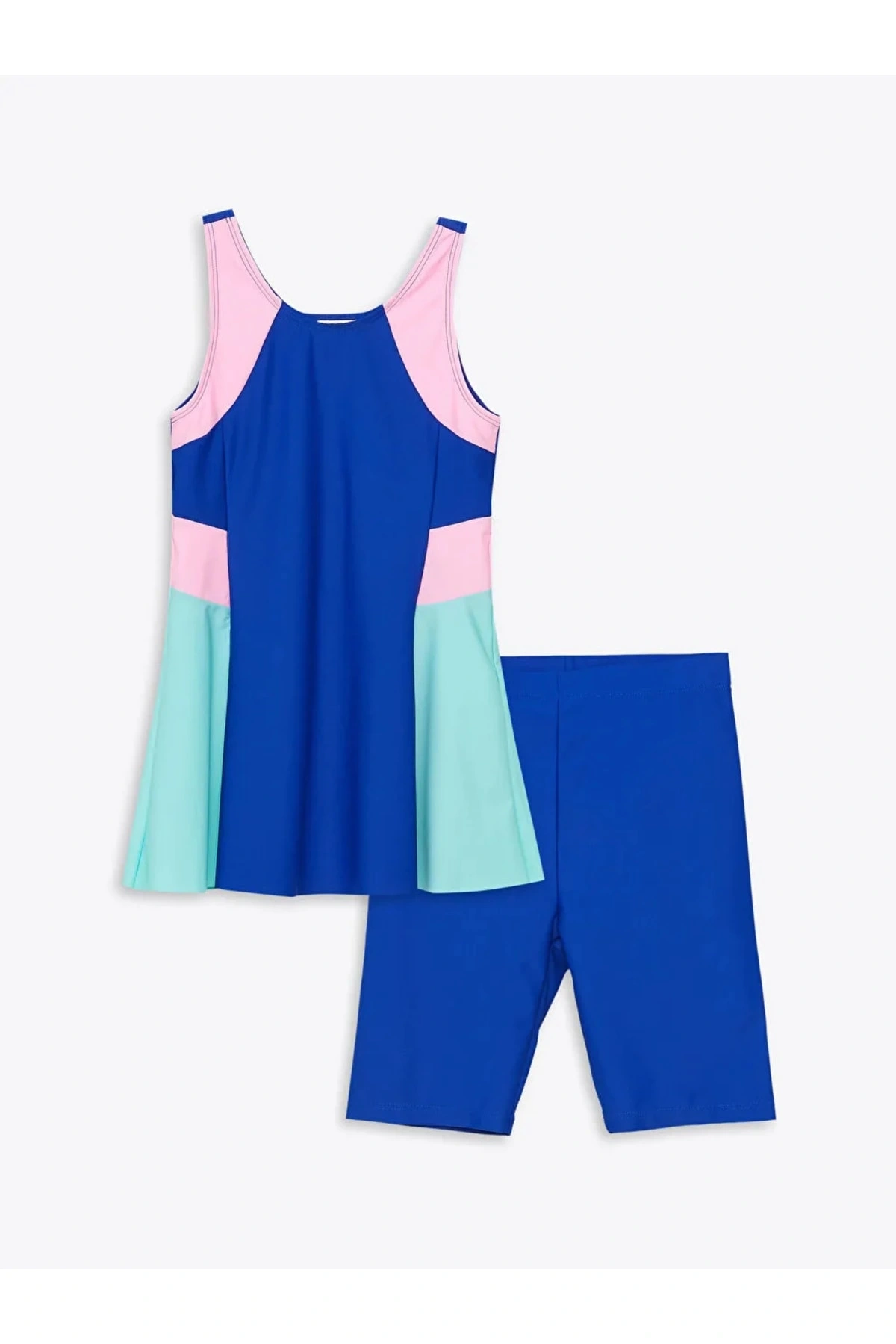 U Yaka Renk Bloklu Kız Çocuk Etekli Mayo Ve Şort