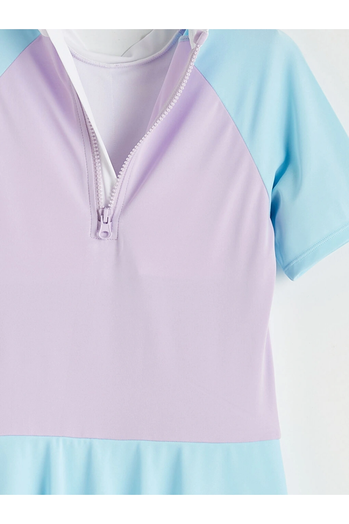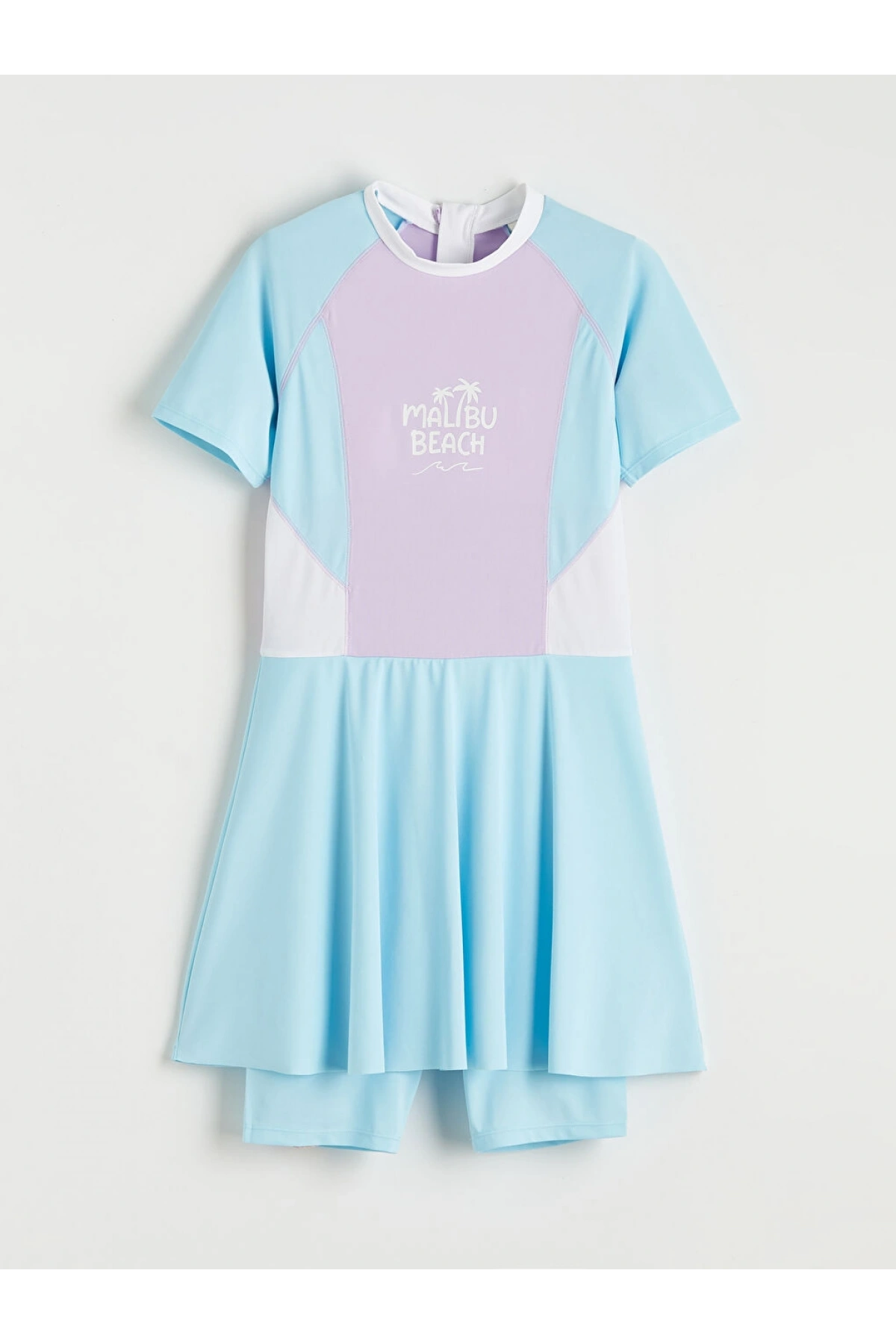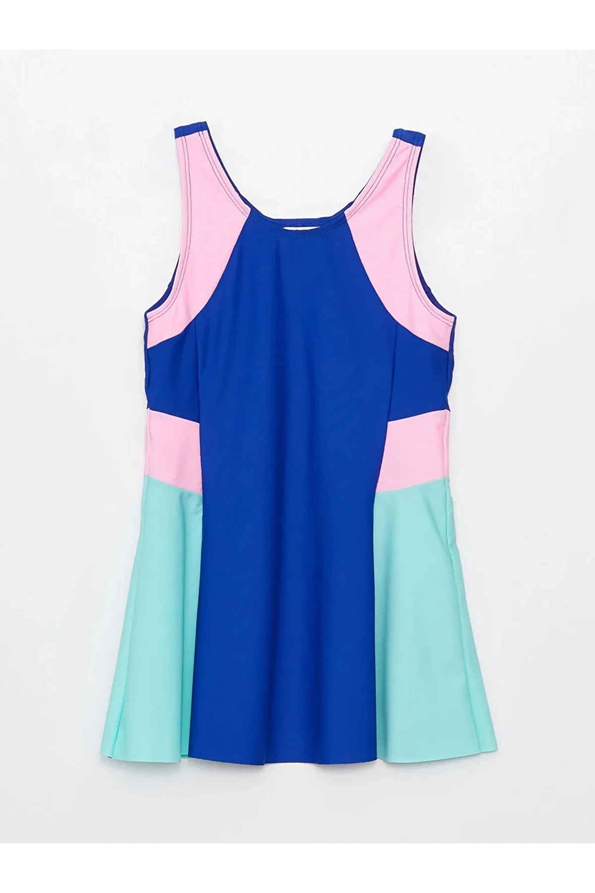 U Yaka Renk Bloklu Kız Çocuk Etekli Mayo Ve Şort