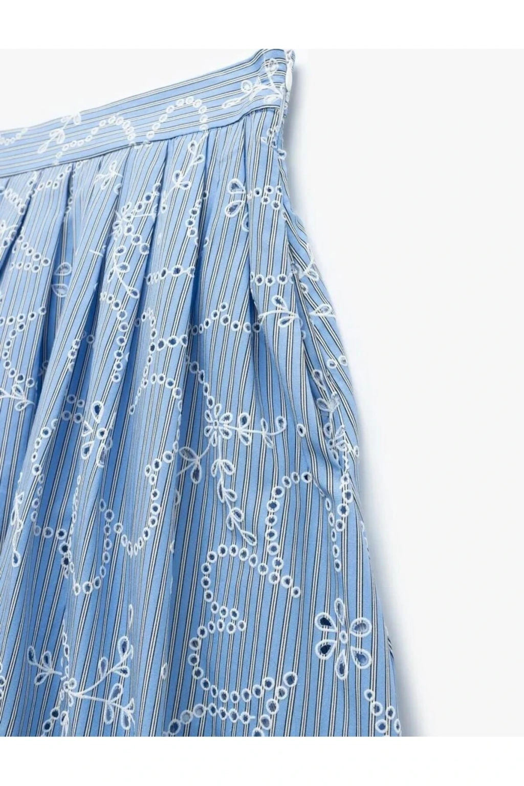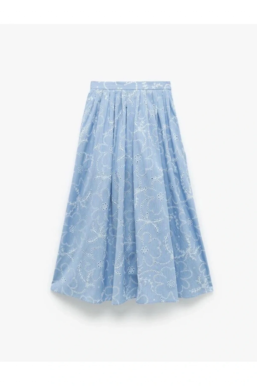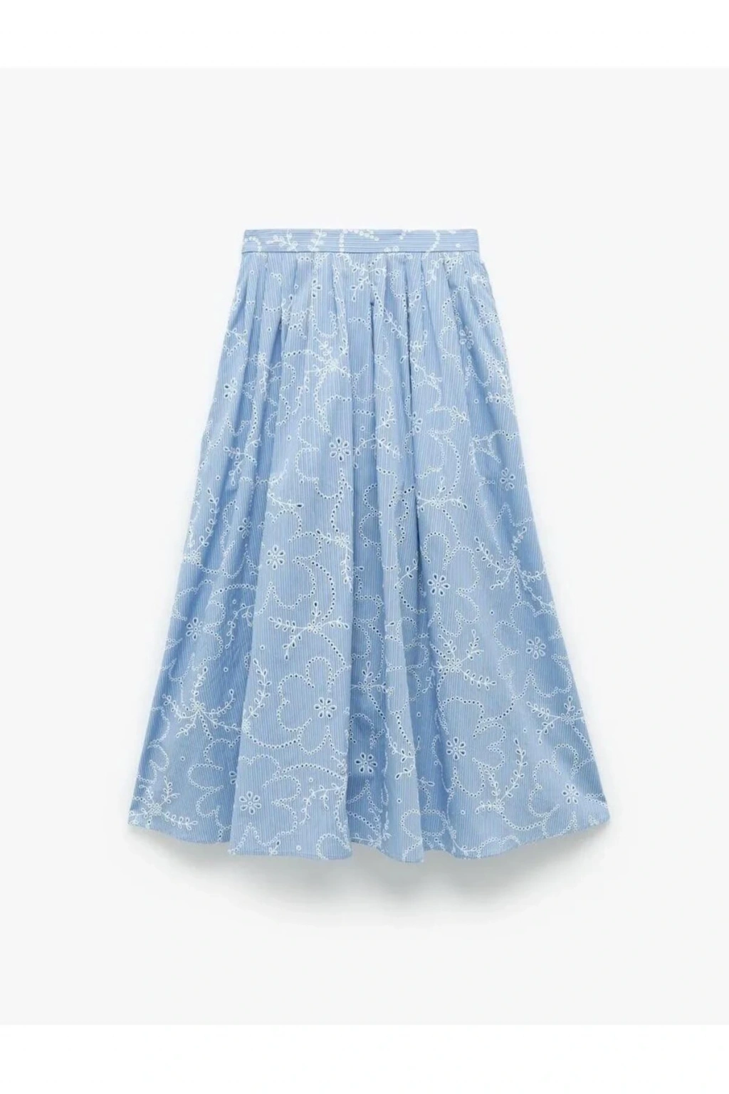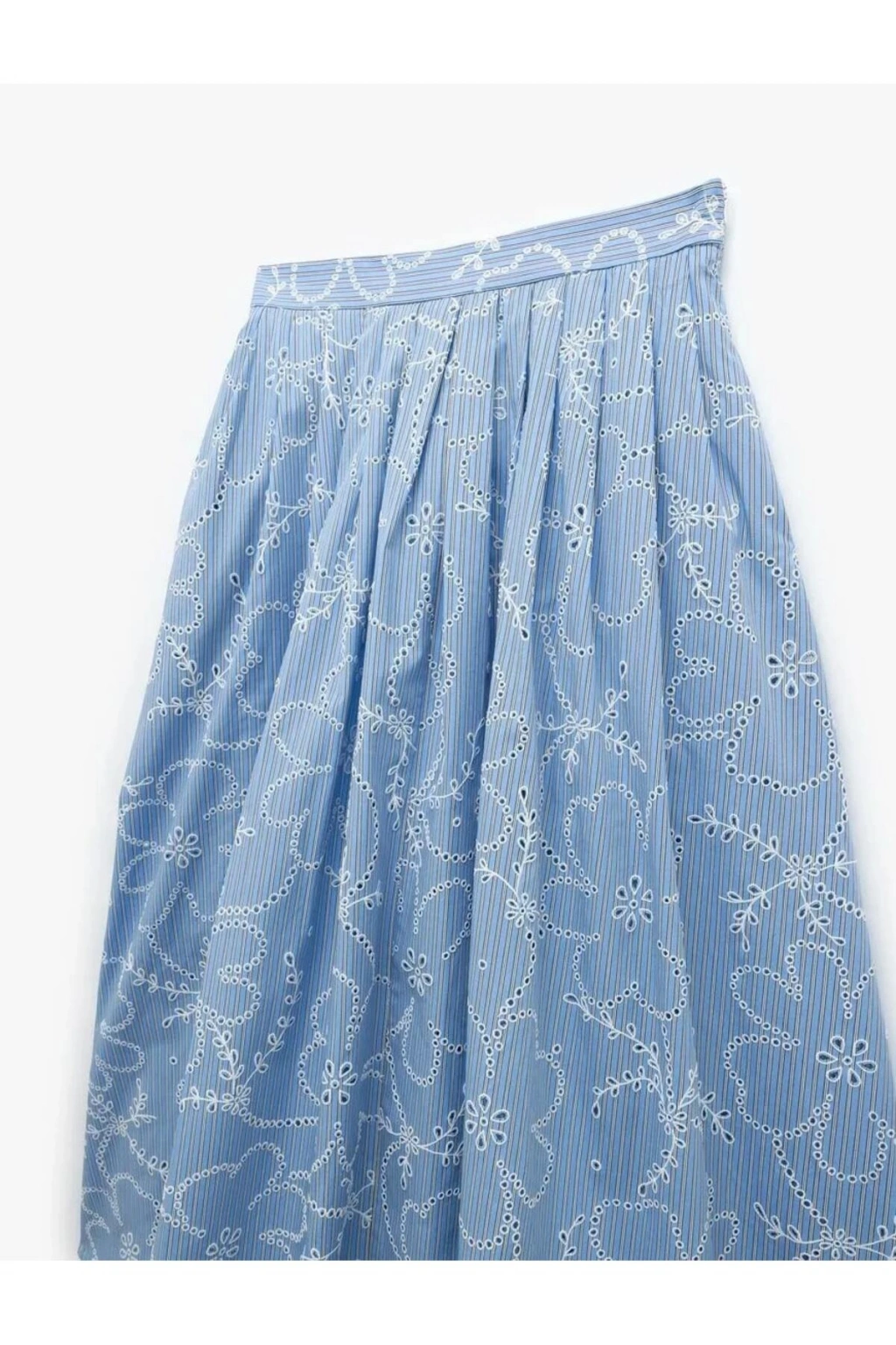 Fistolu kloş etek, zarif brode detaylarıyla dikkat çekiyor. Kloş kesimi ve uzun boyu sayesinde hem klasik hem de modern bir görünüm sunuyor. Yan cepleriyle pratik bir kullanım sağlarken, normal bel yapısı konforu artırıyor. Tam daire silüeti ve nefes alabilir pamuklu kumaşıyla gün boyu rahatlıkla kullanılıyor.