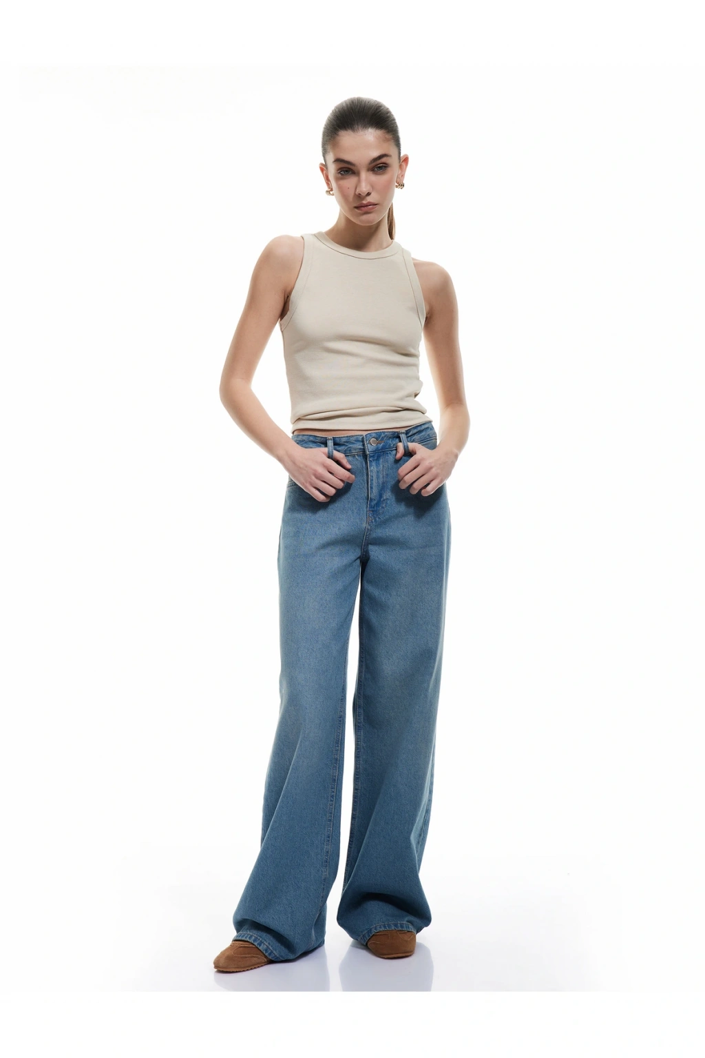 Bu denim pantolon, stil sahibi kadınlar için gardıroplarında çok yönlü bir seçenek oluşturuyor. Jean'in geniş kalıbı hareket özgürlüğü sağladığı gibi trendleri yakalayan bir duruş sergiliyor. Geniş paça tasarımı sayesinde hem günlük hayatta hem de özel davetlerde rahatlıkla tercih edilebiliyor.