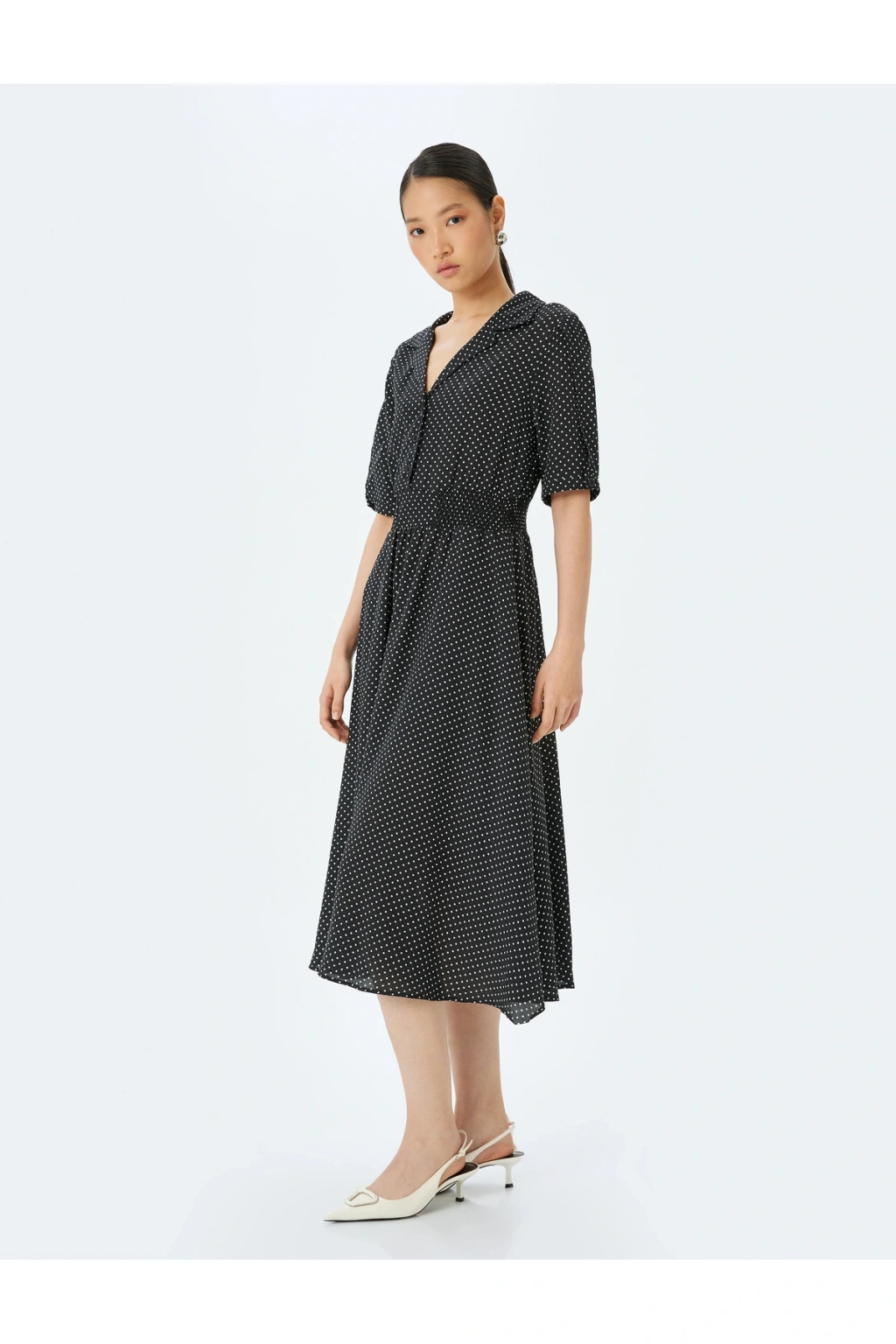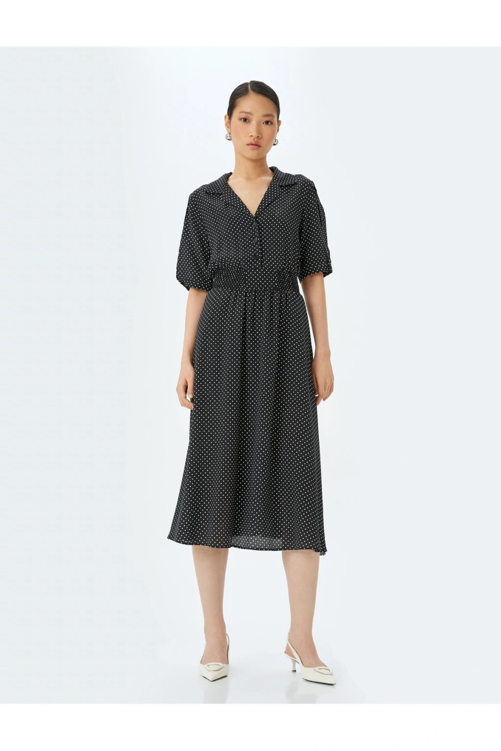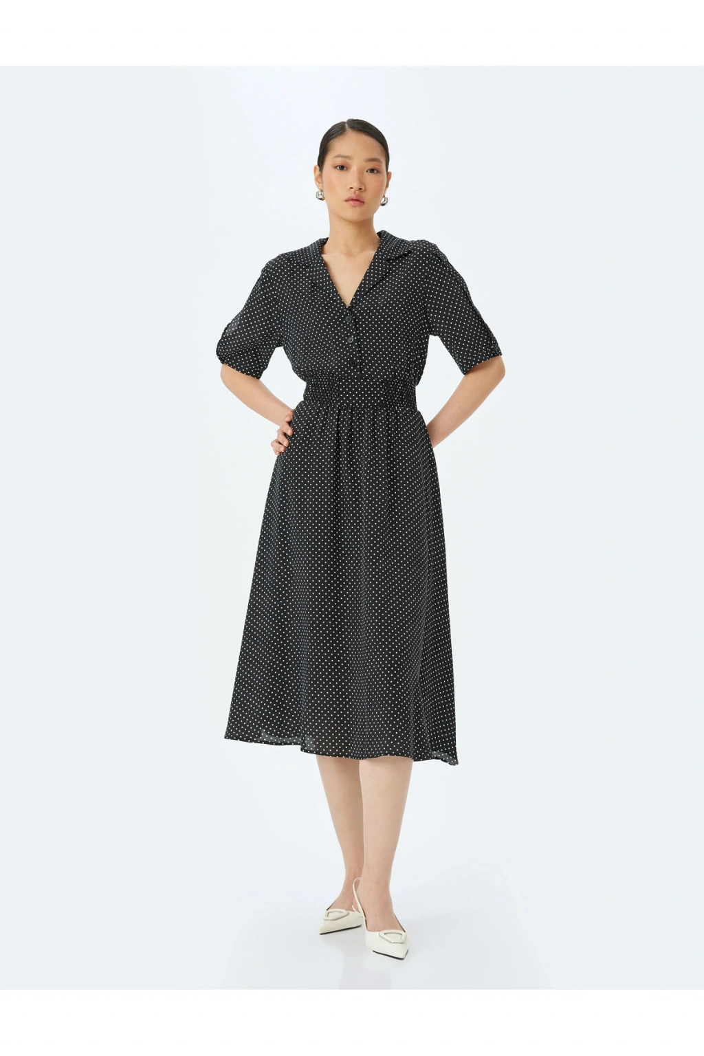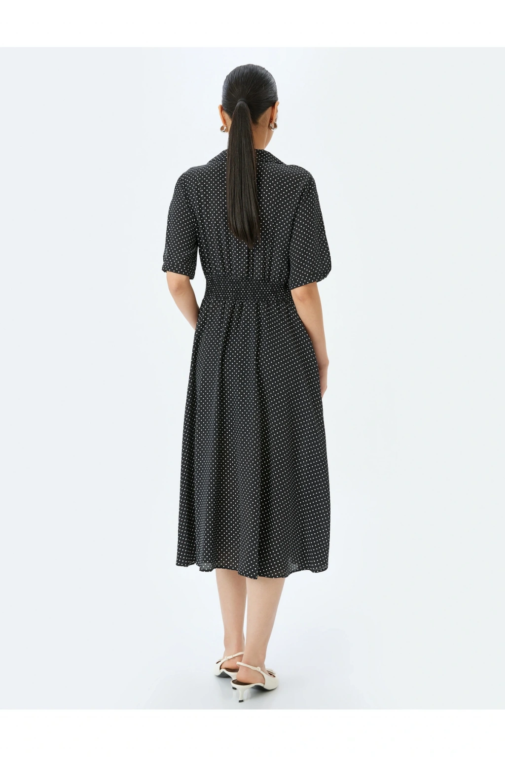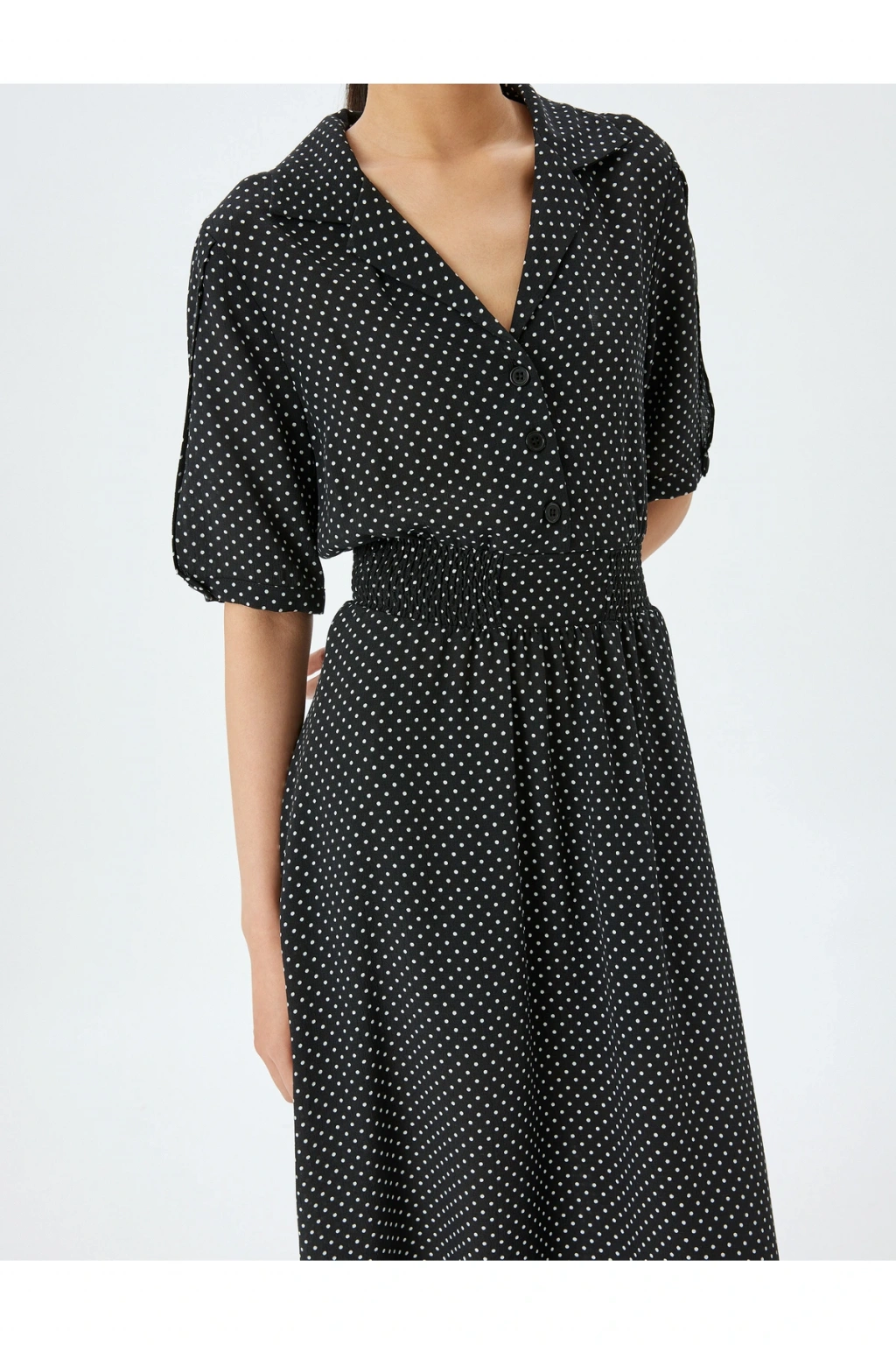 Polka dot patterned shirt collar short sleeve midi viscose dress.; | Model Boy: 176 | Model Kalça: 90 | Model Üst: 61 | Model Bel: S | Model Göğüs: 80 | Model Jean: 27/32