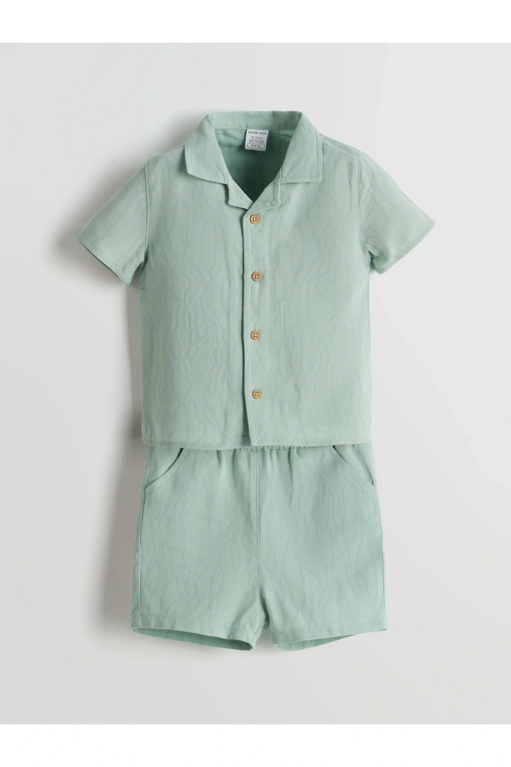 Resort yaka erkek bebek gömlek ve şort 2’li set, penye kumaşıyla yumuşak ve rahat bir kullanım sunar.; Lastikli bel yapısıyla şort, hareket özgürlüğü sağlar.; Şirin tasarımıyla yaz ayları için ideal bir tercih.